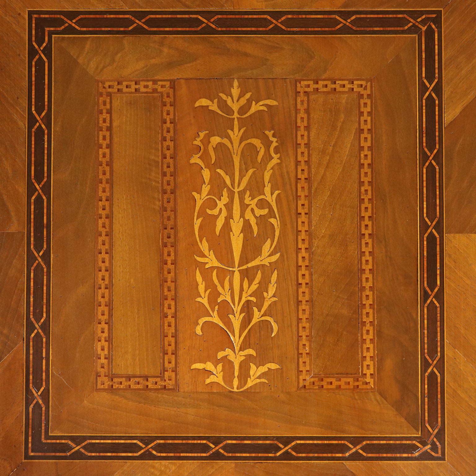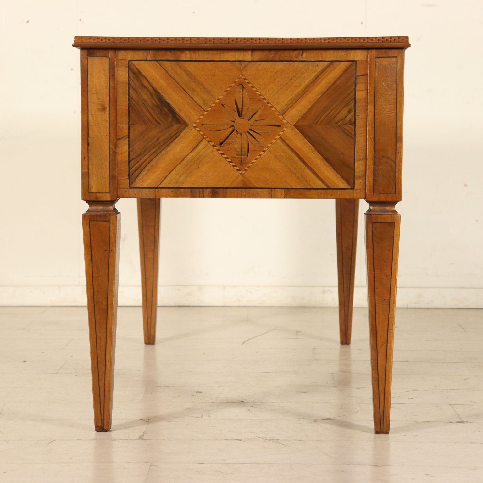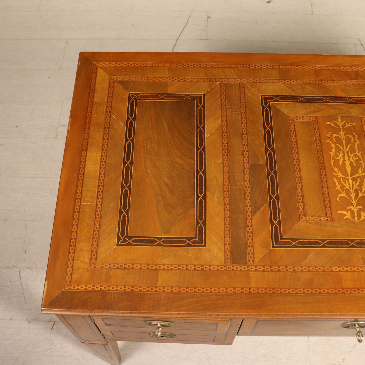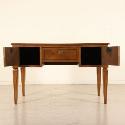 Escritorio desde el centro de la recta de las piernas, tronco-piramidal, tiene dos puertas y un centro de cajón. Ricamente con incrustaciones.