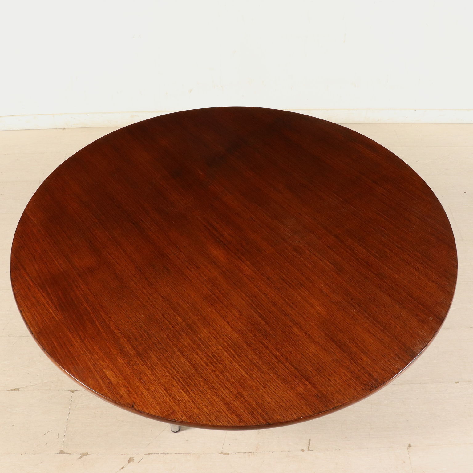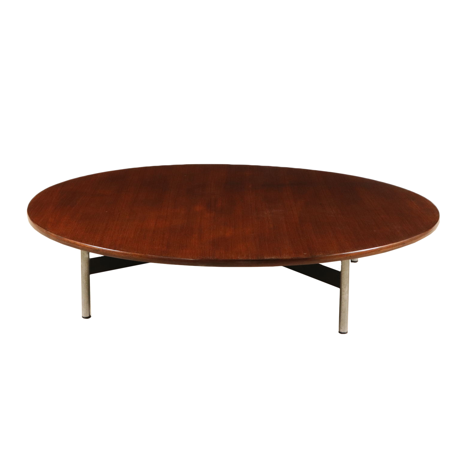 Mesa de centro de madera chapada en madera de teca, patas de metal.