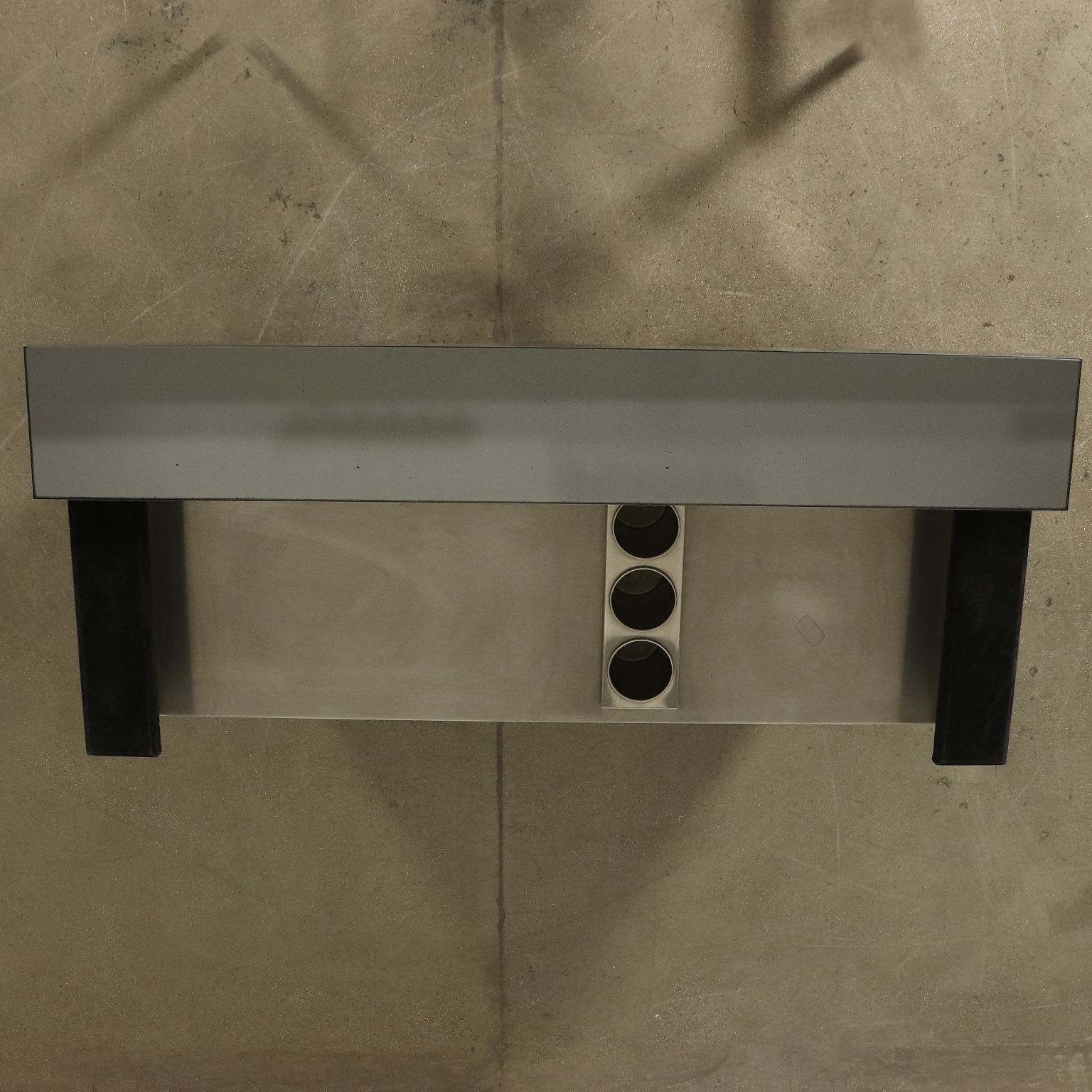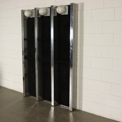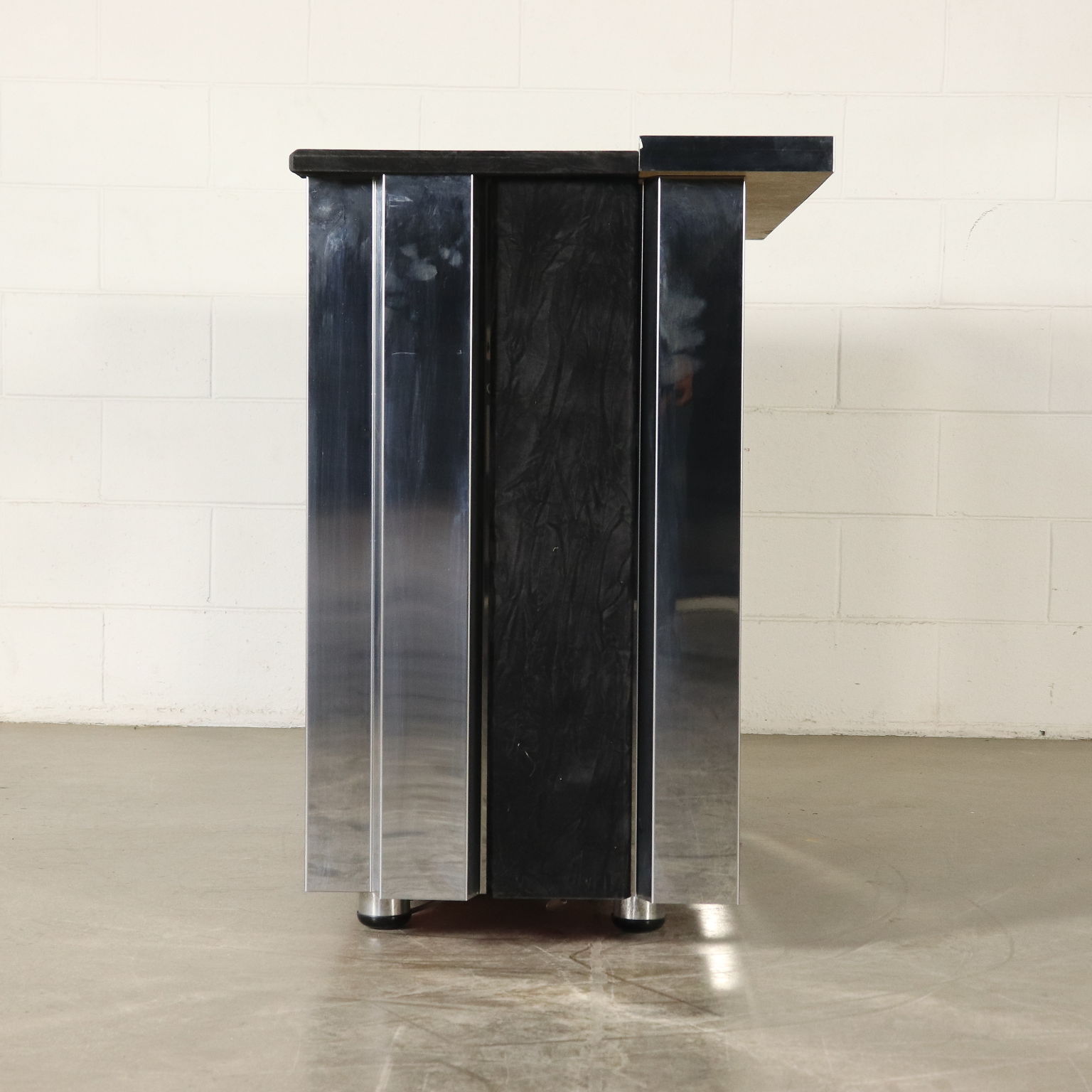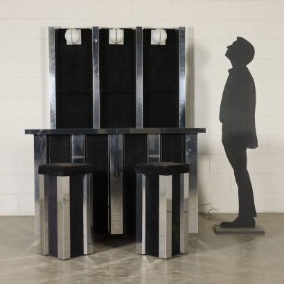 Móvil con la barra de la parte inferior del panel, el contador con la nevera de trabajo; un compartimento para botellas, un par de taburetes. Madera, forrados en tela, metal cromado.