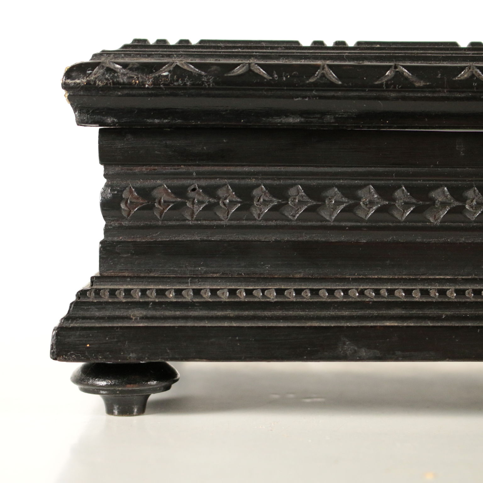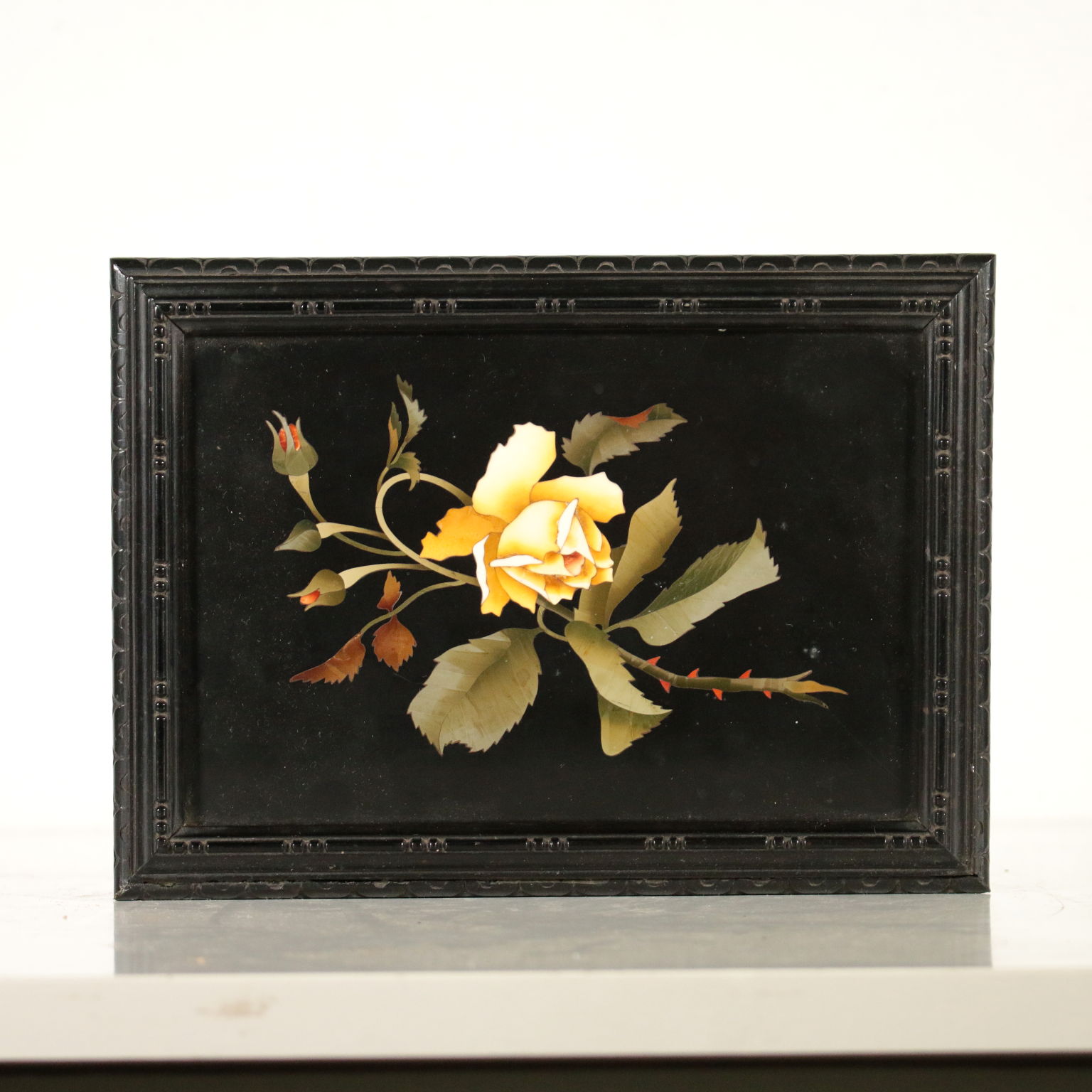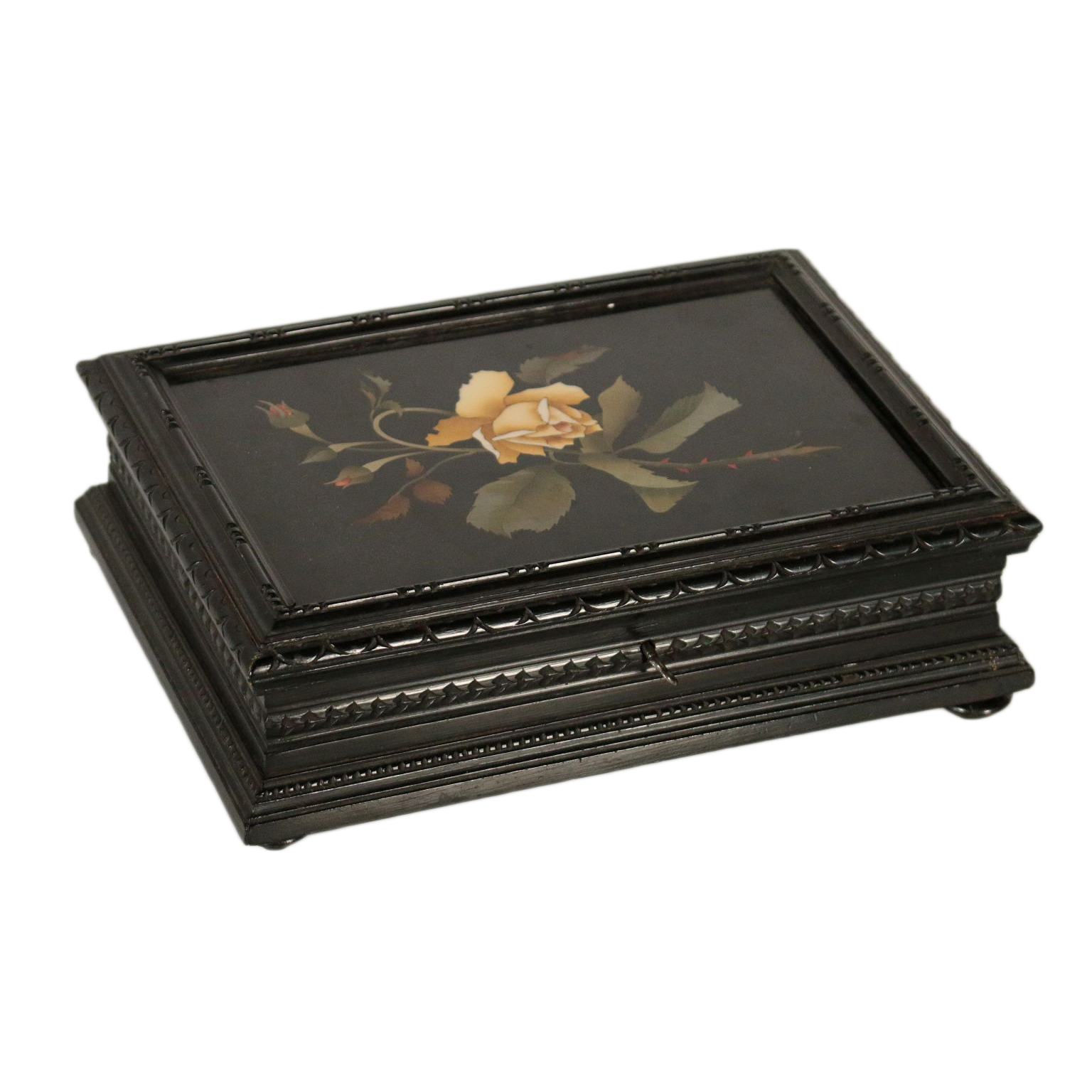 Caja de madera con ebonised decoración y el griego son finamente talladas. Cubrir con la placa de forjado en piedras semi-preciosas, que representan un ramo de rosas.