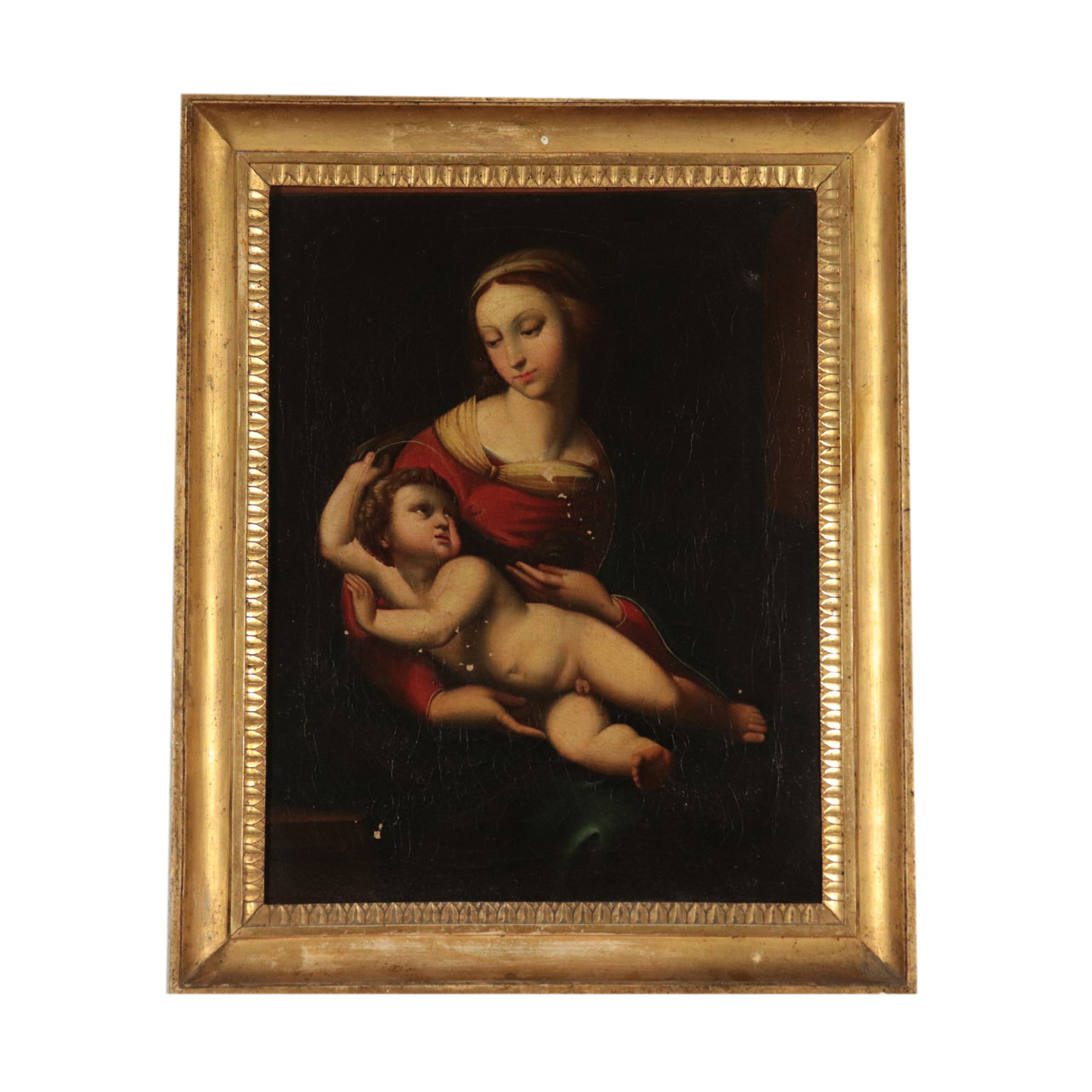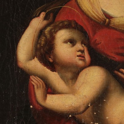 Óleo sobre lienzo. Es un siglo xix copia del famoso cuadro de Rafael, la "Virgen de Bridgewater",óleo sobre madera, 1507, hoy conservada en la Galería Nacional de Escocia, Edimburgo. Fieles a la obra original, en la que se propone el particular posturas de las dos figuras, que se caracteriza por un movimiento opuesto y divergentes, con un cúmulo de gestos (los brazos de el Niño va a tomar el velo de la madre, las manos de María, que rozar el cuerpo del hijo) que genera un movimiento de la bobina. Un par de gotas de color, especialmente en la parte central, que requieren restauración. El trabajo se presenta en un marco dorado coetáneas.