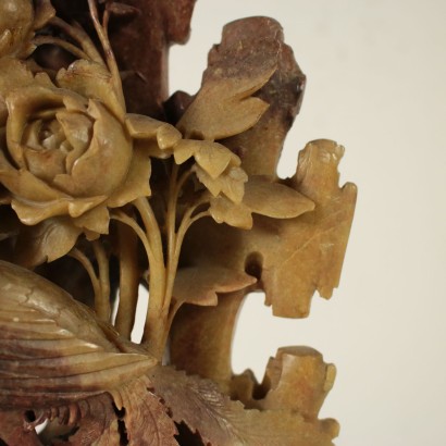 La escultura en piedra jabón tallado con peonías y un fénix.