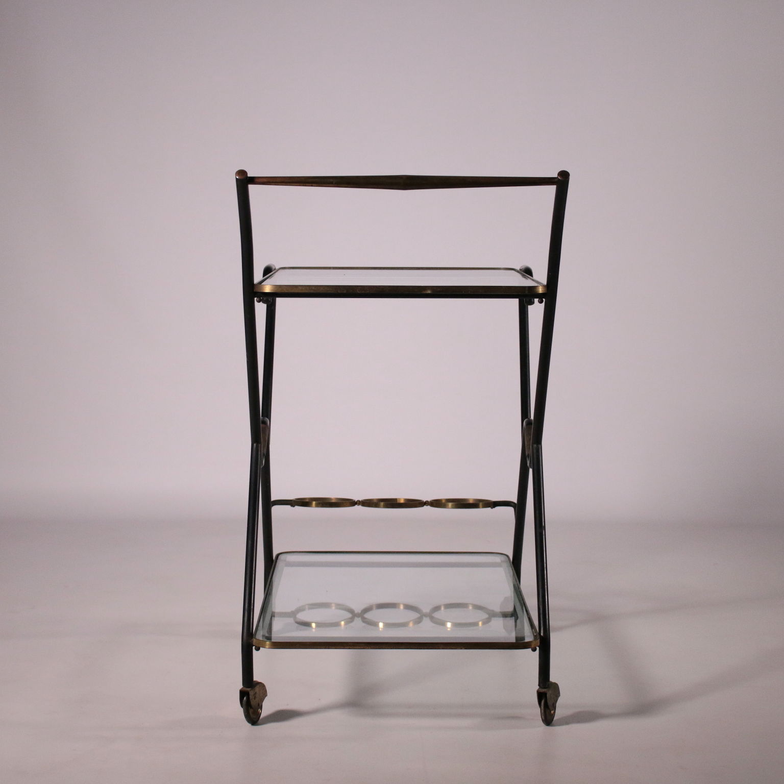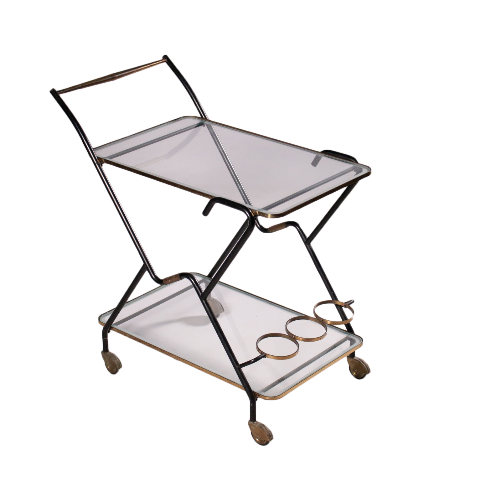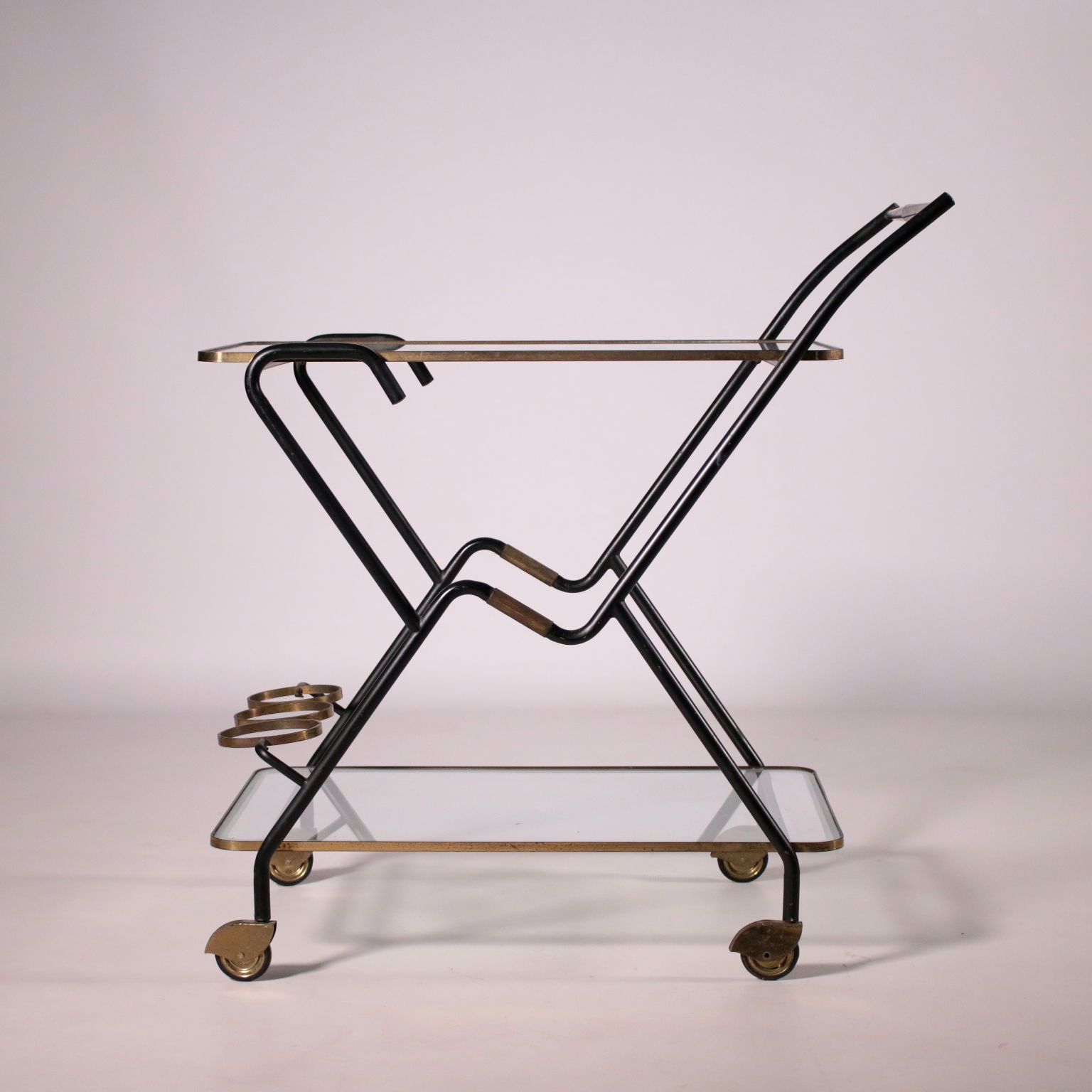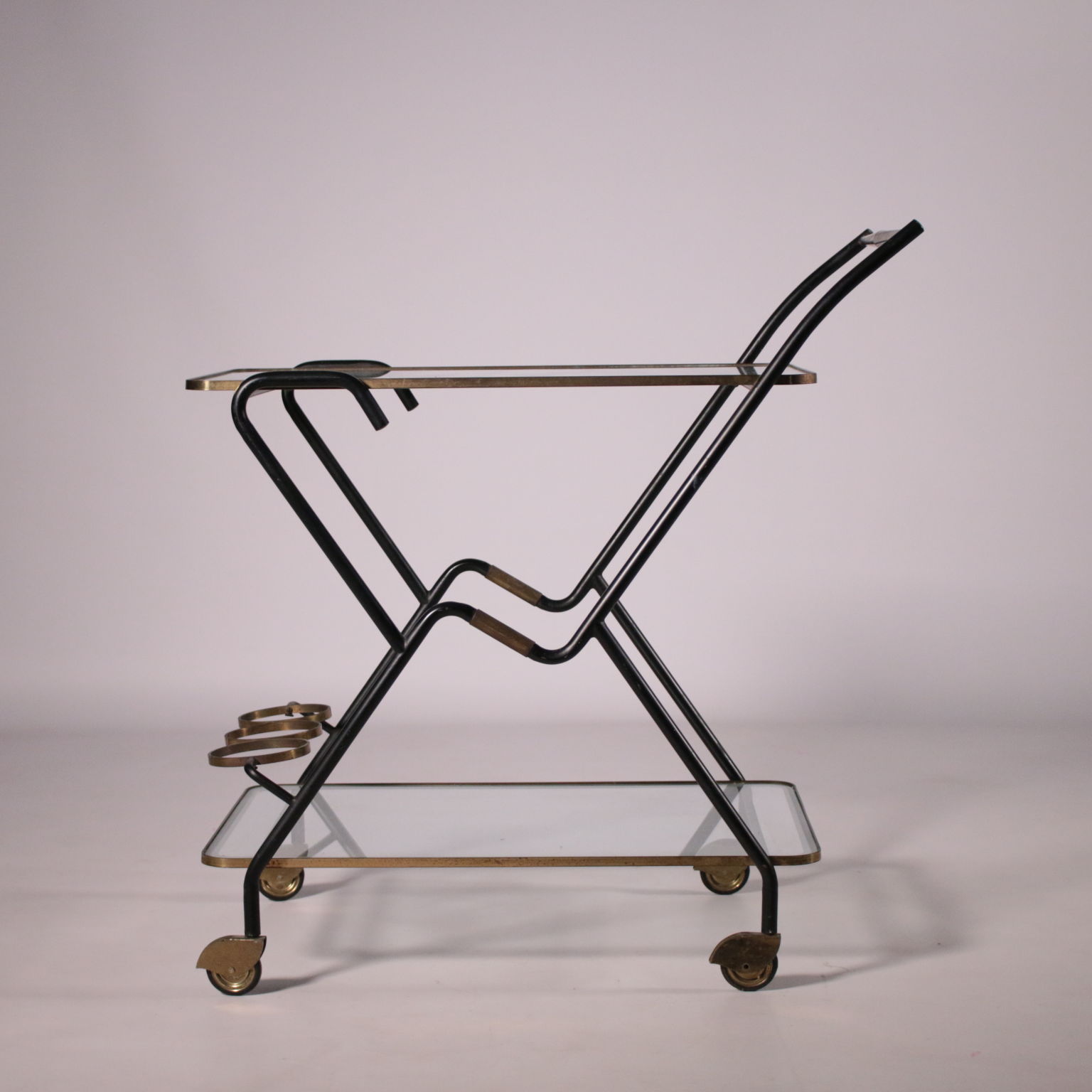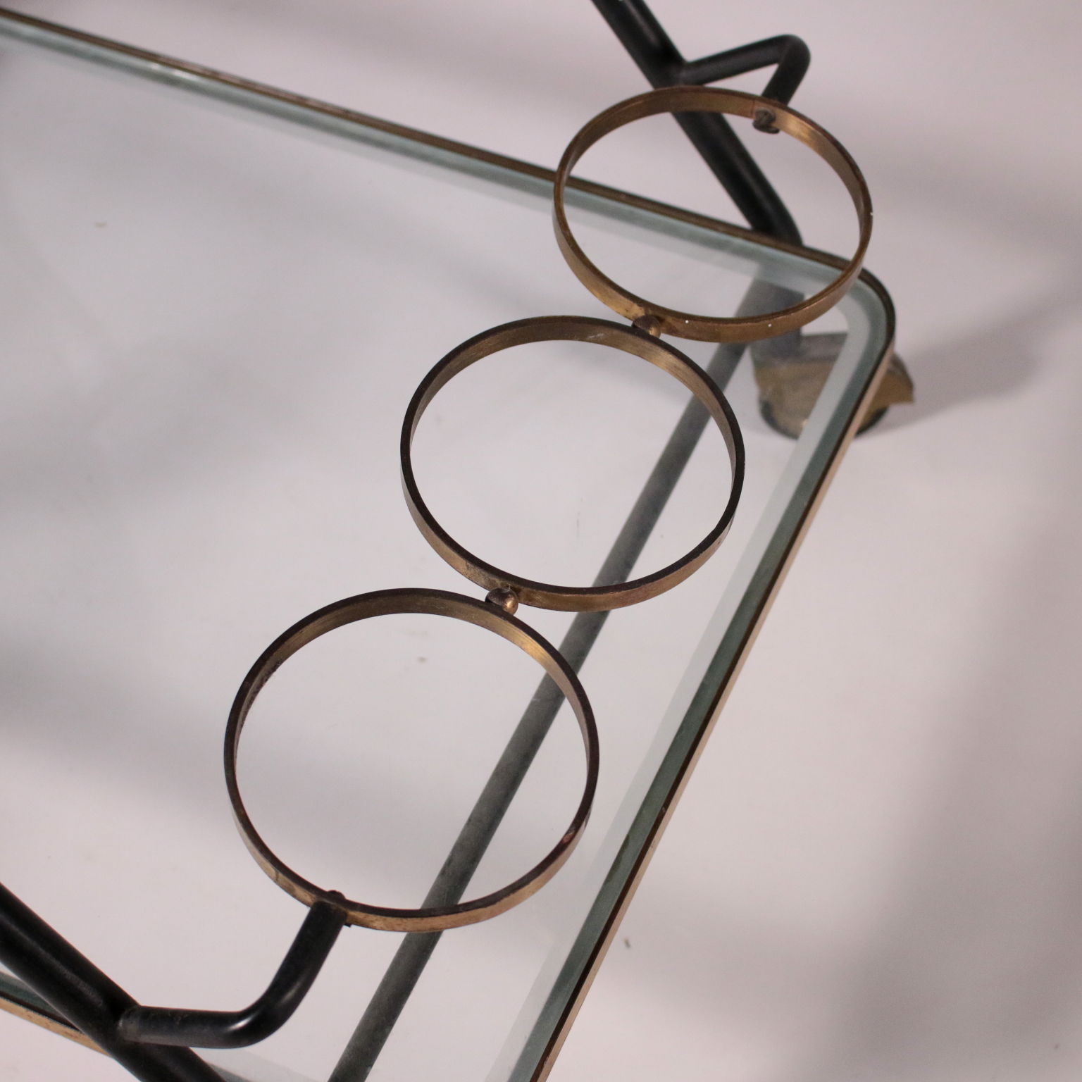 Carro de servicio con el titular de la botella, el metal, latón, vidrio.