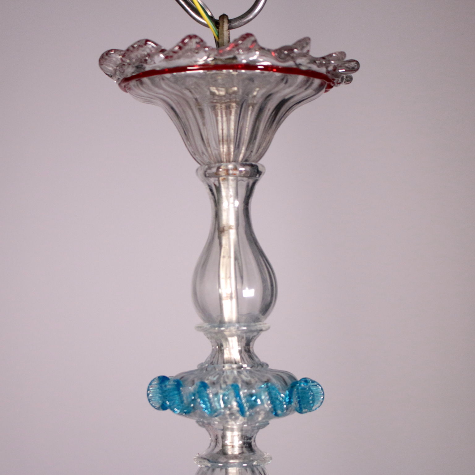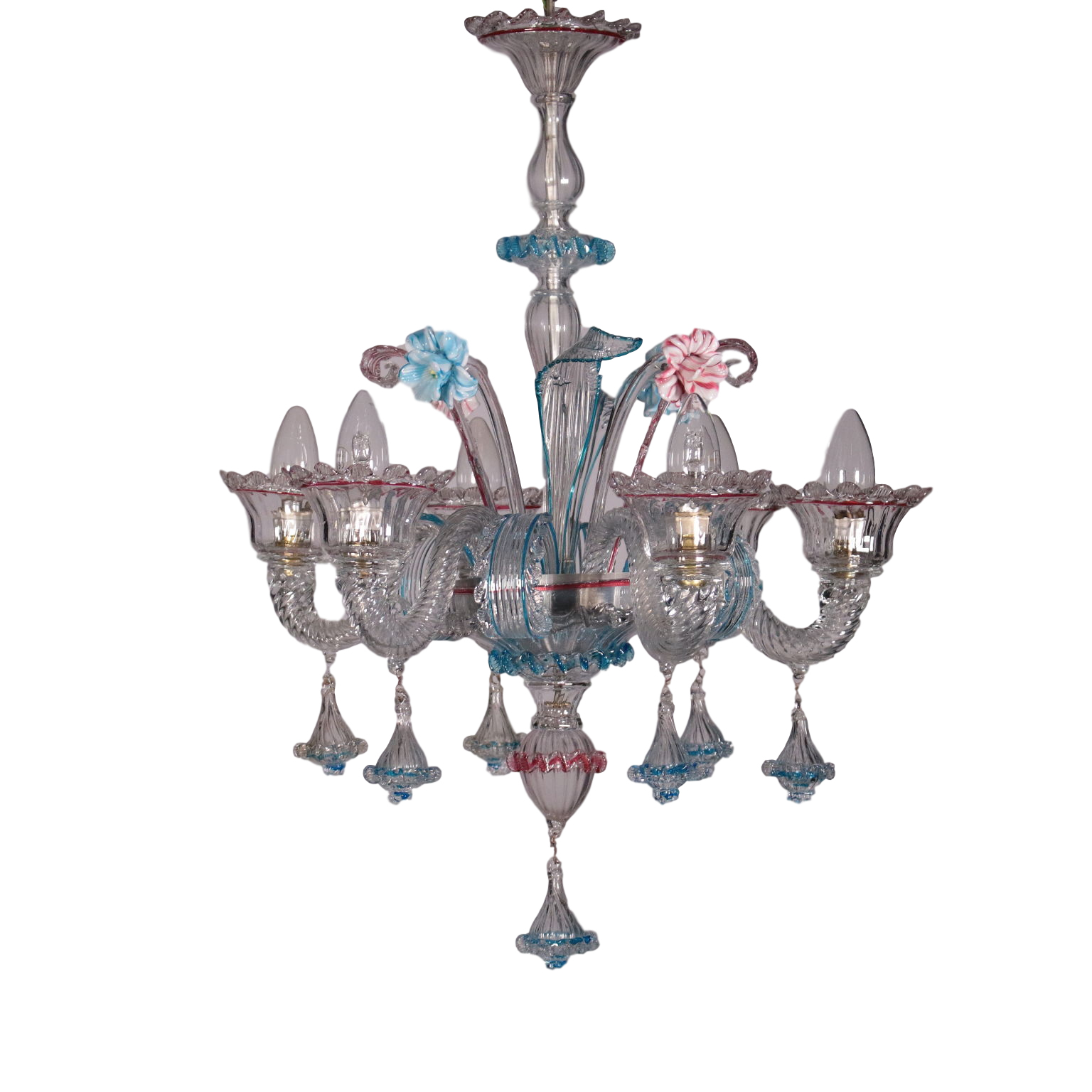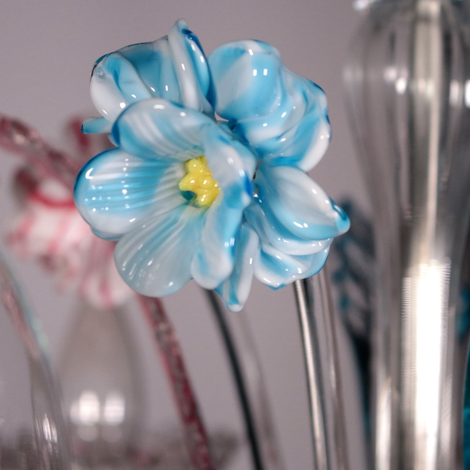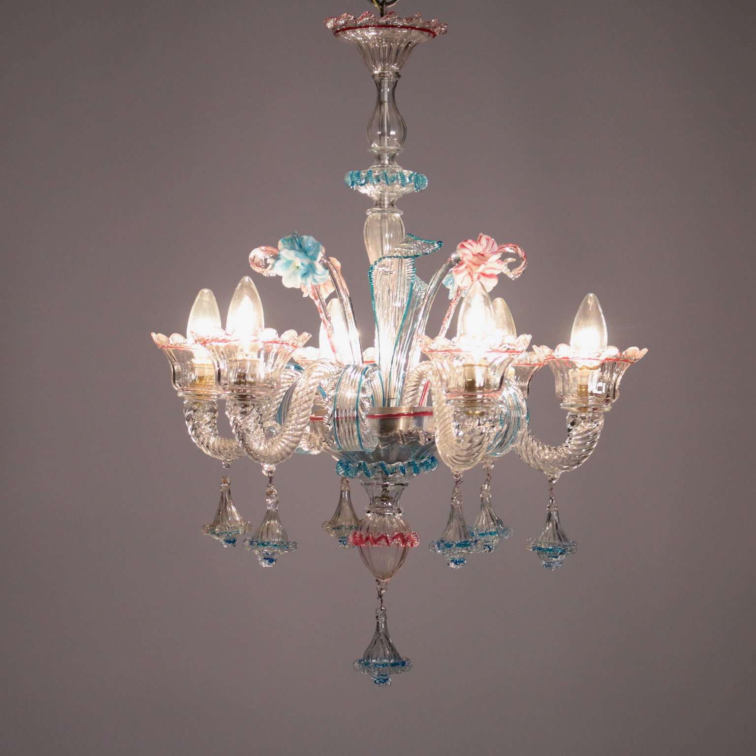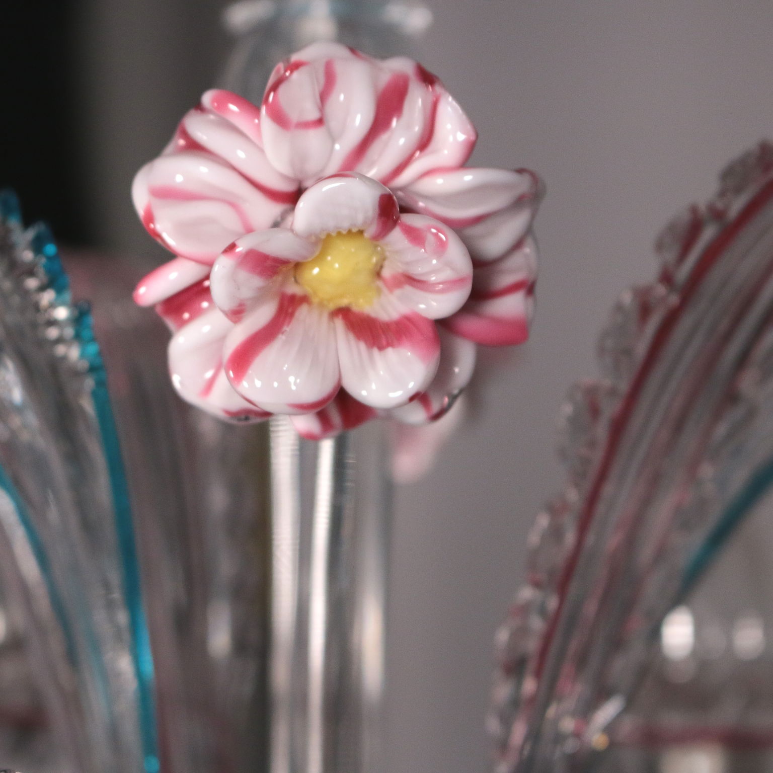 Araña de cristal de Murano, de seis brazos. Características de las hojas y las flores en el vaso, la policromía.