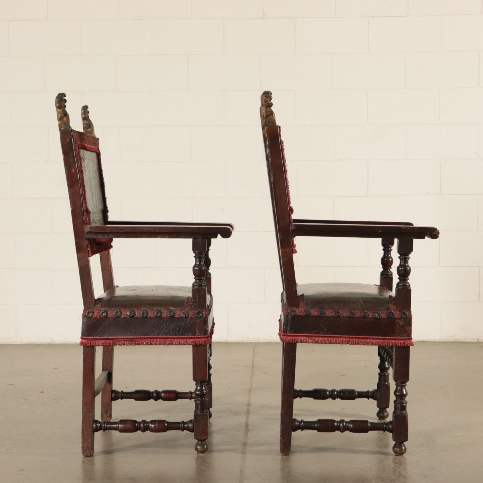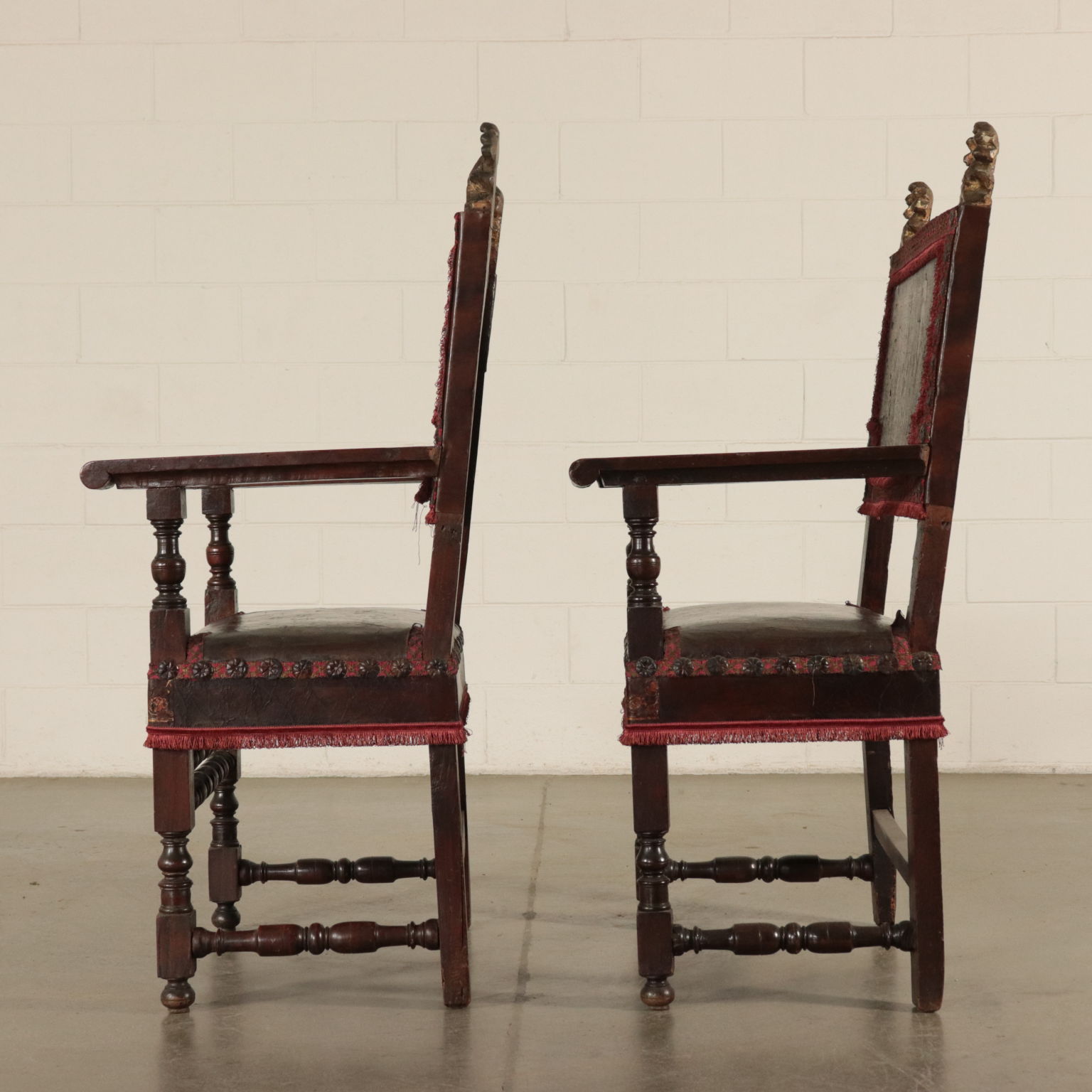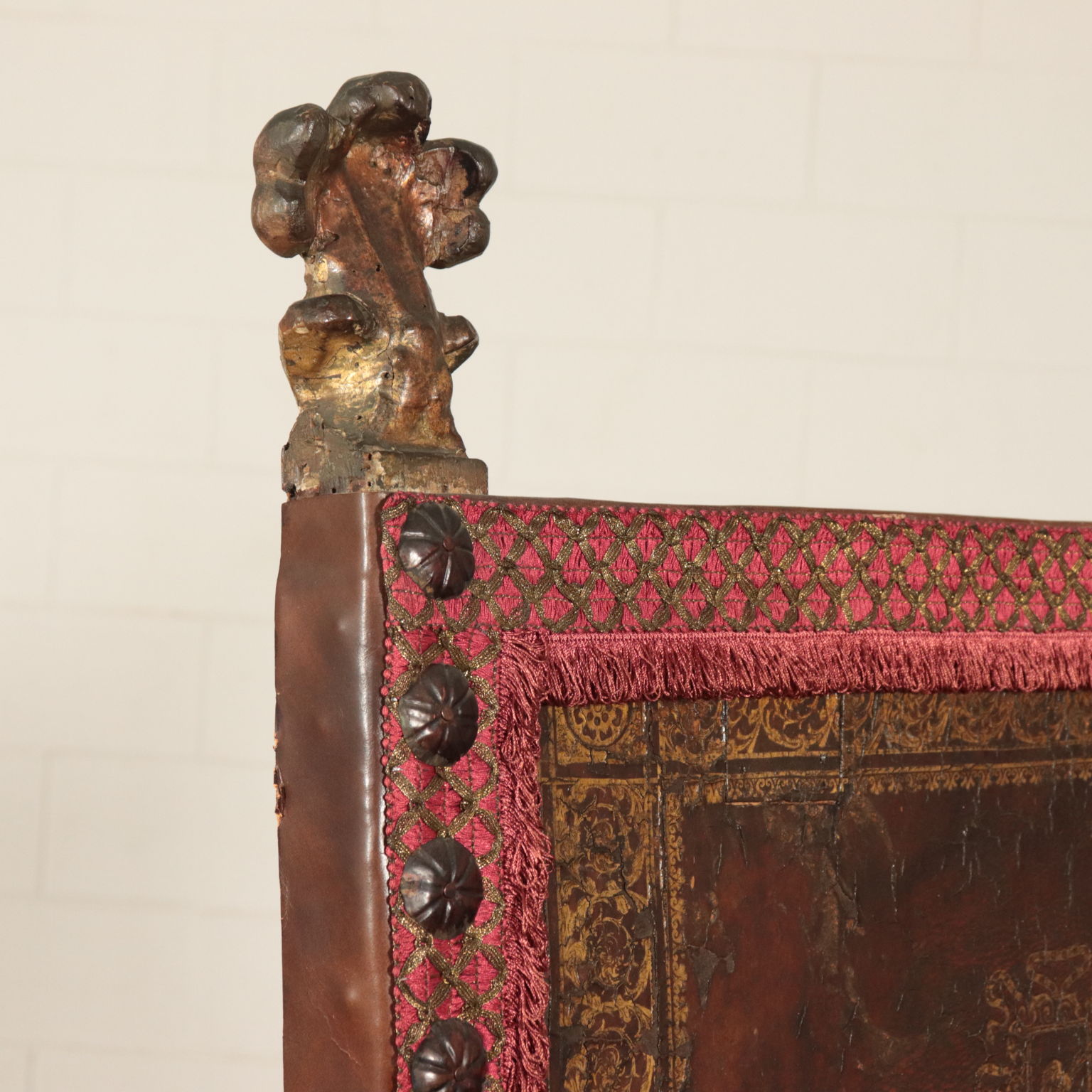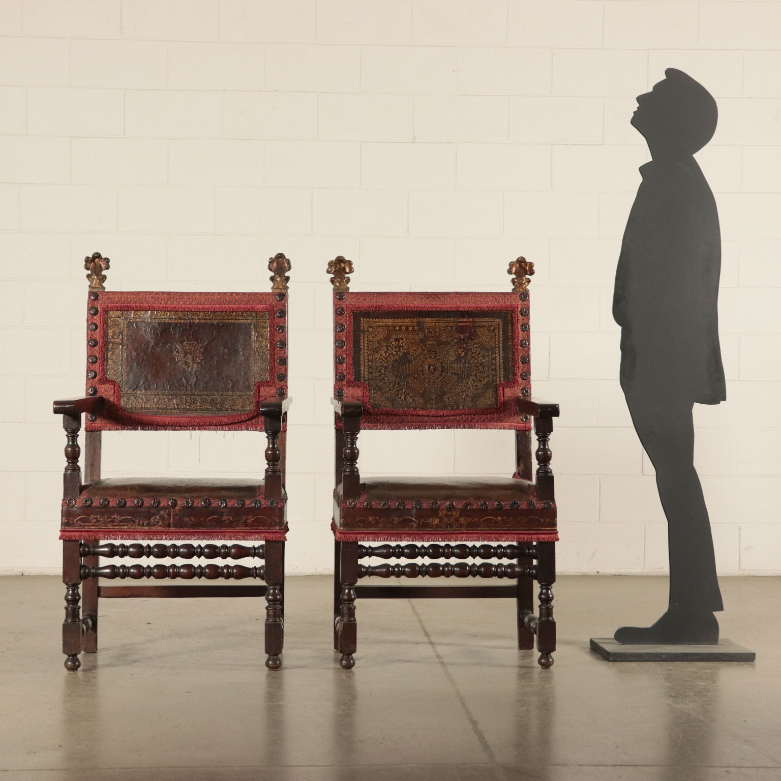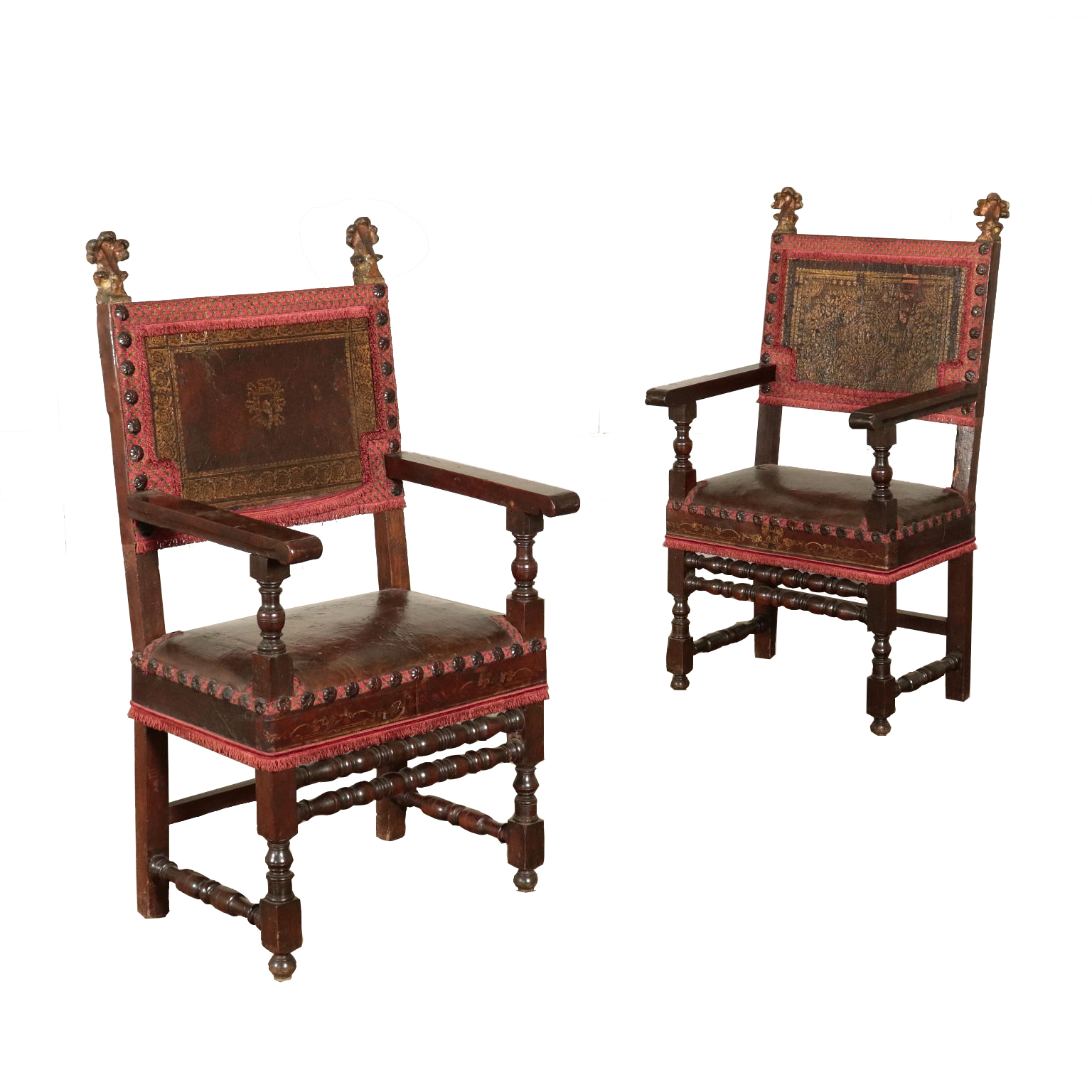 Par de tronos gobernado por las piernas y atravesar la bobina. Asiento y respaldo en el impreso de cuero con inserciones de tejido. Llamas terminales tallada y dorada.
