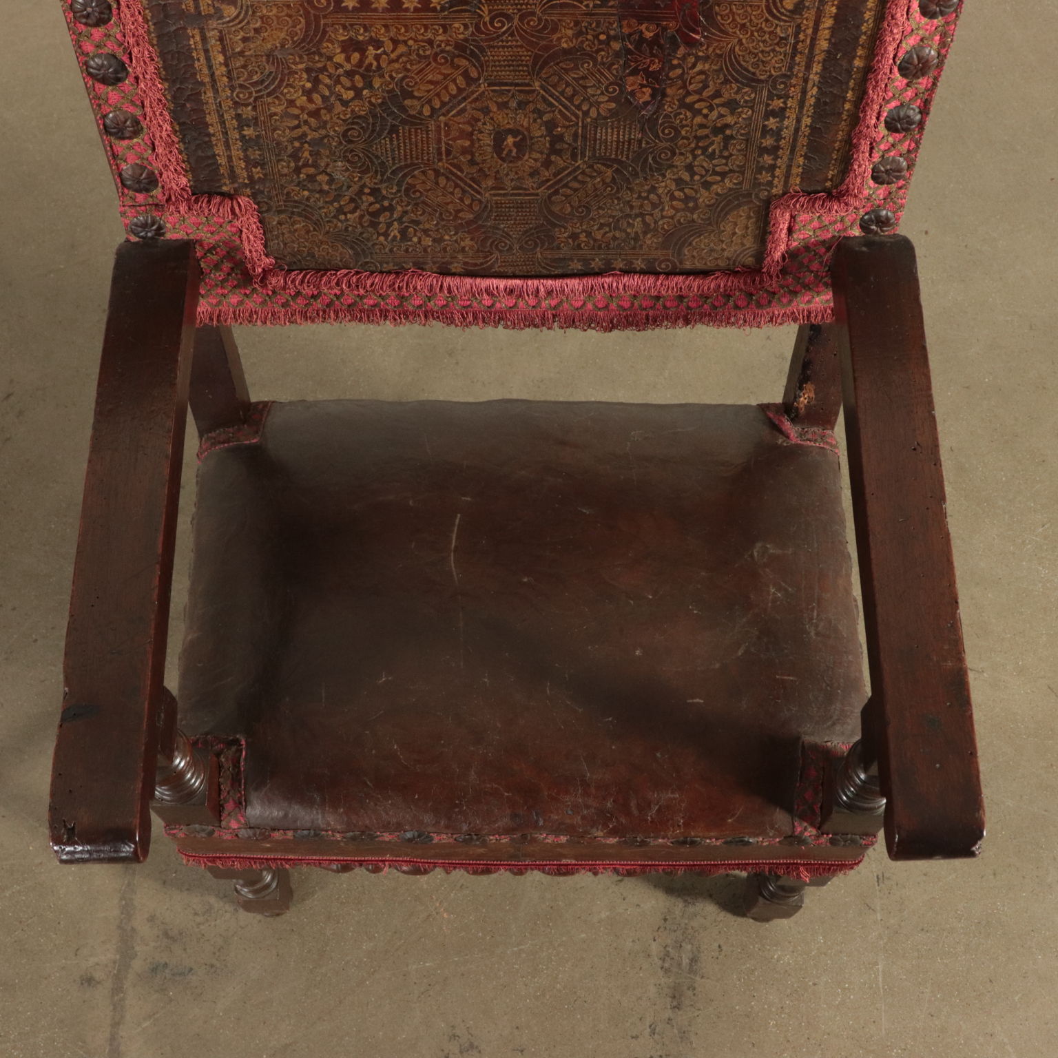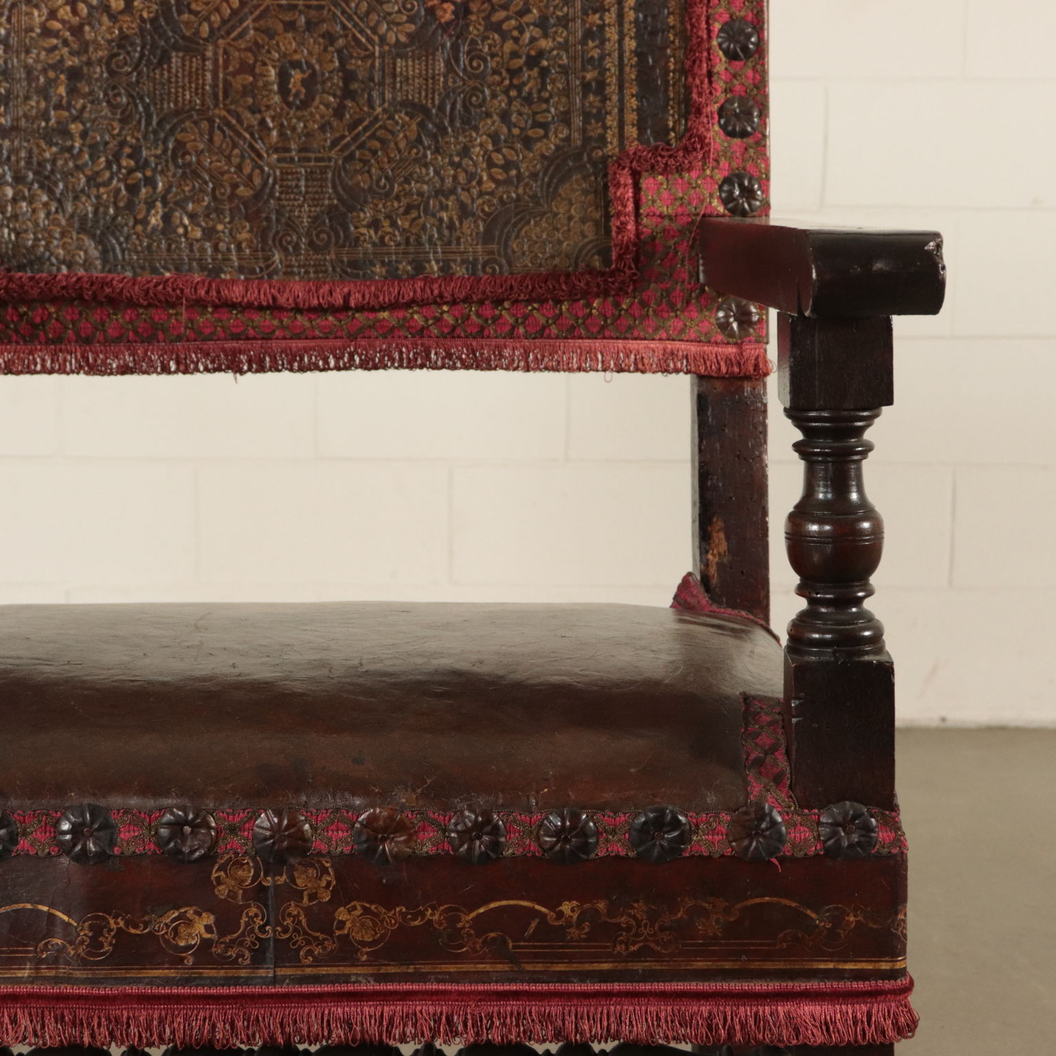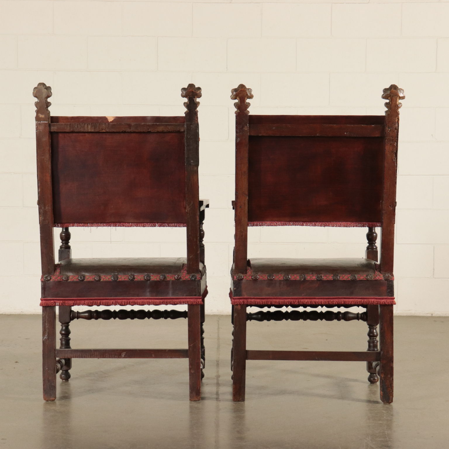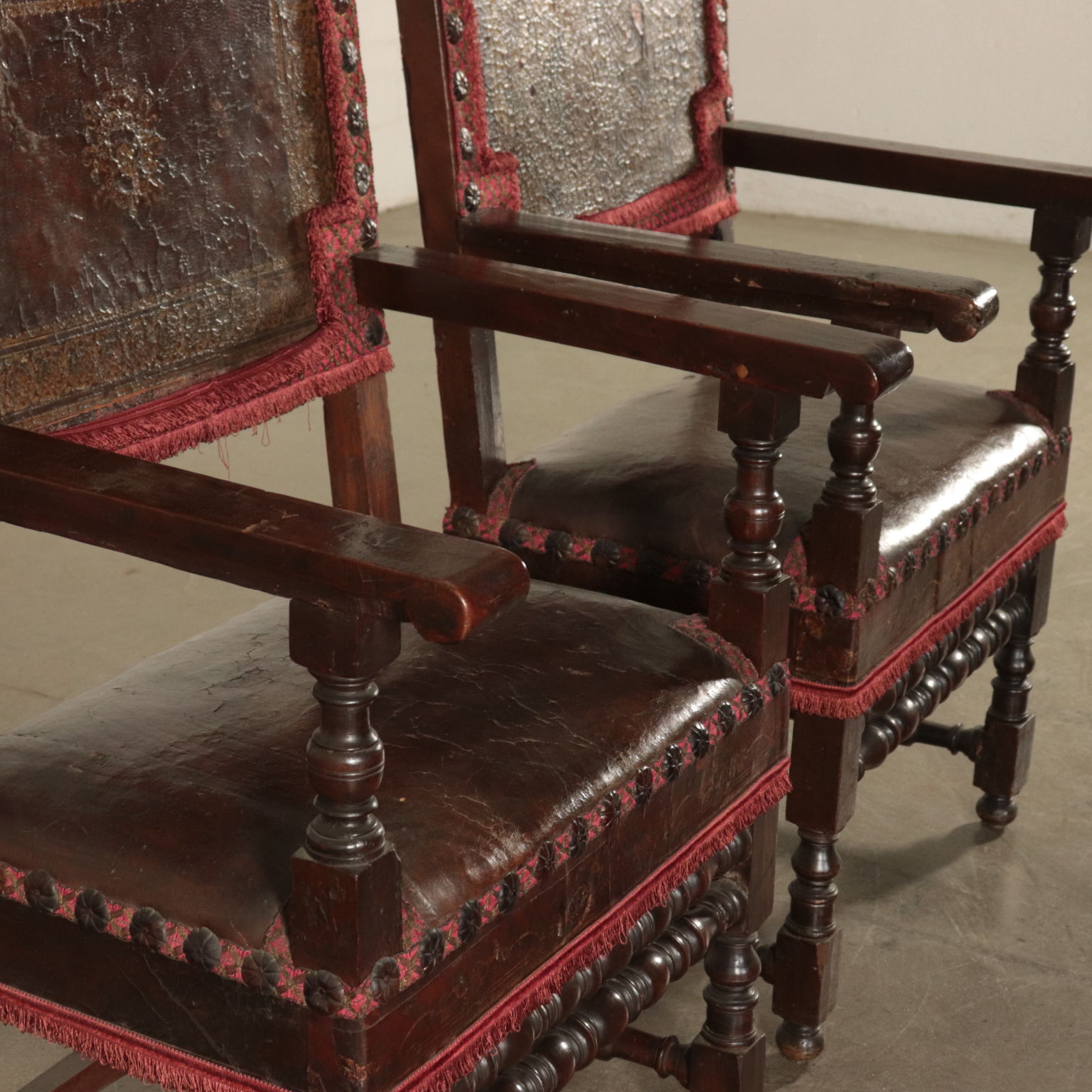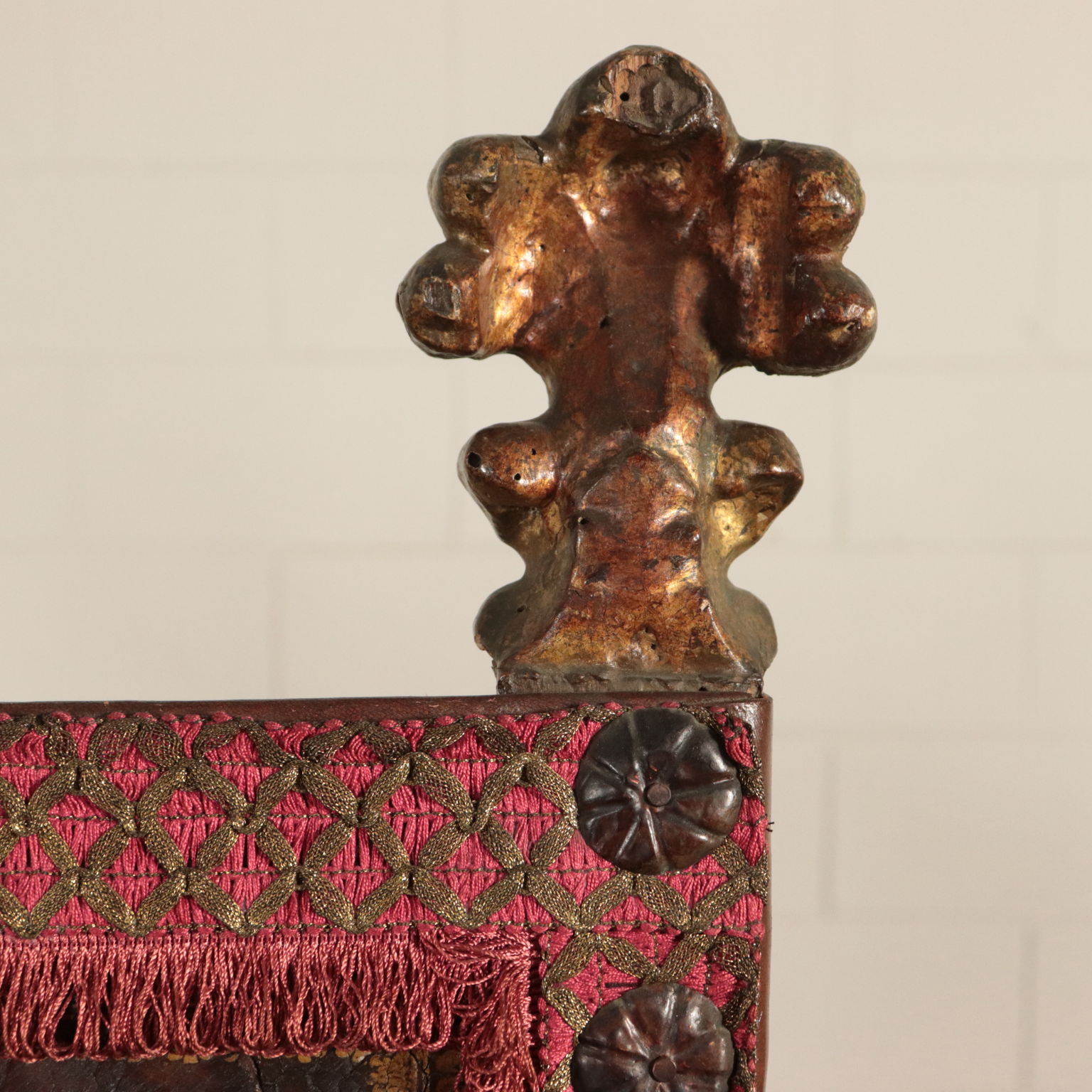 Par de tronos gobernado por las piernas y atravesar la bobina. Asiento y respaldo en el impreso de cuero con inserciones de tejido. Llamas terminales tallada y dorada.