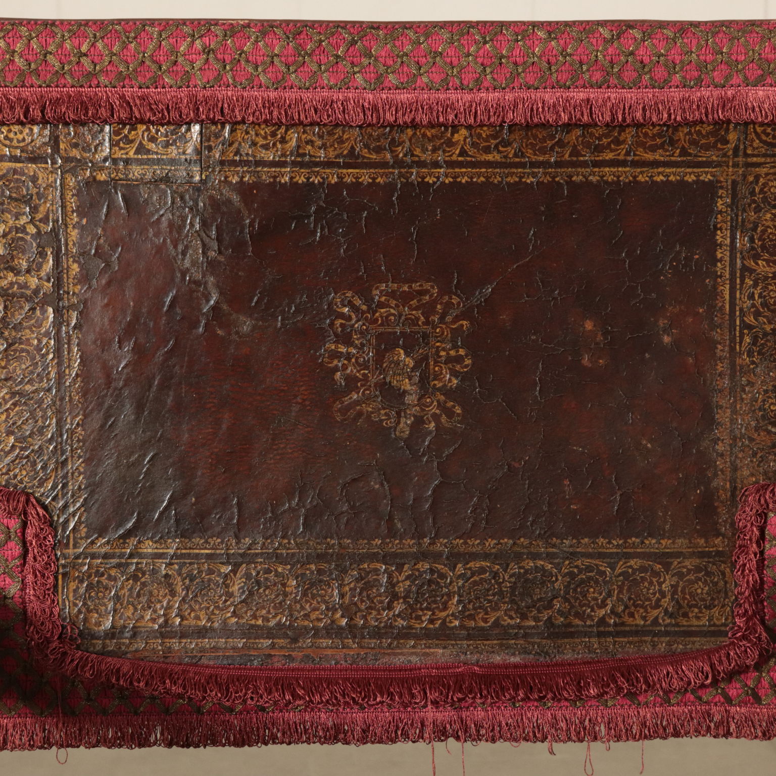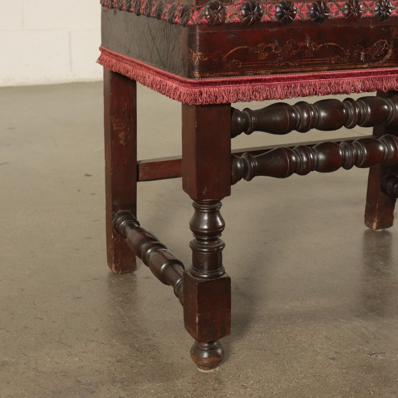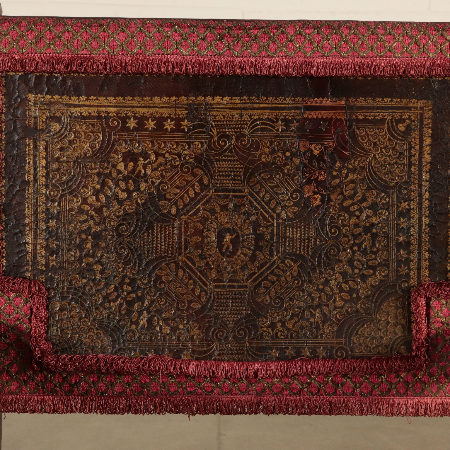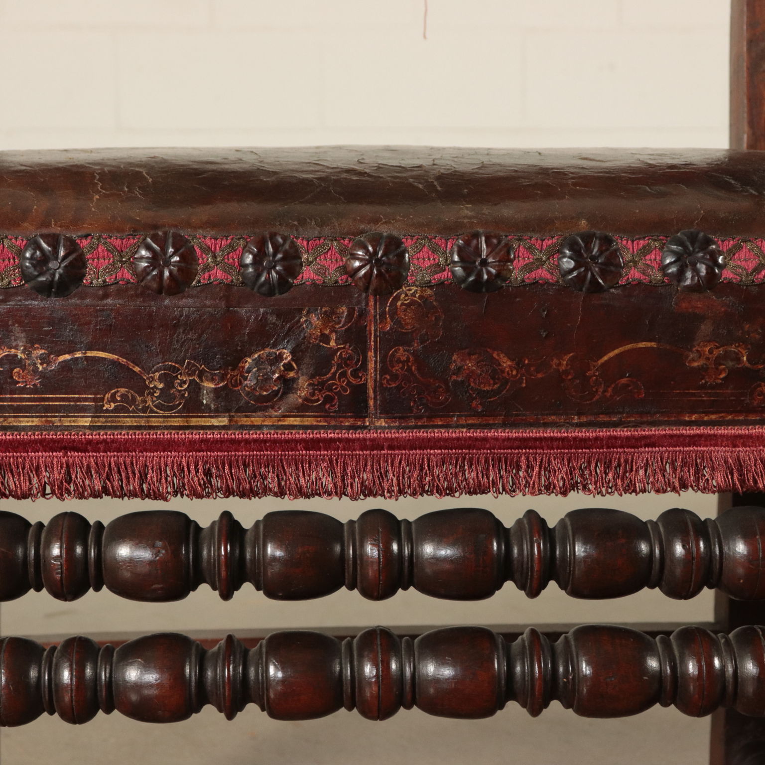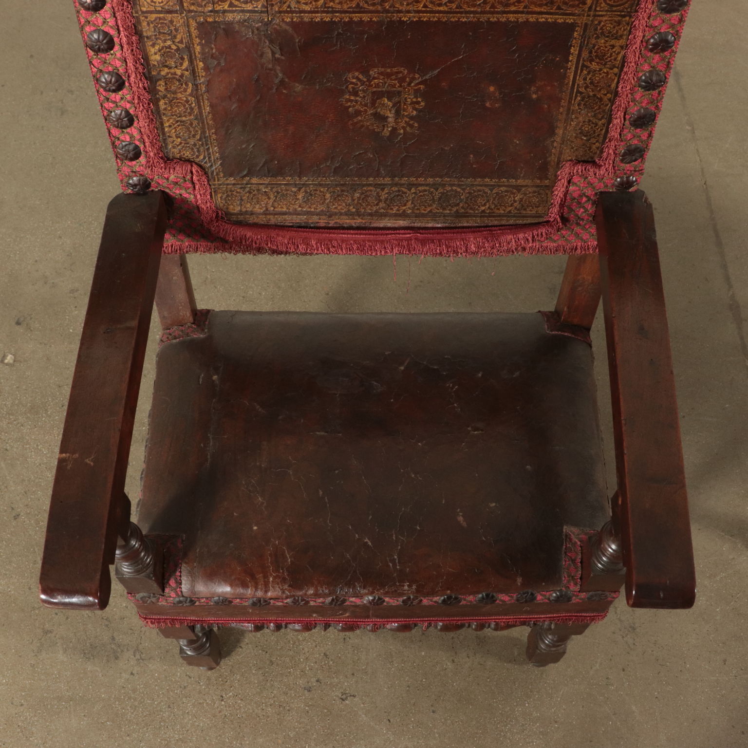 Par de tronos gobernado por las piernas y atravesar la bobina. Asiento y respaldo en el impreso de cuero con inserciones de tejido. Llamas terminales tallada y dorada.