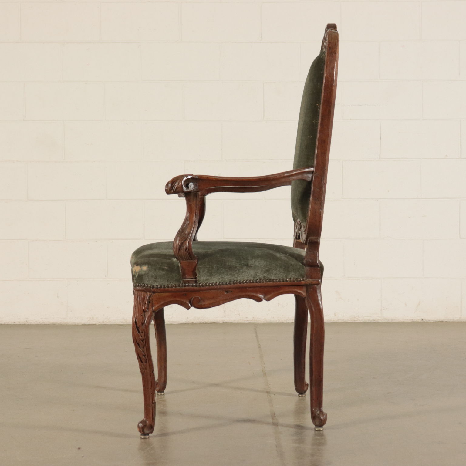 Presidente-mueve las piernas estiradas. Características de los brazos, un día de acabar en una espiral. Finamente tallada con monedas y elementos foliáceas. Asiento y respaldo tapizados.