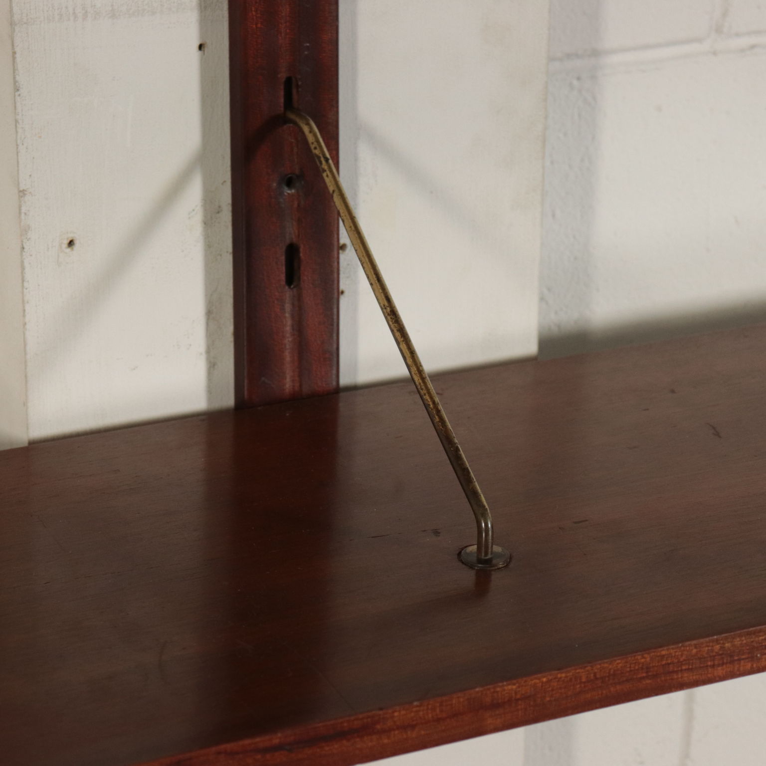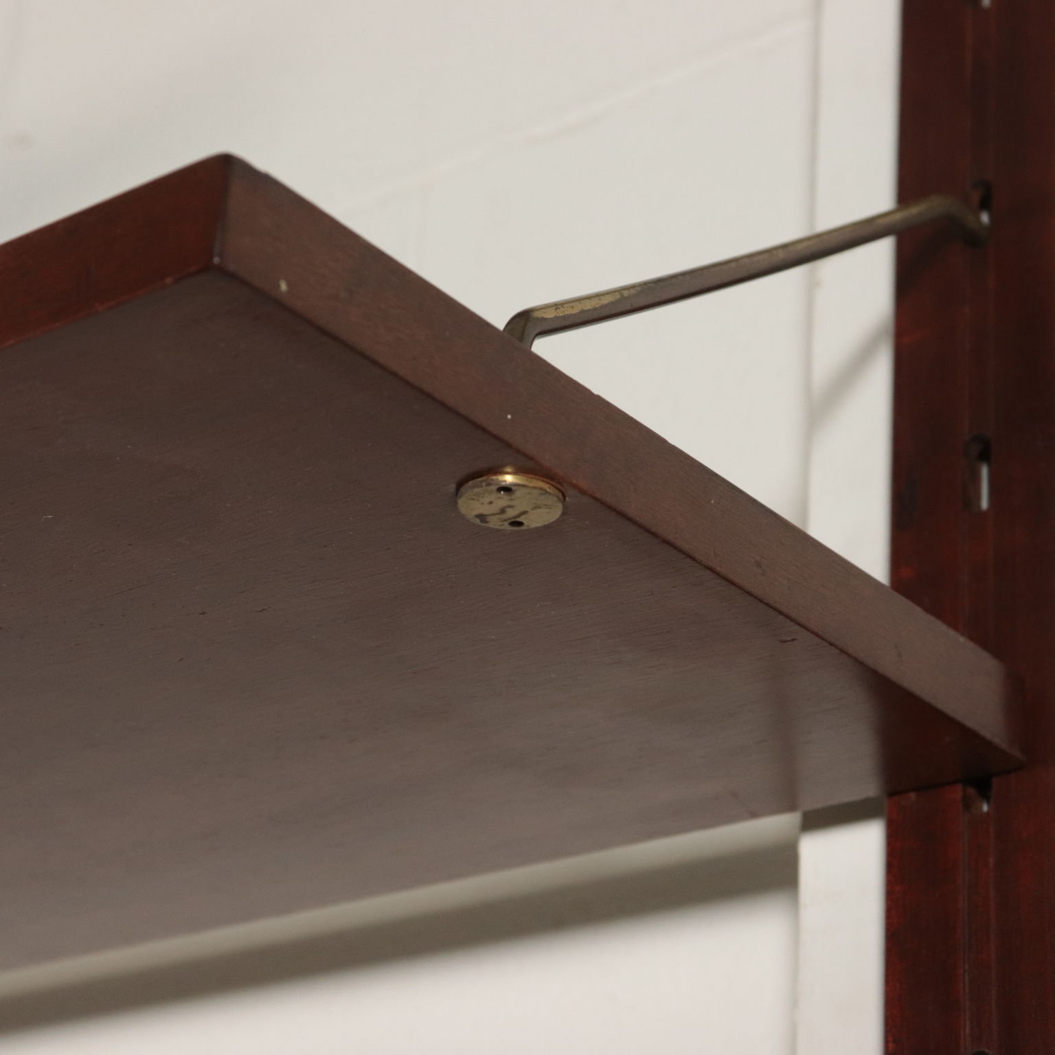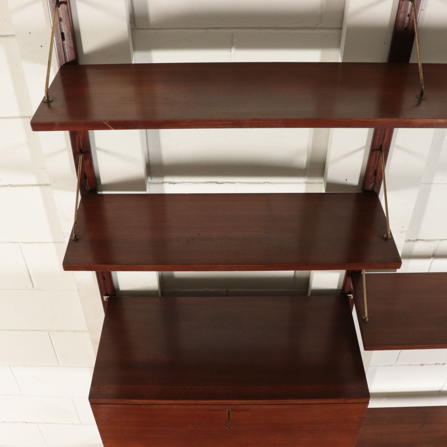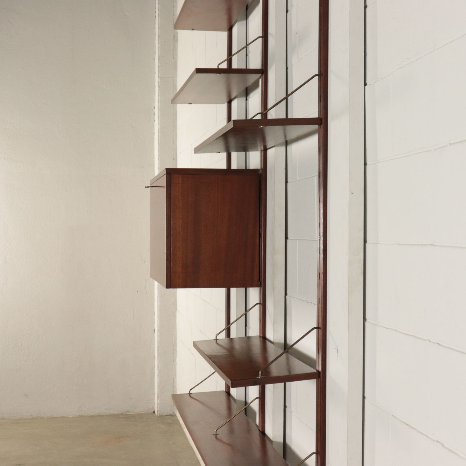 Biblioteca con montaje en la pared, los elementos en posición ajustable, la chapa de madera, madera de caoba, bronce.