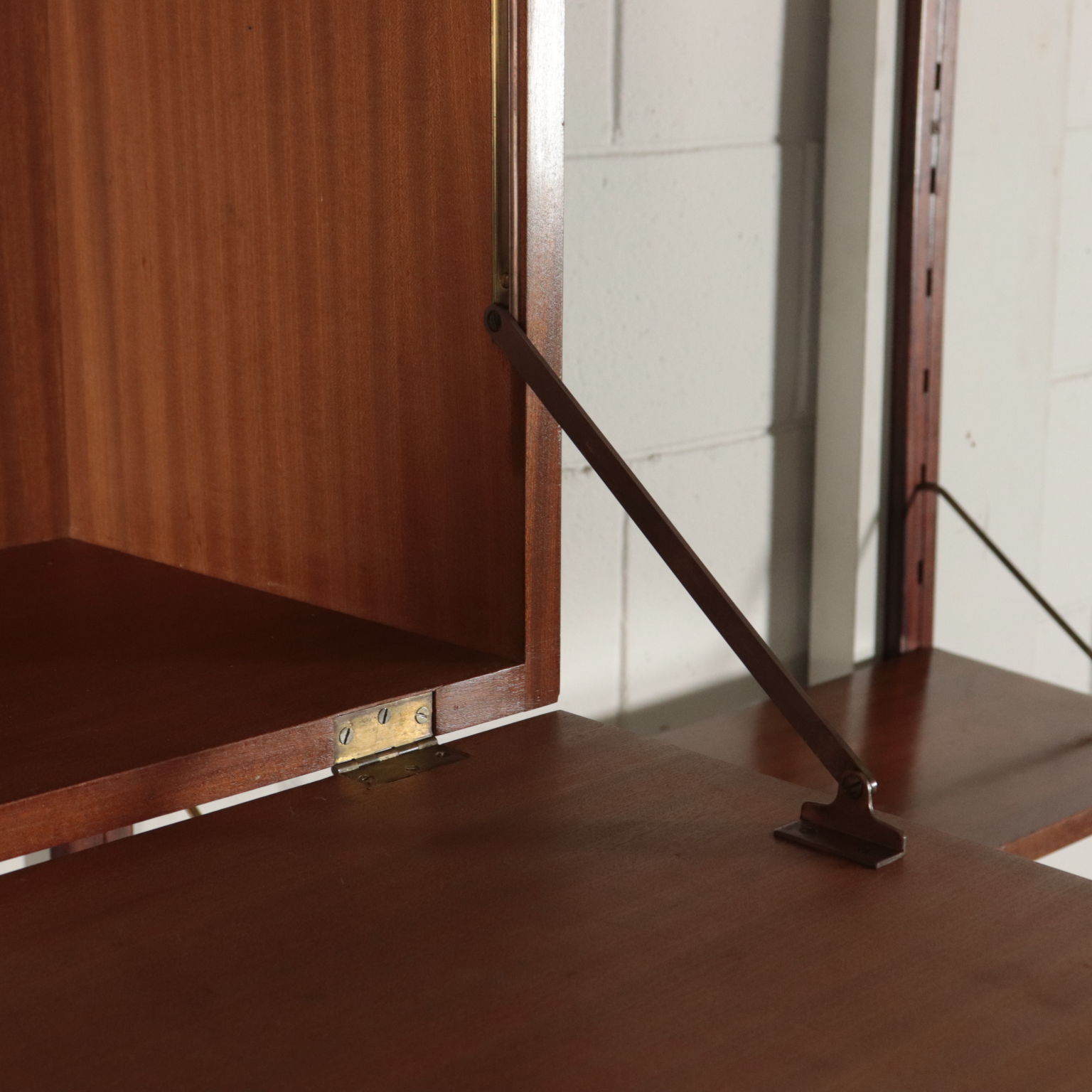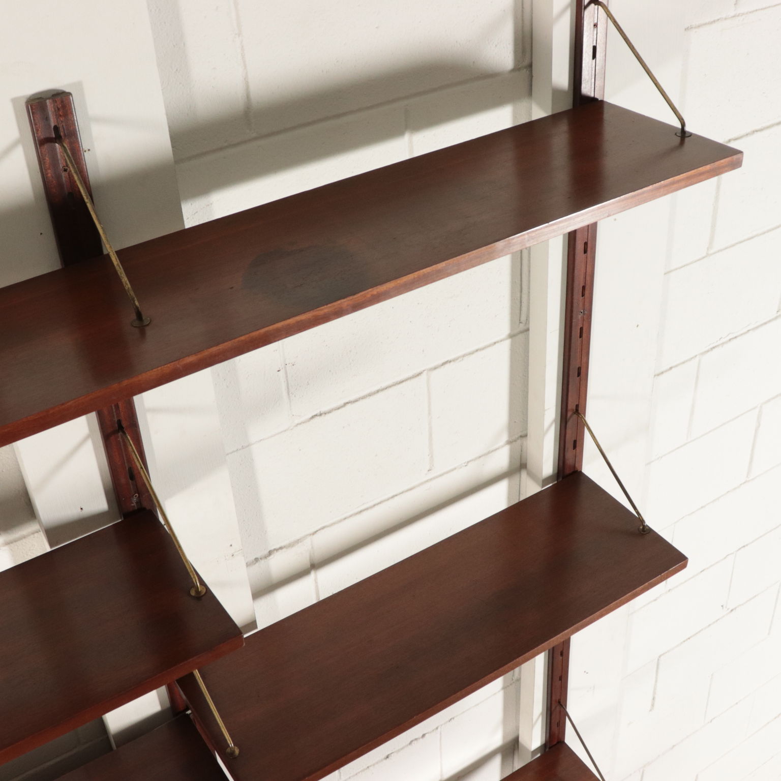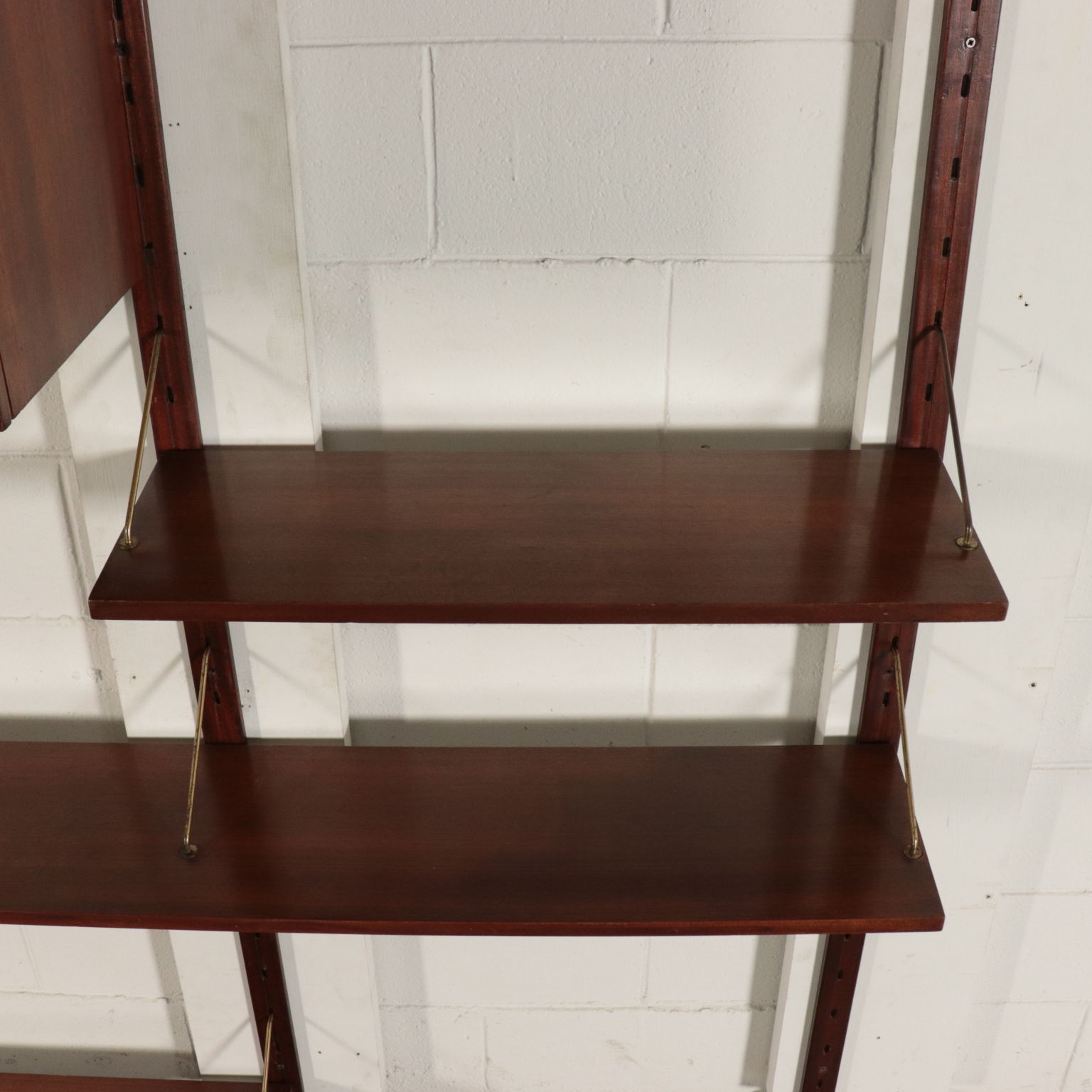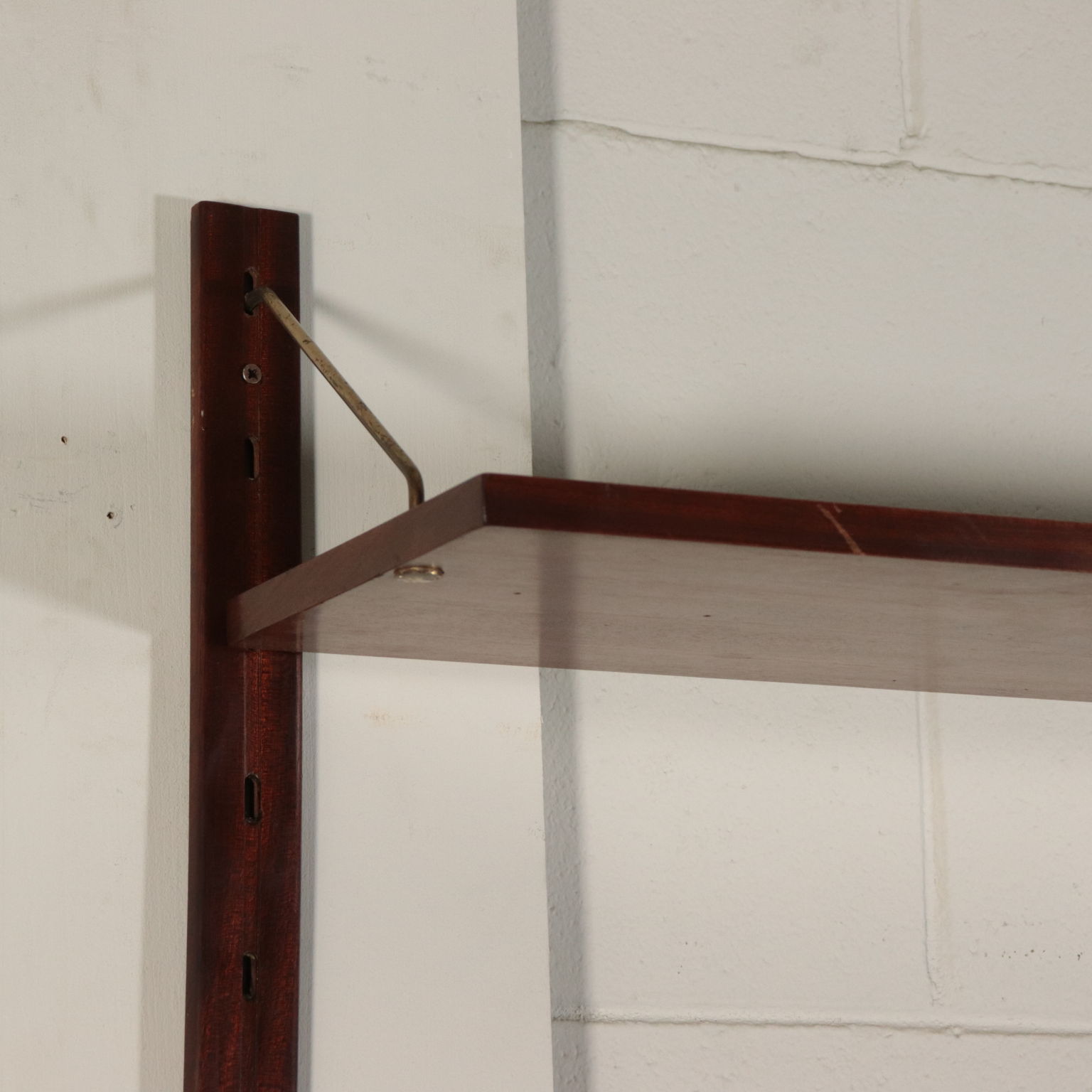 Biblioteca con montaje en la pared, los elementos en posición ajustable, la chapa de madera, madera de caoba, bronce.
