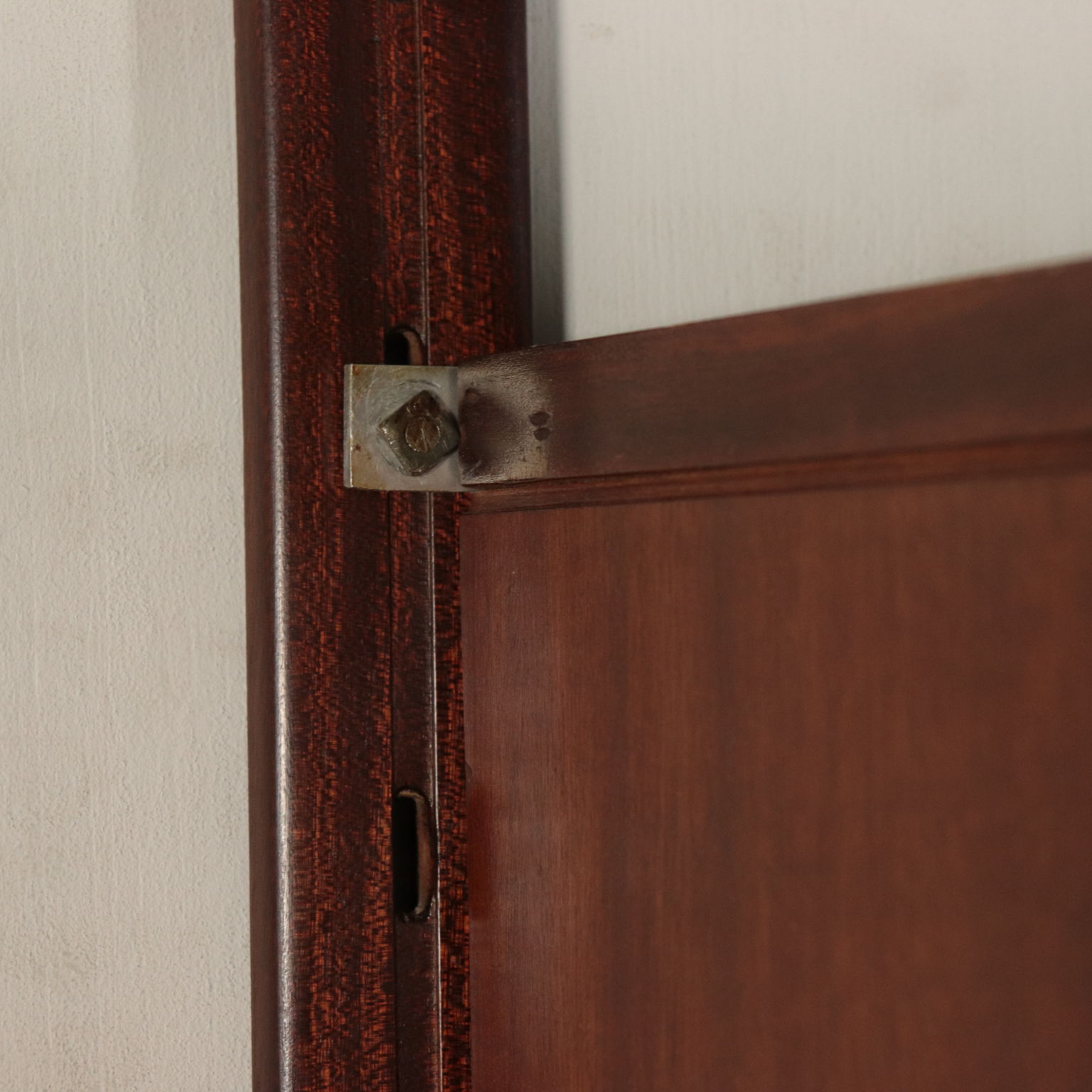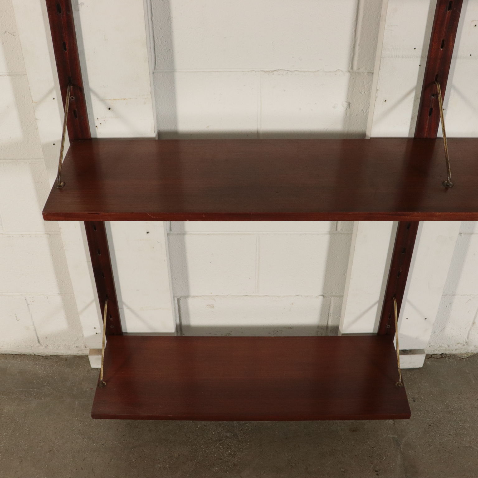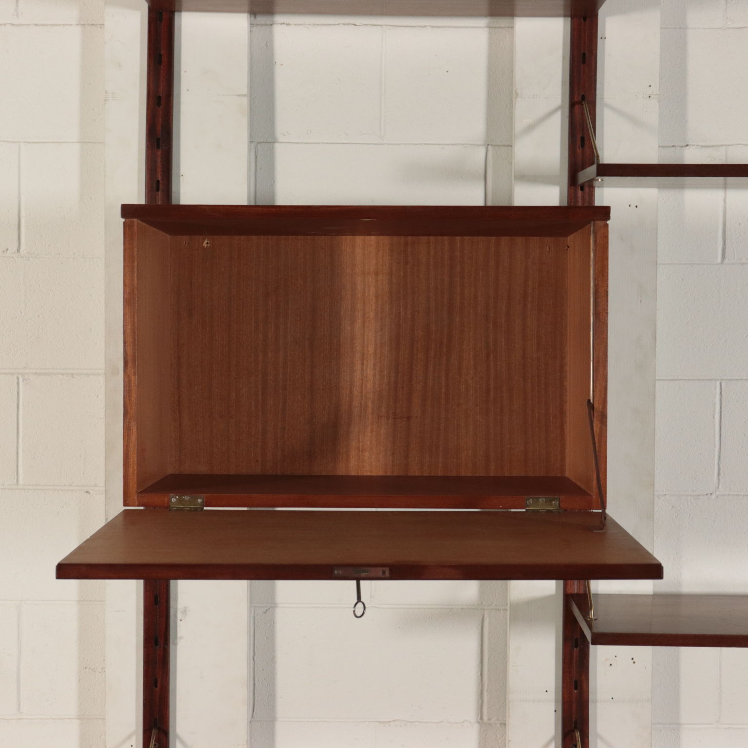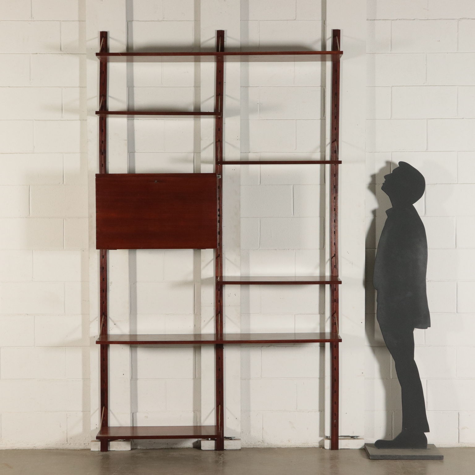 Biblioteca con montaje en la pared, los elementos en posición ajustable, la chapa de madera, madera de caoba, bronce.