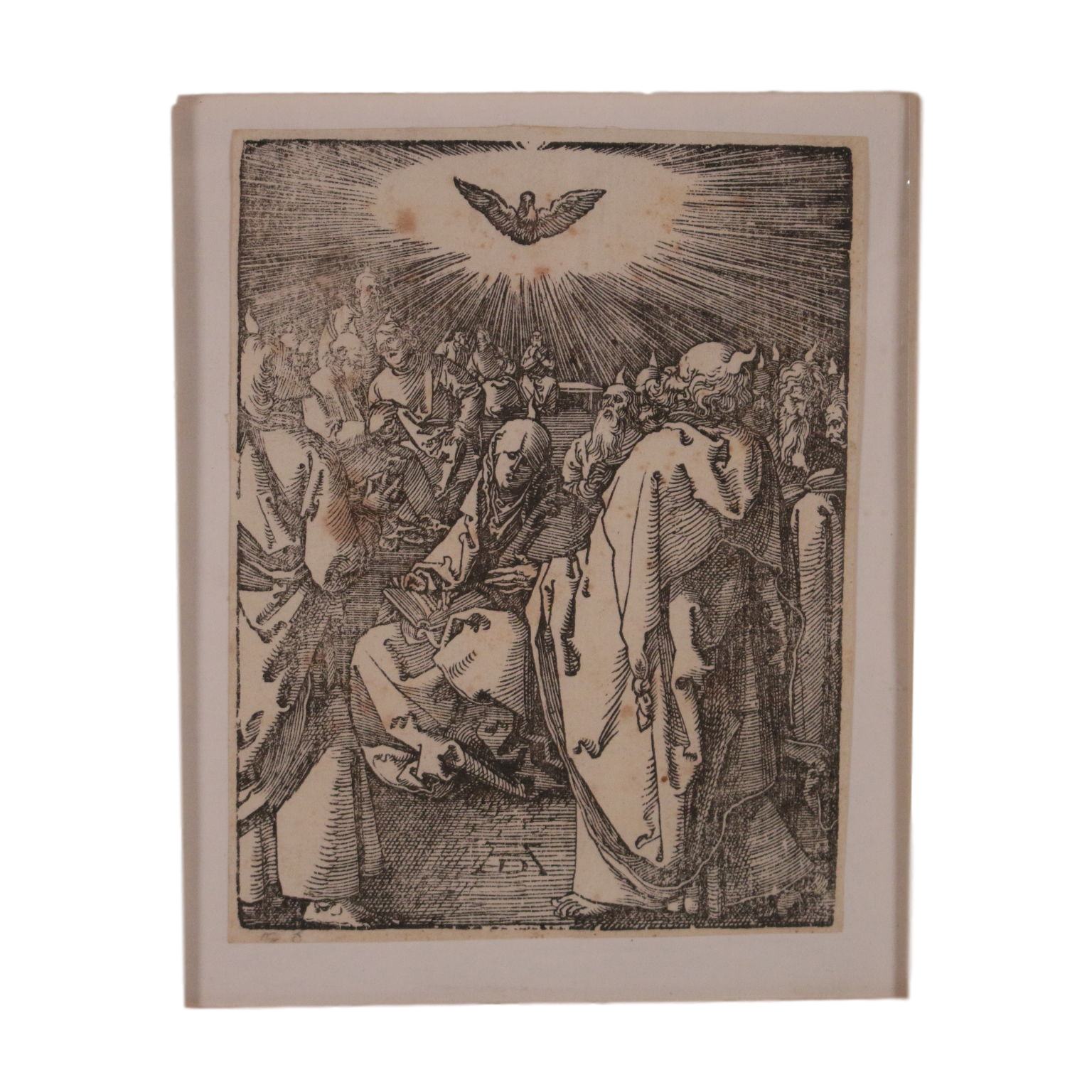 Xilografía sobre papel. La escena reproduce es parte del ciclo de Dürer de "La pequeña Pasión", una serie de treinta y seis xilografías, la mayoría de la portada, fechada en el año 1511, y de que uno de los mejores ejemplares se conserva en el Museo Británico en Londres. Pertenece a la serie de xilografías con el título de la página, de carácter religioso (la grande y La pequeña Pasión, La Revelación), que el gran artista alemán - pintor, grabador, matemático, ensayista - está dedicada.