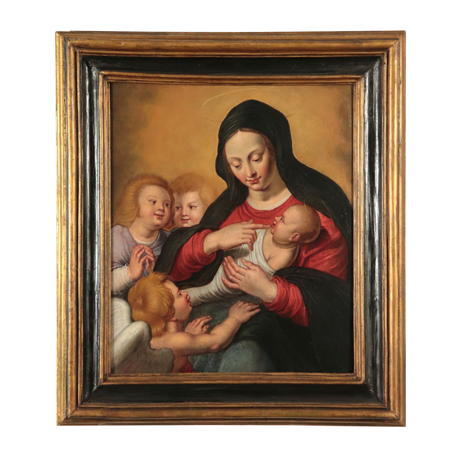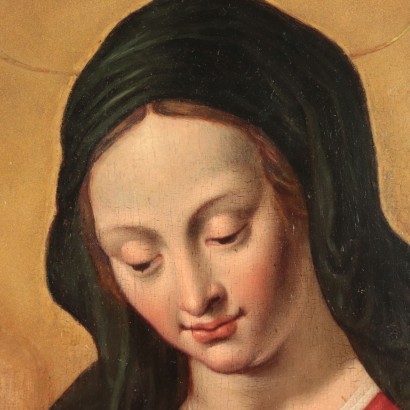 Aceite en el panel. Viva la sagrada representación de la Virgen con el Niño, incluso el bebé en pañales, en un momento lúdico, mientras que la madre cosquillas en el labio un poco para hacer reír; alrededor de los ángeles, como los niños la curiosidad para observar y disfrutar. Los colores, vivos y brillantes, hacen hincapié en el acontecimiento feliz, incluso si el color de fondo de oro, recuerda la dimensión divina de los personajes. La pintura se presenta en el antiguo marco adaptado.