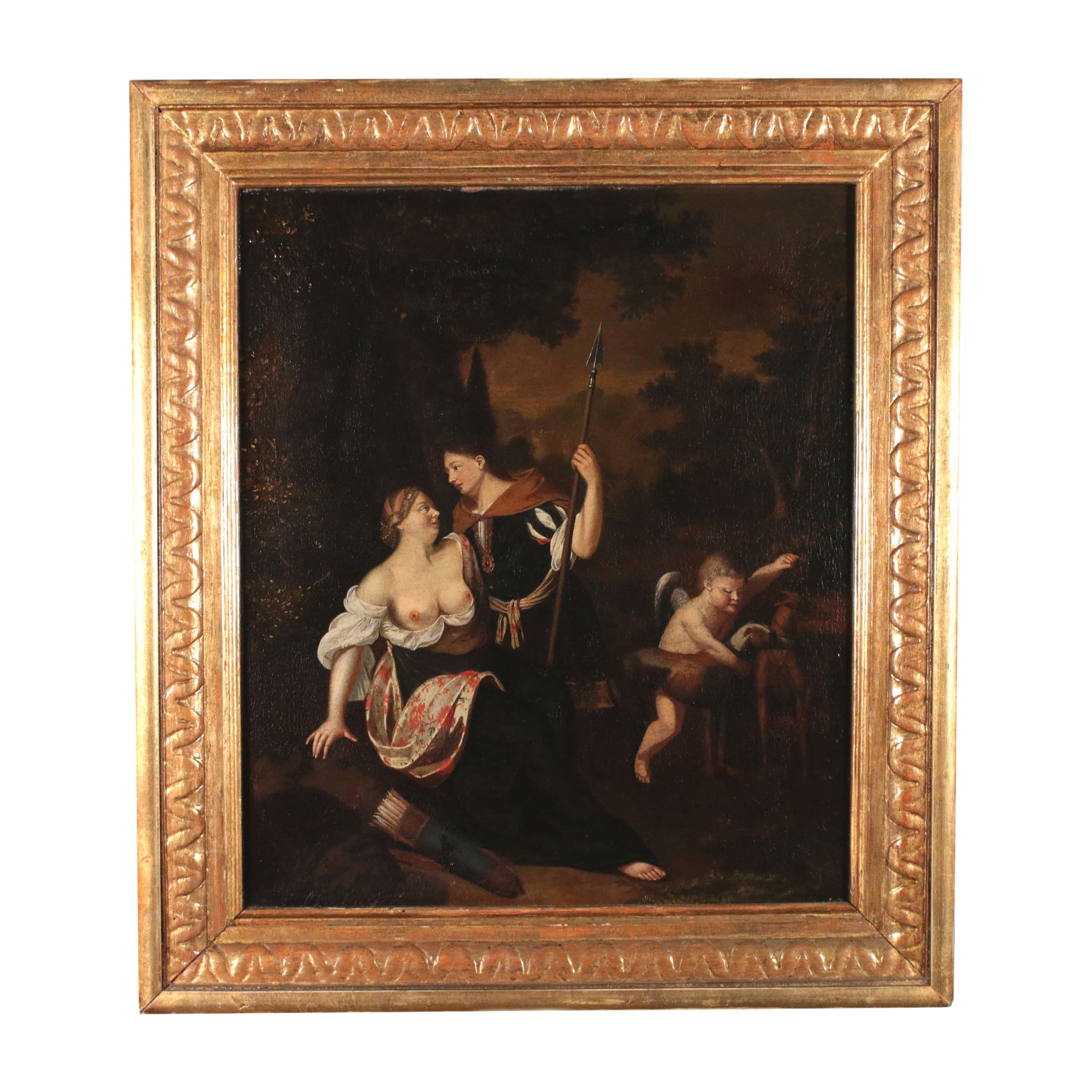 Óleo sobre lienzo. La escuela del norte de europa. La firma no identificada en la parte inferior izquierda de la página. La escena se refiere al clásico mito de Adonis, la hermosa joven cazador de la que se enamoró de la misma diosa, Venus, que es boquiabierta, le siguió en el bosque y en el bosque, mientras que la caza, tratando de protegerlo de los peligros, y de las bestias; no podía, sin embargo, guardar porque Adonis, finalmente, fue mutilado y asesinado por un jabalí. Restaurado y ritelato, la pintura se presenta en un estilo de marco.