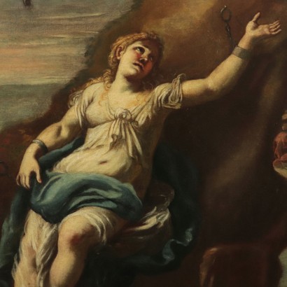 Óleo sobre lienzo. La escuela de italiano. La escena en la propuesta se centra en la figura de Andrómeda, mientras que las otras figuras, Perseo en vuelo, el monstruo que emerge del agua, el rey y la reina en la orilla para ayudar, son el contorno. La joven y bella Andrómeda, la hija del rey Cefeo y Casiopea, los gobernantes de Etiopía, se ofreció como un sacrificio de un monstruo marino enviado por Poseidón para asolar las costas del reino, para que un delito. El héroe Perseo, fresco de la empresa de la decapitación de Medusa, la Gorgona, llegando en un vuelo en su caballo alado, fue secuestrado en la vista de la hermosa doncella encadenada a la roca, y se enfrentó al monstruo de derrotar. La pintura, restaurado y ritelato, se presenta en el marco del siglo xix.