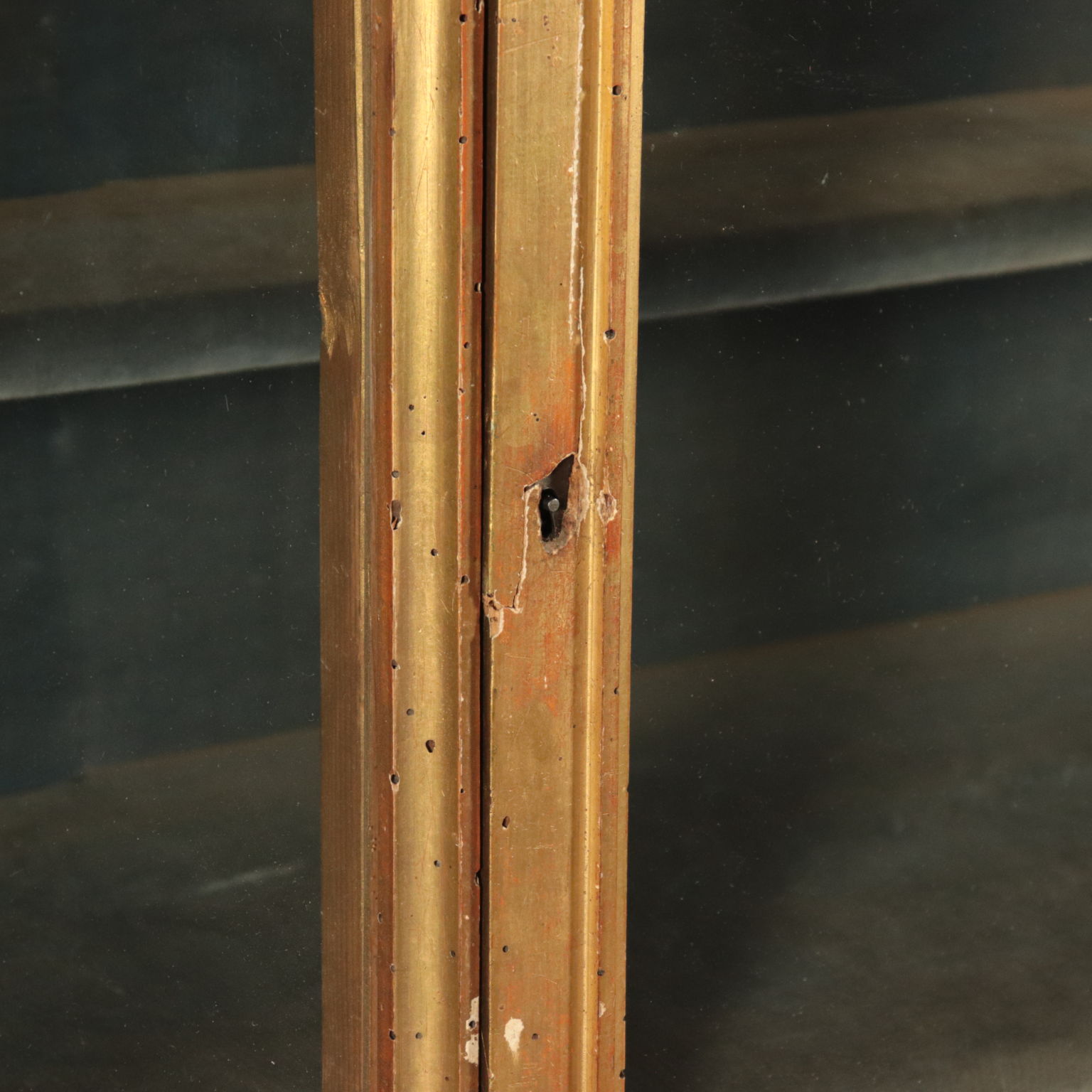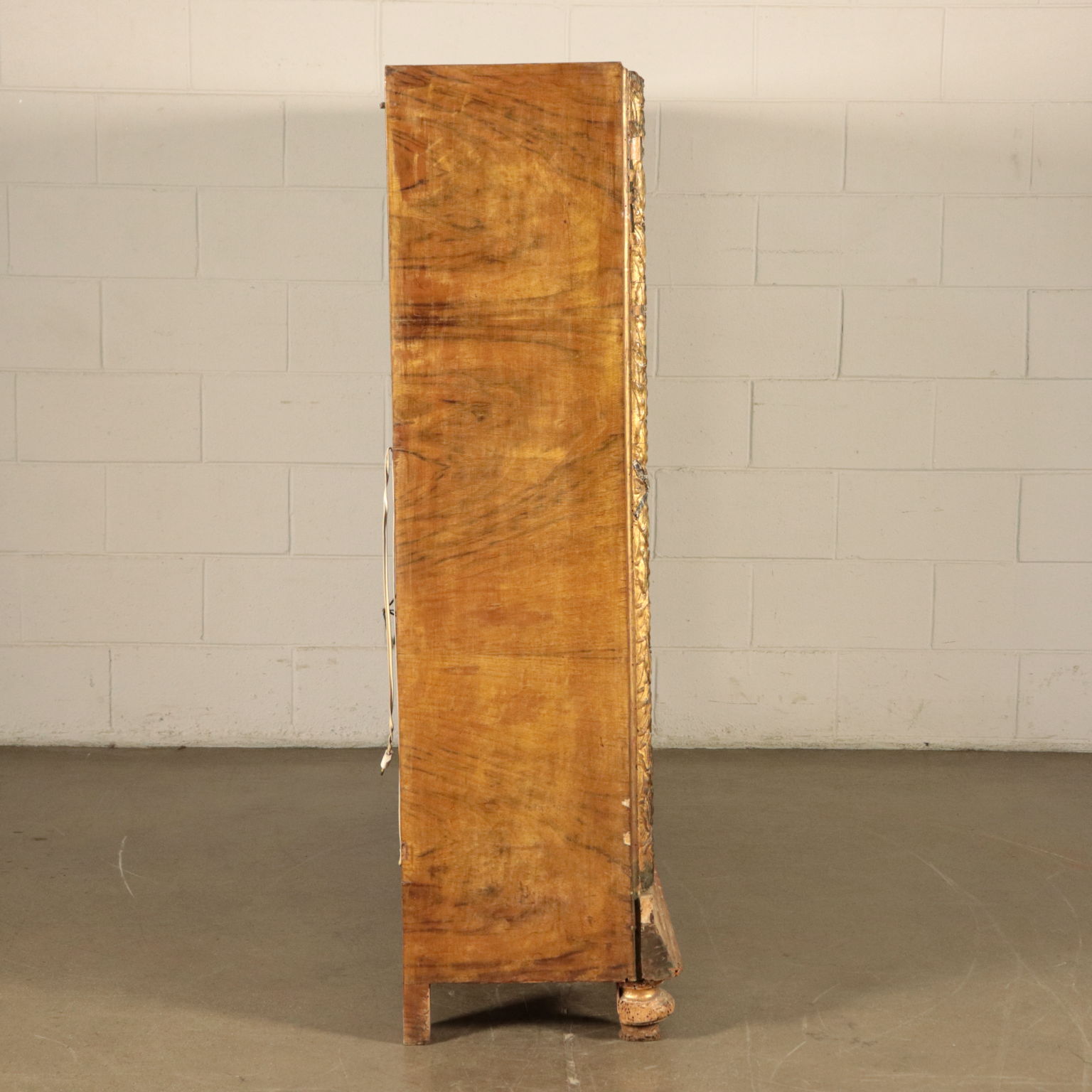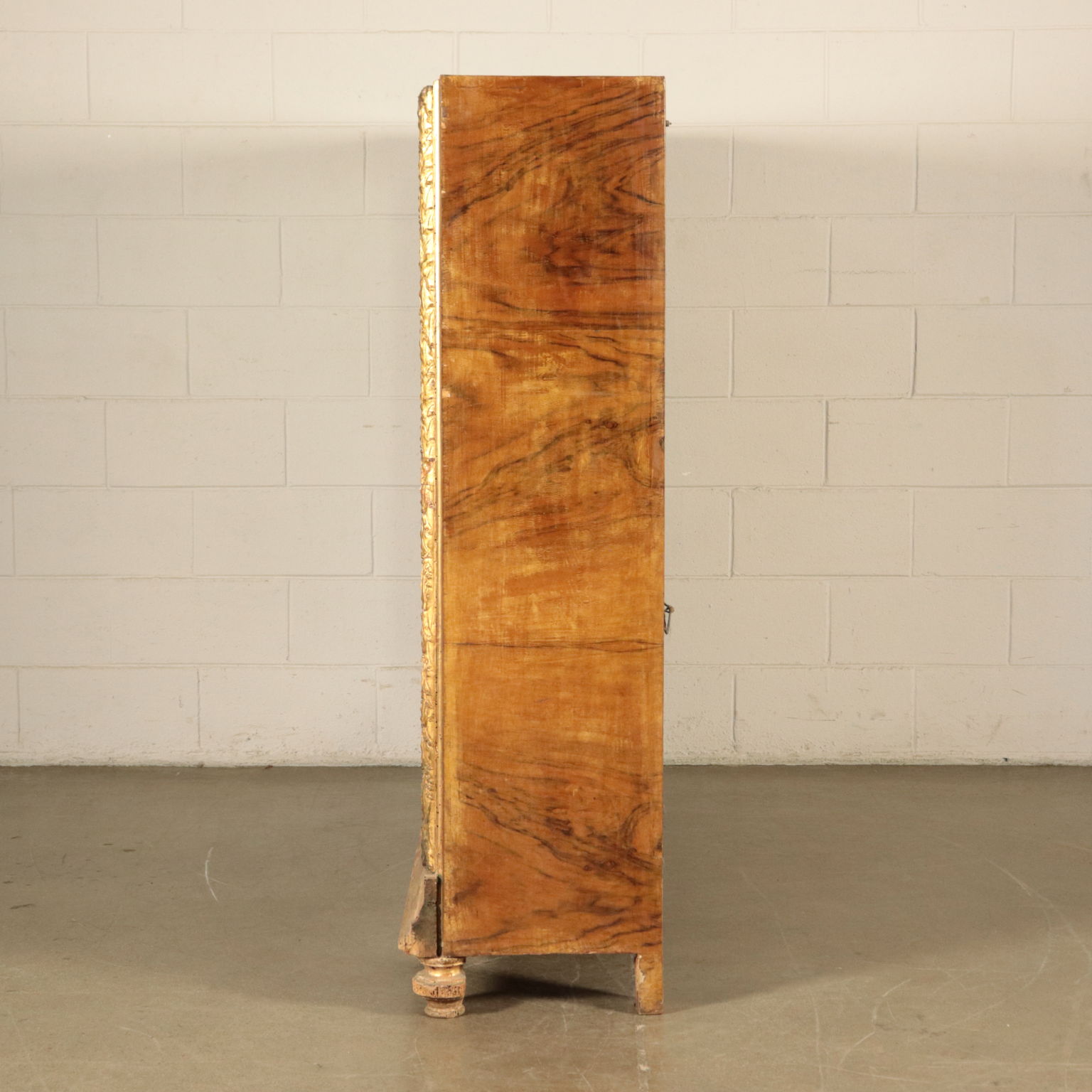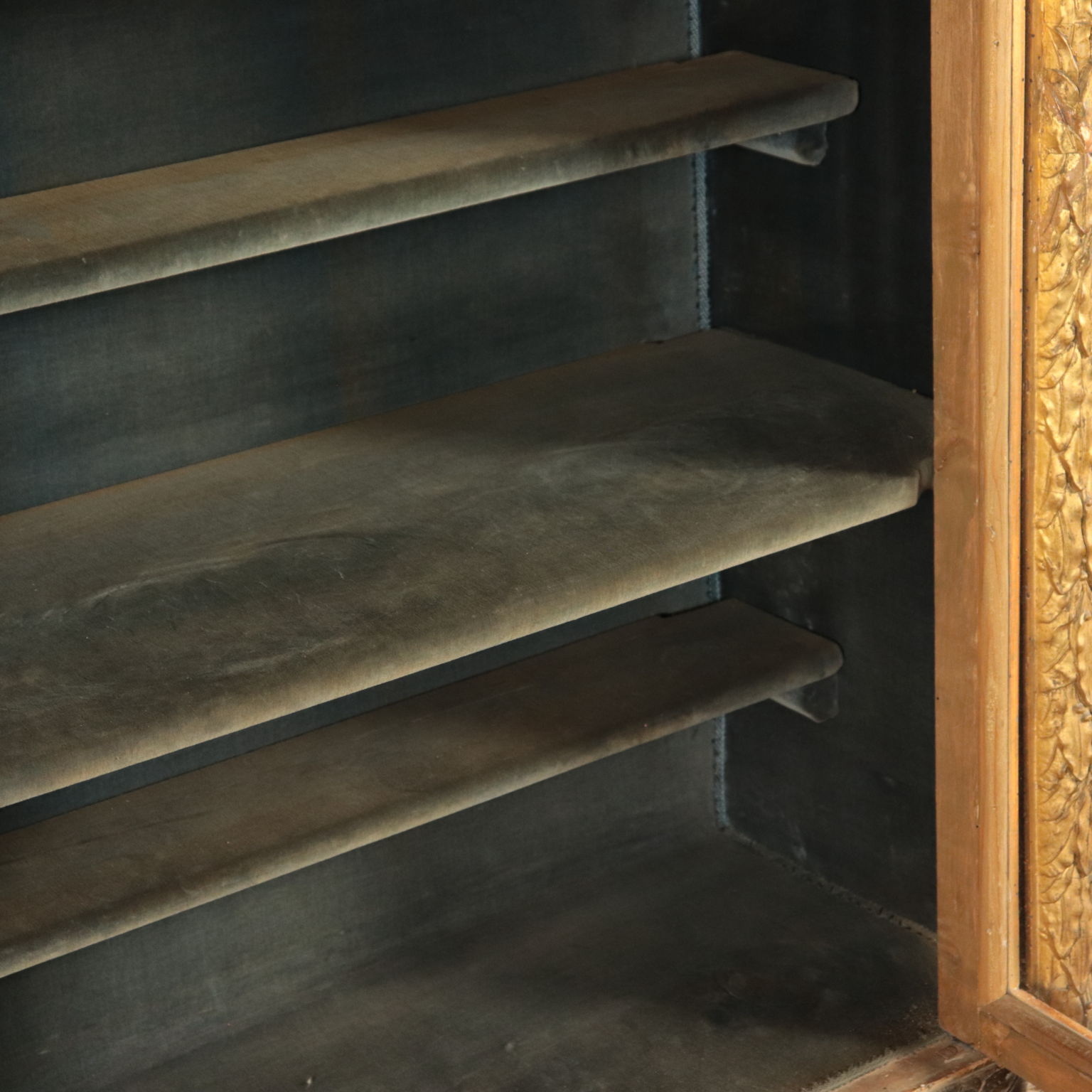 Escaparate de estilo Art Deco puertas con dos hojas de vidrio. Apoyado en cuatro patas, de las cuales el frente en la parte superior, el gabinete cuenta con un amplio marco tallado y pastillas y oro, que representa las hojas de laurel, el sabor, el Imperio, en el que existen varias deficiencias.
