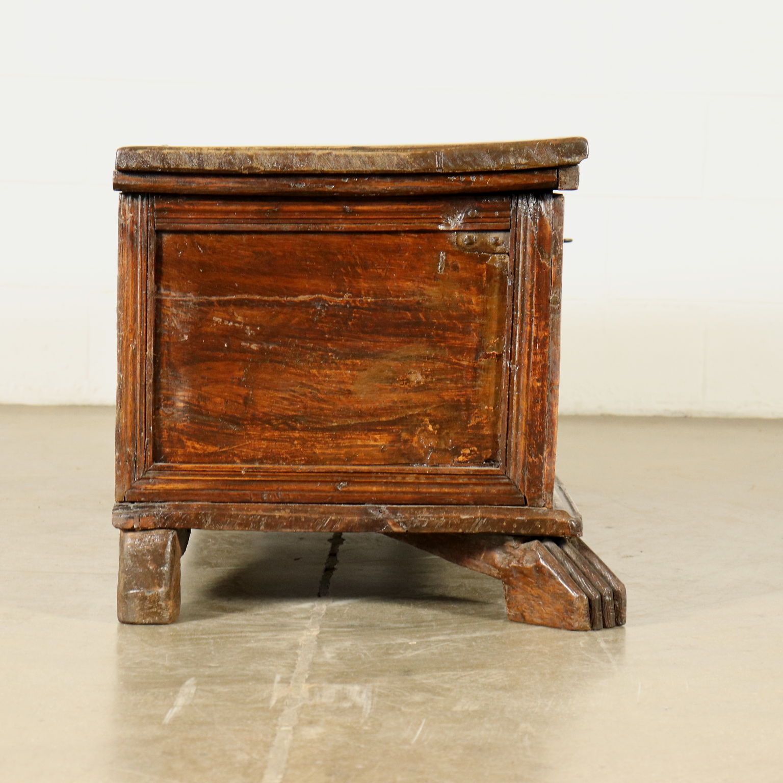 Sostenuta da quattro piedi leonini, il fronte è bipartito da eleganti cornici; la fascia sottopiano presenta una cornice dentellata. In legno di noce, la cassapanca è stata già interessata da restauri.