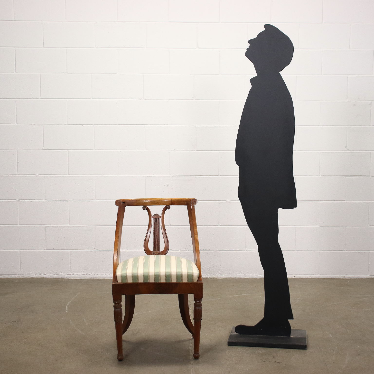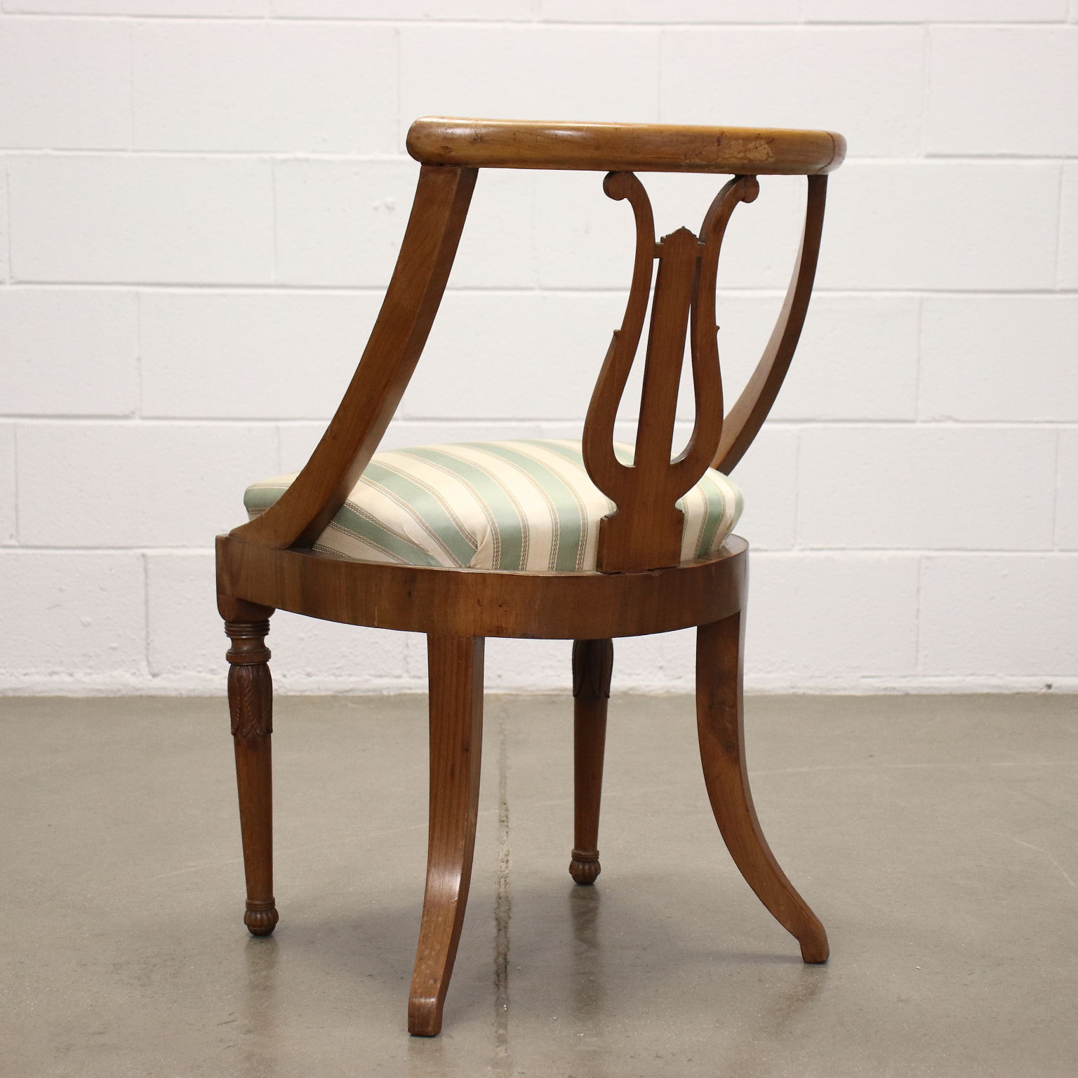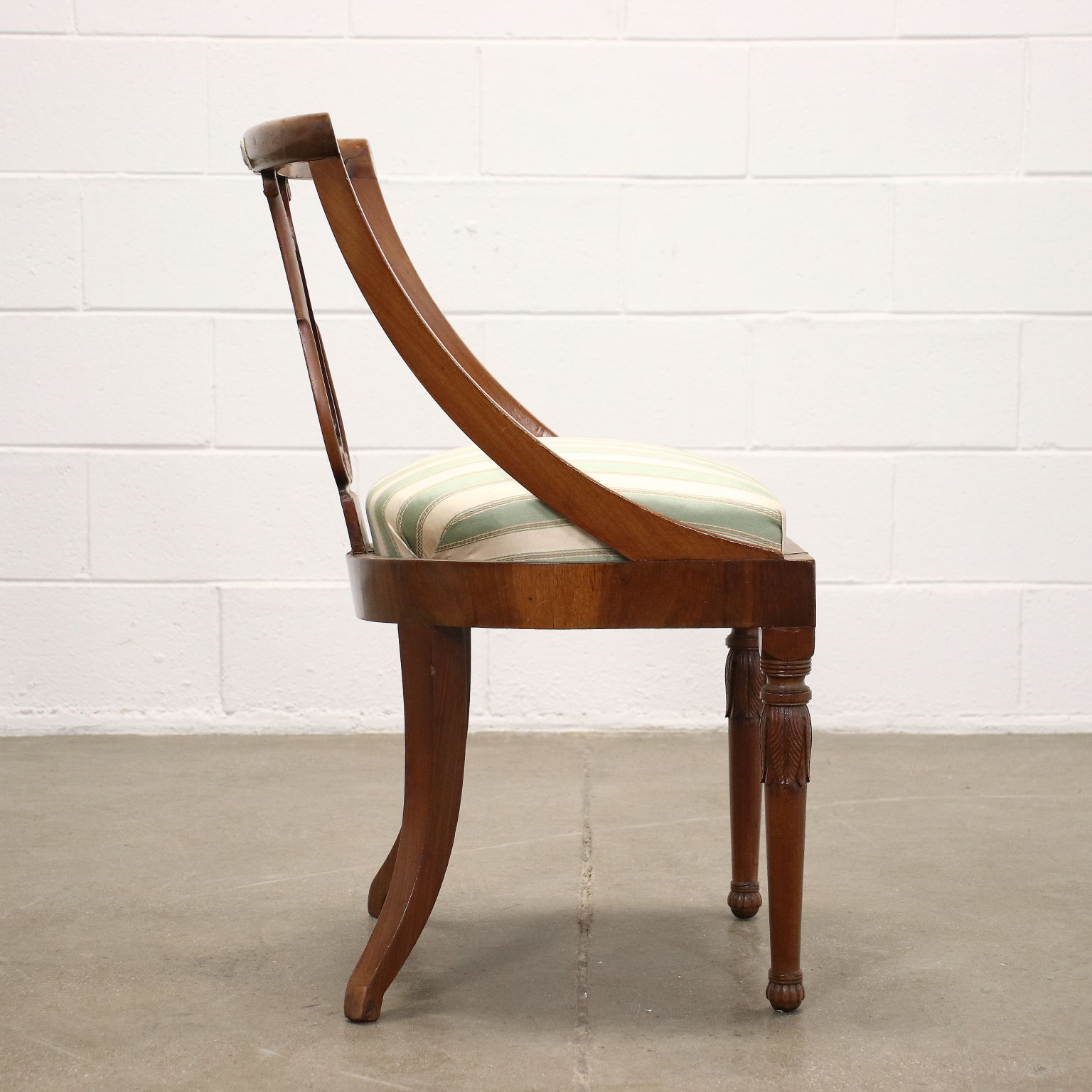 Grupo de tres sillas góndola Imperio, sustentadas sobre cuatro patas, de las cuales las traseras tienen forma de sable y las delanteras torneadas y talladas con motivos de hojas. El asiento está acolchado, el respaldo abierto está tallado y tiene forma de lira. Nuez.