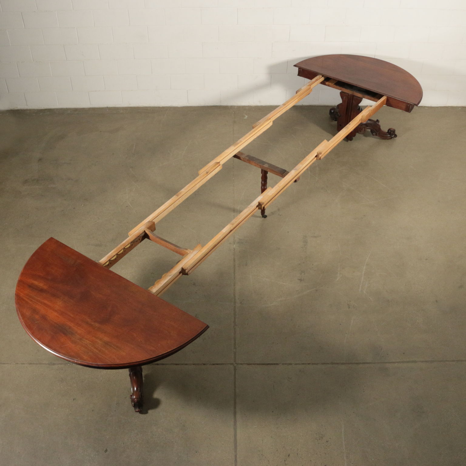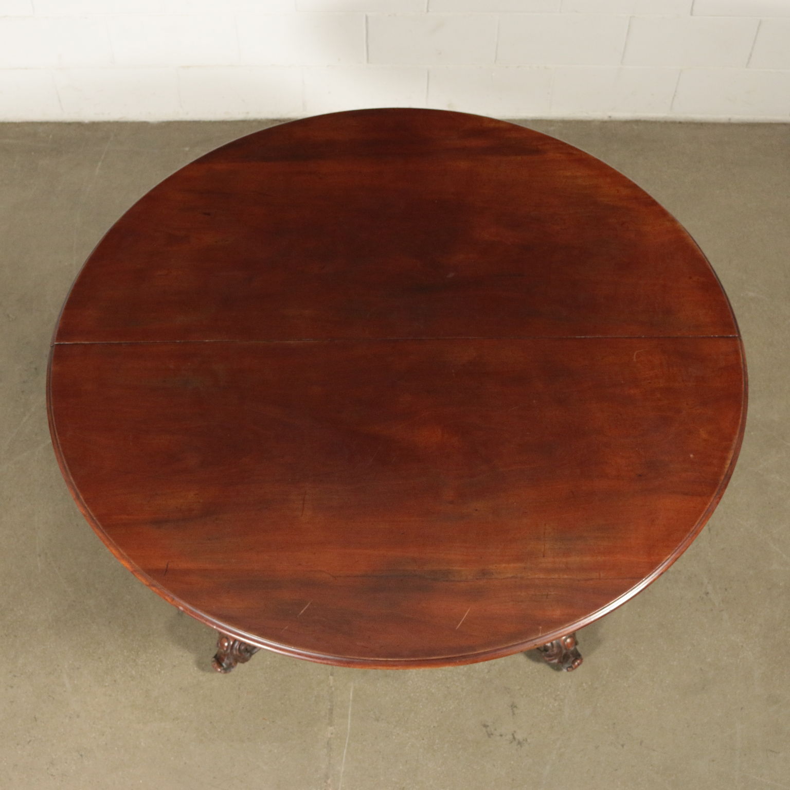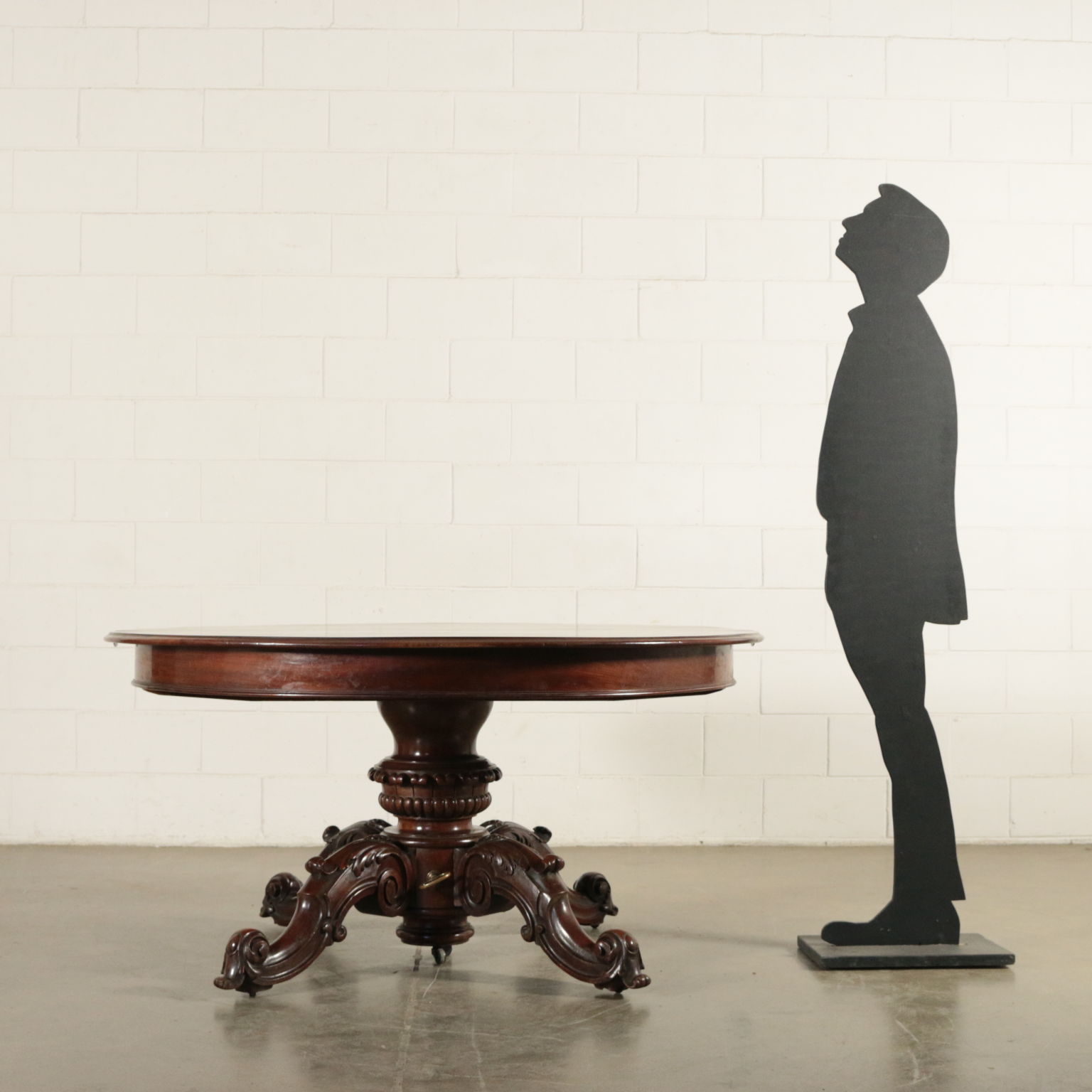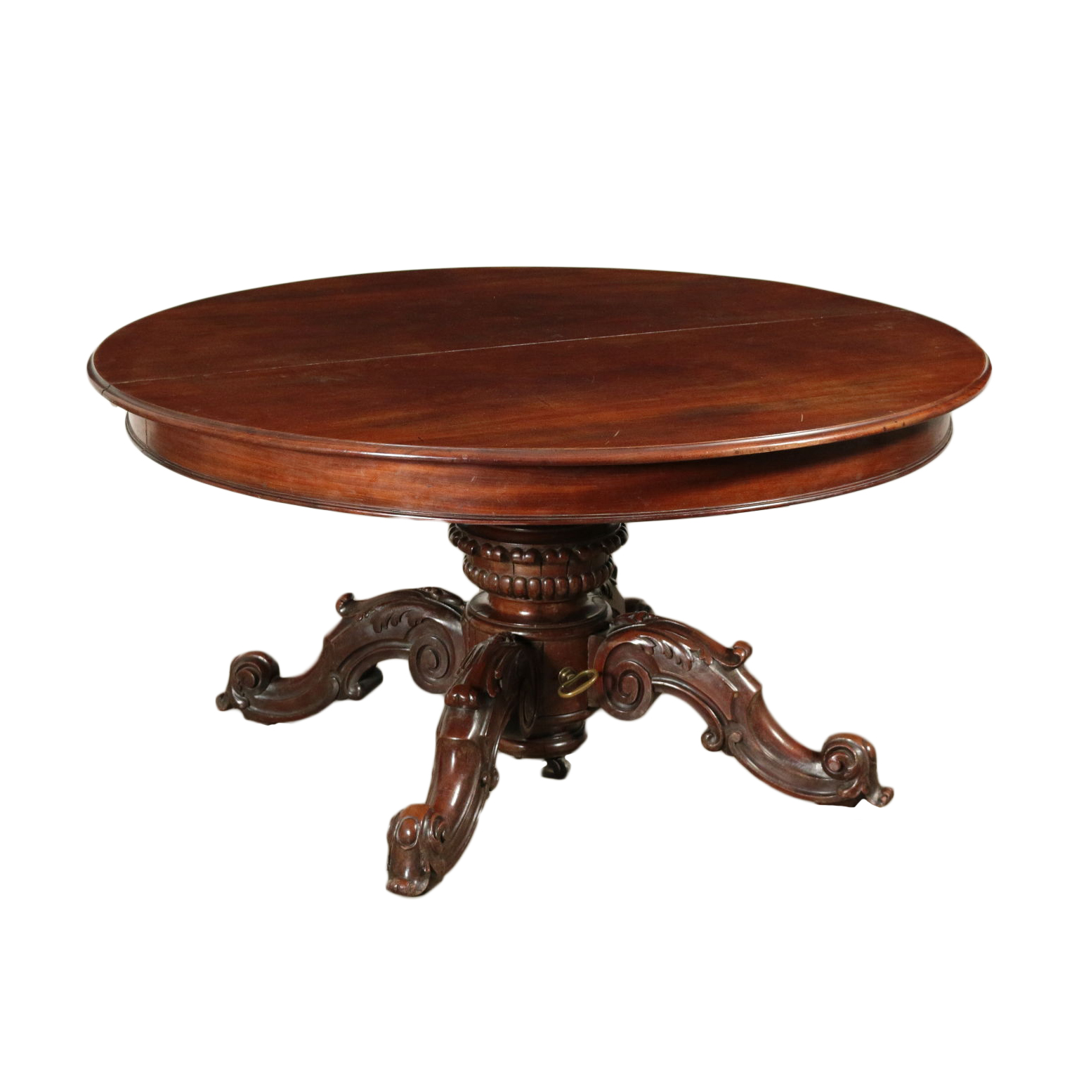 Grande tavolo vittoriano allungabile, sorretto da un balaustro centrale tornito e intagliato, dotato di quattro gambe mosse e anch'esse riccamente intagliate a ricciolo. Il piano circolare è apribile e consente l'innesto di due prolunghe, sostenute grazie all'ausilio di un ulteriore gamba tornita e dotata di rotella. In mogano, le prolunghe successive sono in pino.
