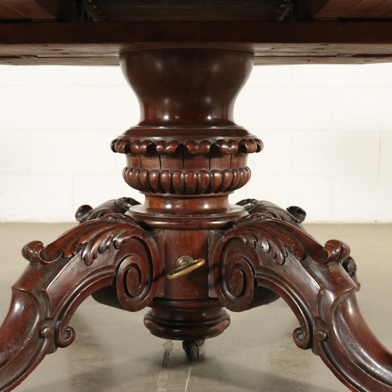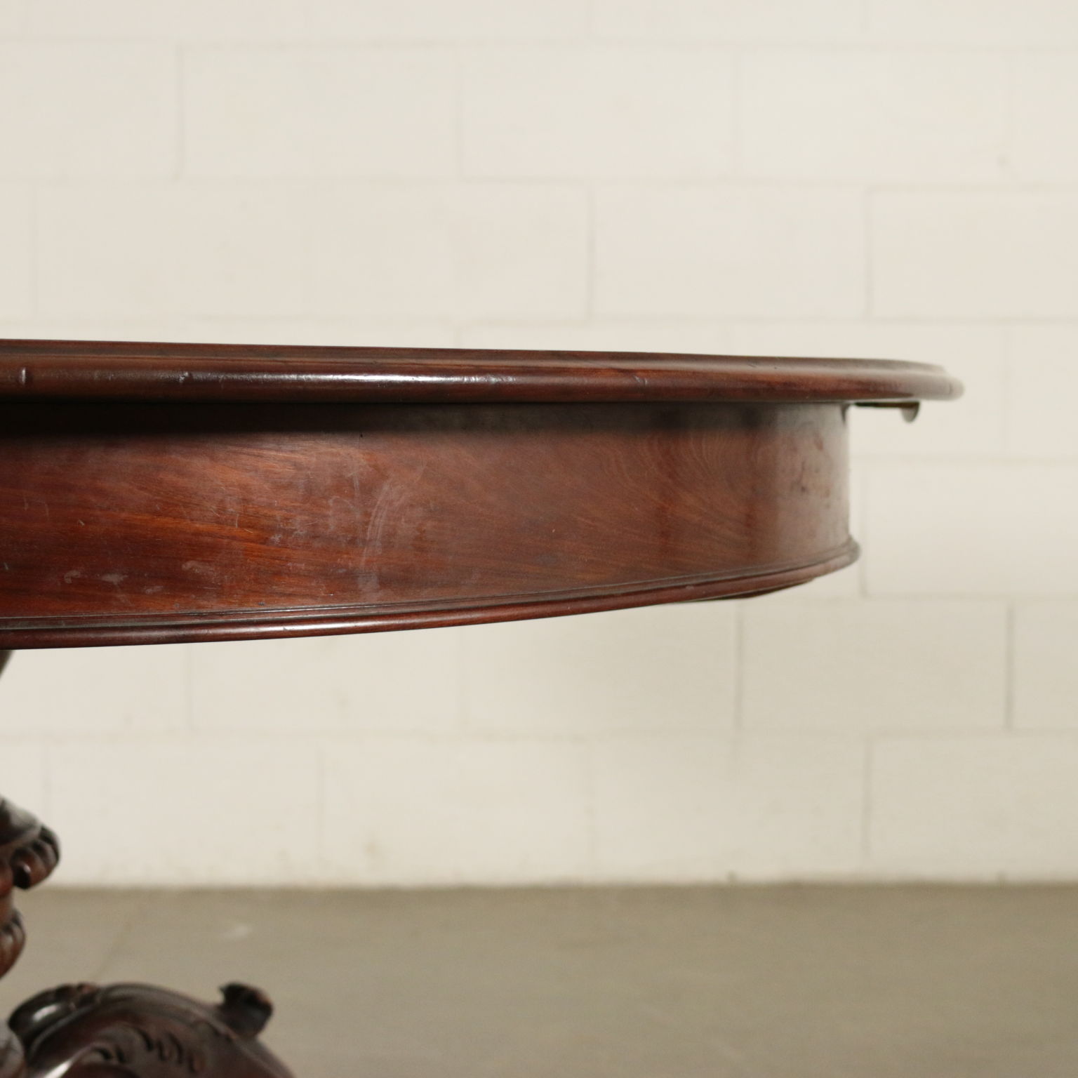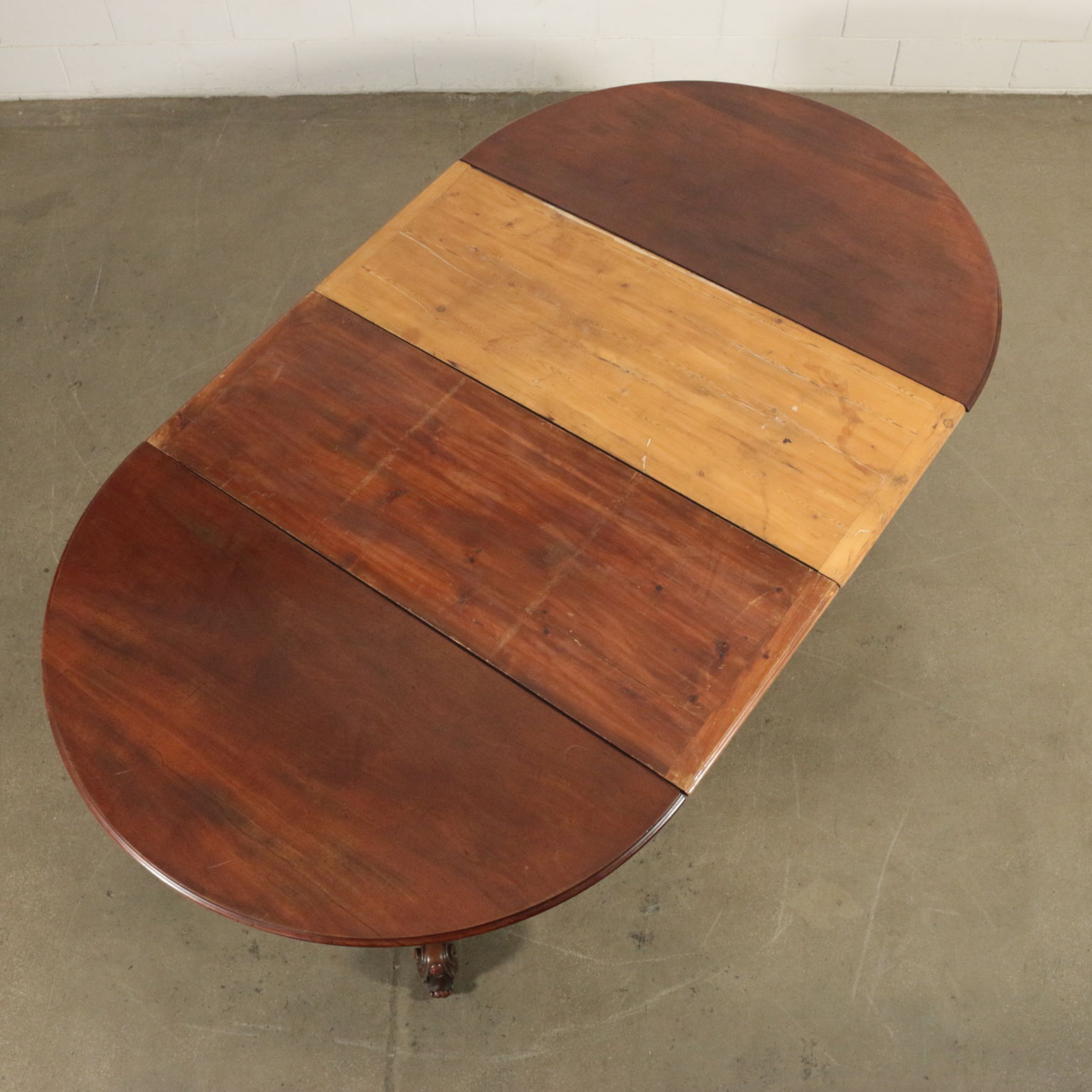 Grande tavolo vittoriano allungabile, sorretto da un balaustro centrale tornito e intagliato, dotato di quattro gambe mosse e anch'esse riccamente intagliate a ricciolo. Il piano circolare è apribile e consente l'innesto di due prolunghe, sostenute grazie all'ausilio di un ulteriore gamba tornita e dotata di rotella. In mogano, le prolunghe successive sono in pino.