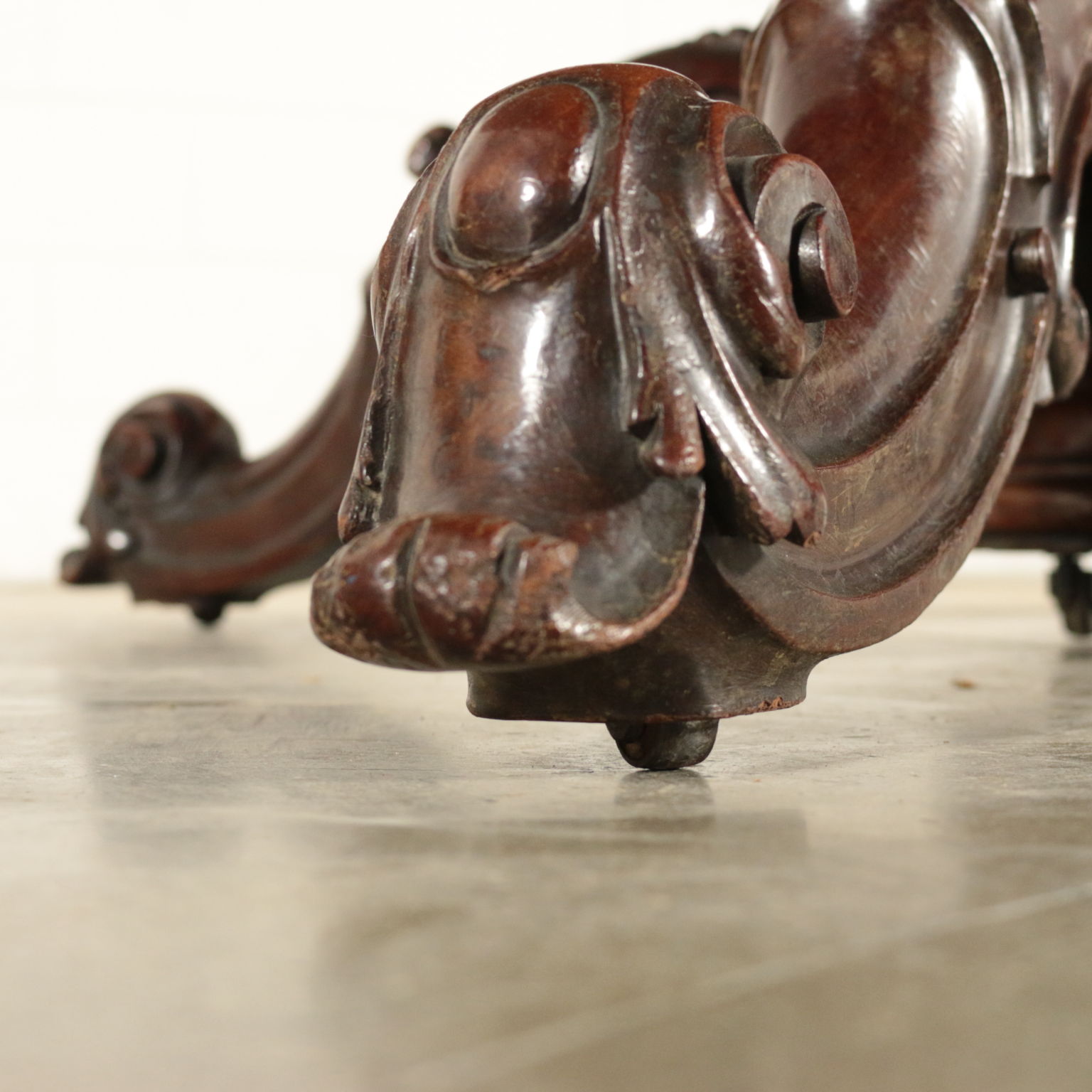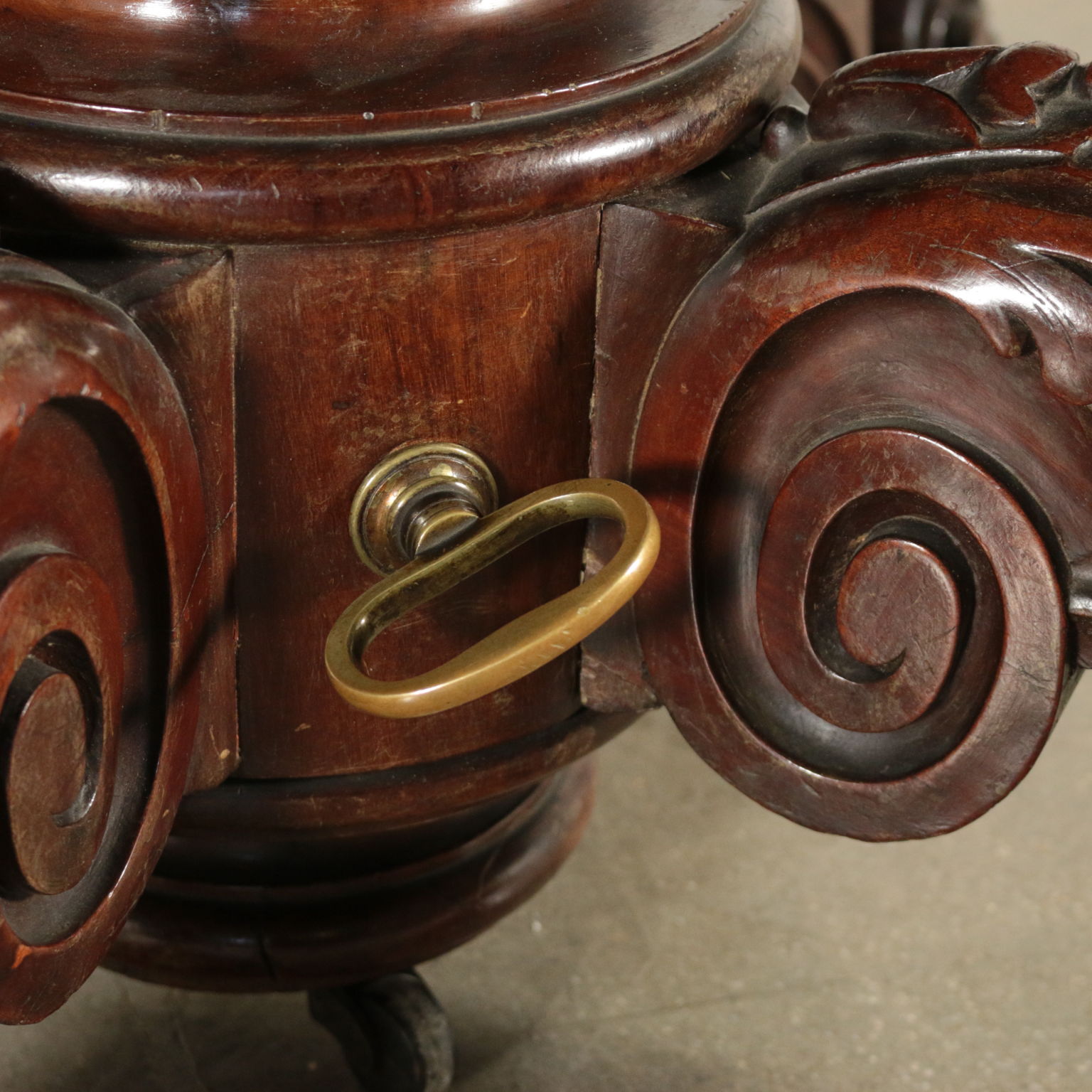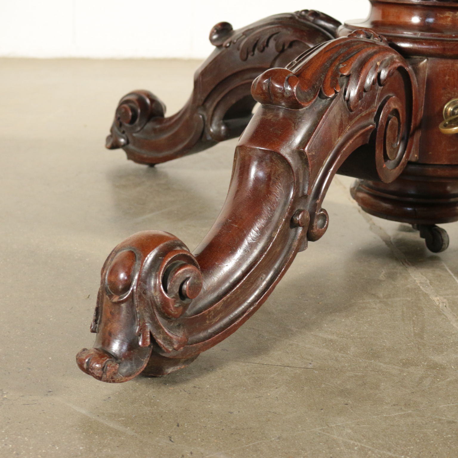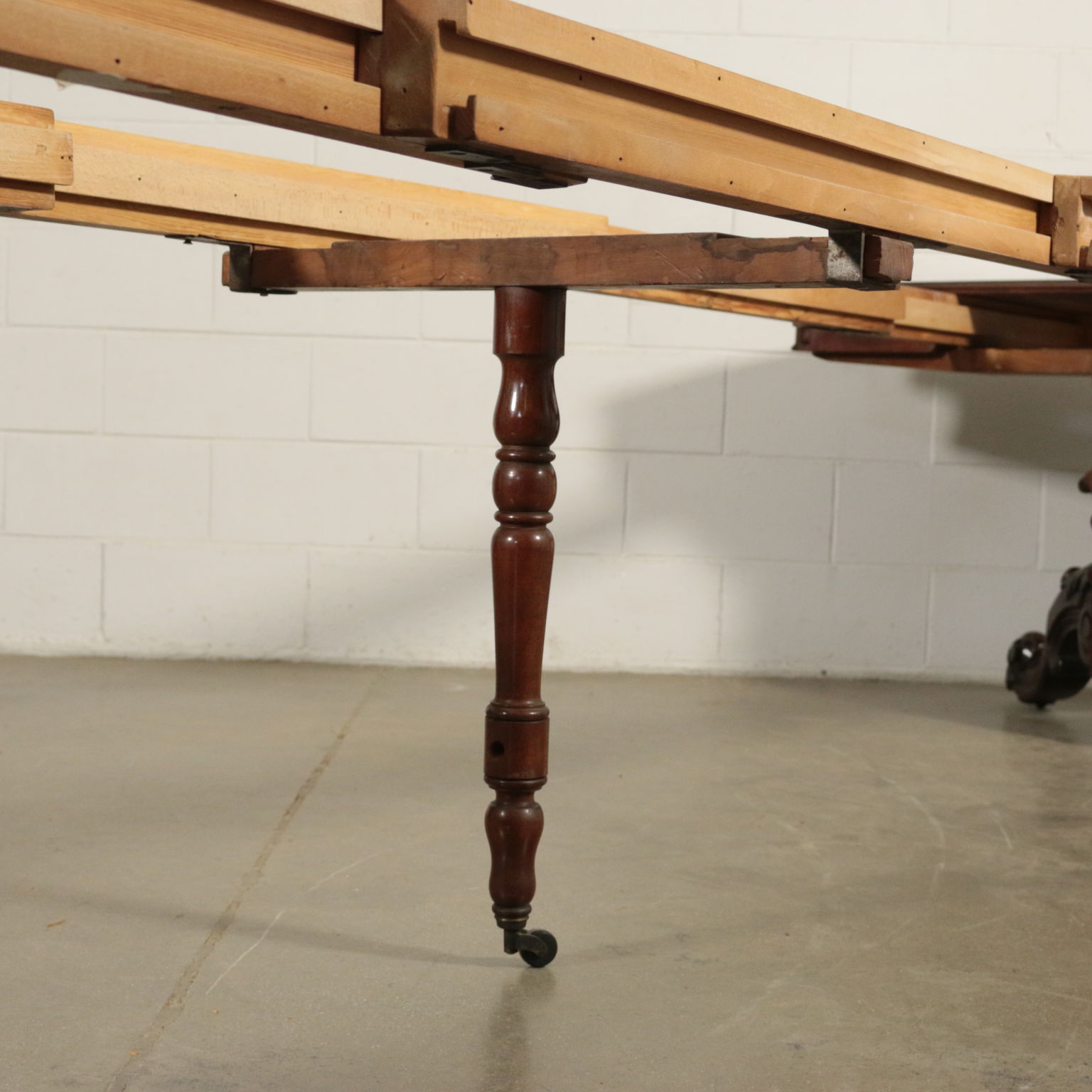 Grande tavolo vittoriano allungabile, sorretto da un balaustro centrale tornito e intagliato, dotato di quattro gambe mosse e anch'esse riccamente intagliate a ricciolo. Il piano circolare è apribile e consente l'innesto di due prolunghe, sostenute grazie all'ausilio di un ulteriore gamba tornita e dotata di rotella. In mogano, le prolunghe successive sono in pino.