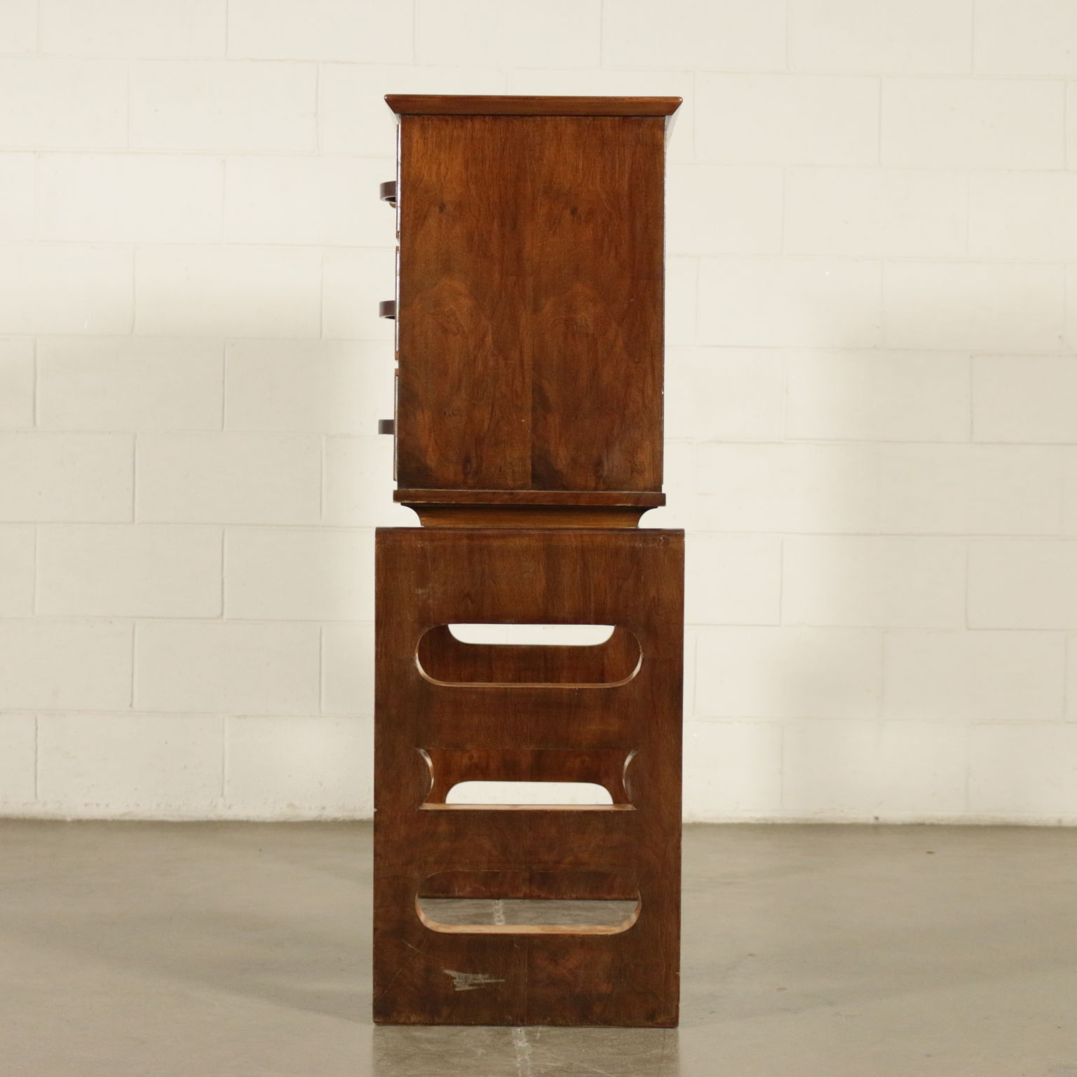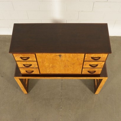 Mobile bar con vano centrale ad apertura a ribalta, doppie ante battenti laterali a finti cassetti. Legno impiallacciato noce e radica.
