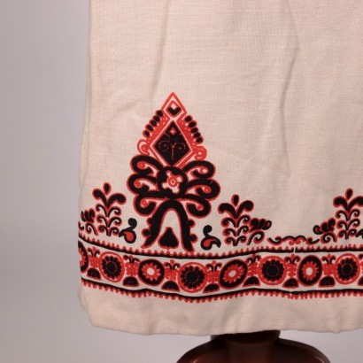Vestido de fiesta Valentino en lino crudo blanco crema, con diseños geométricos en rojo y negro en la parte inferior de la falda. Este espléndido vestido se puede fechar alrededor de 1965: la etiqueta interna aún no lleva la V del logo de Valentino que se utilizará en los años siguientes. El modelo es particular: la falda corta está cosida al corpiño, pero va acompañada de un cruzado "sobre falda". El corpiño está enriquecido con tres botones importantes. El tamaño corresponde a un italiano 40 (largo 117cm, cintura 62cm).
