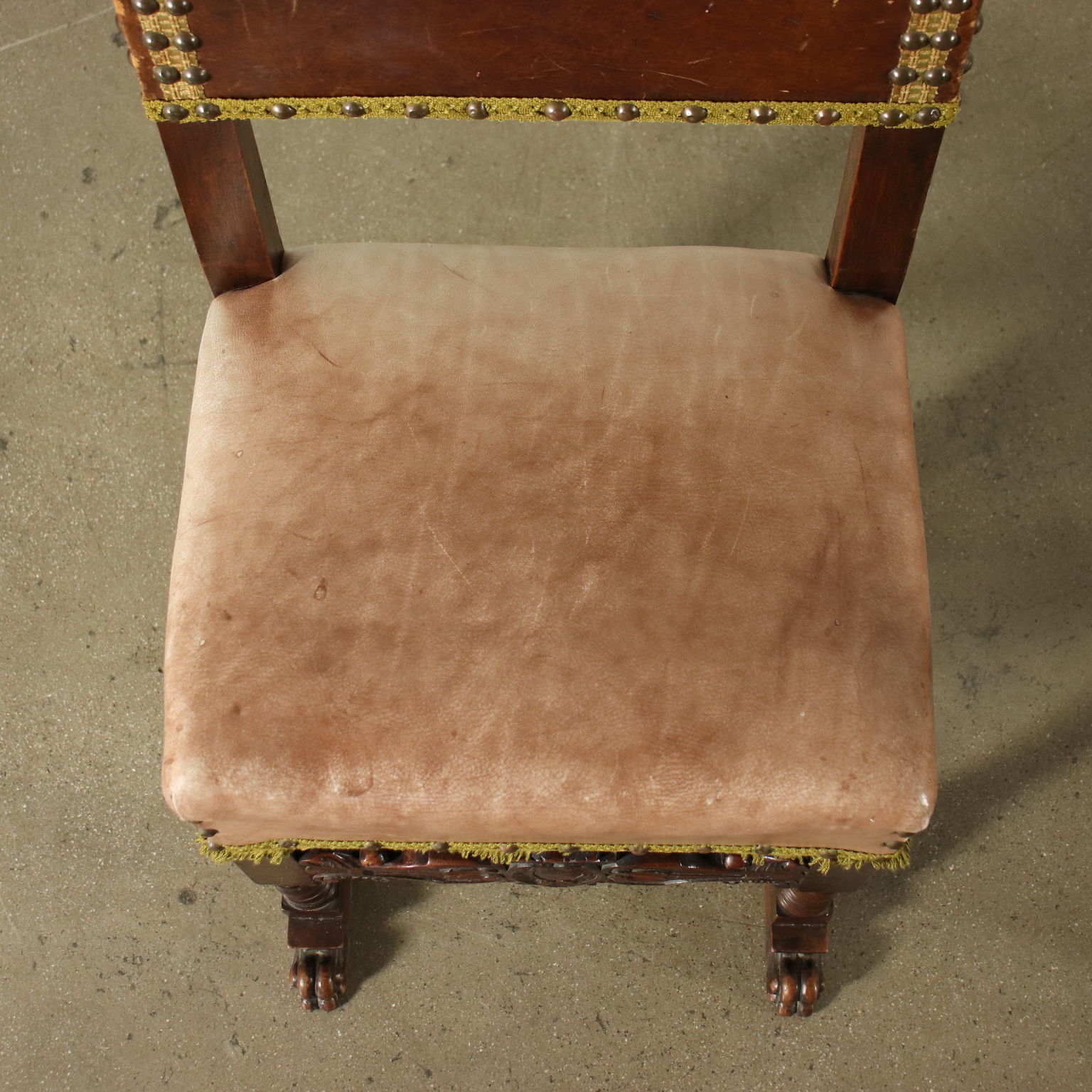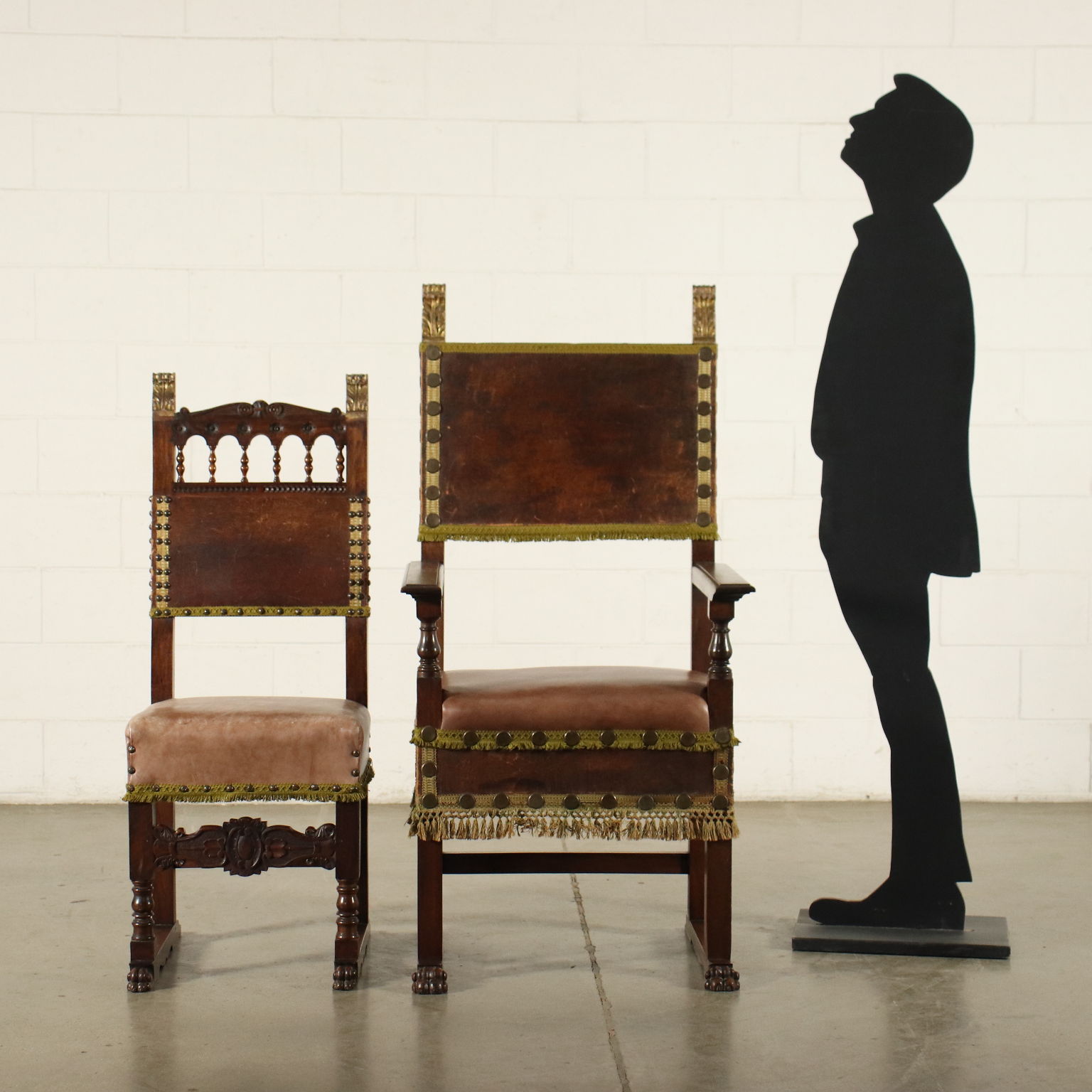 Grupo formado por cuatro sillas y un sillón neorrenacentista, en nogal tallado. Sustentado por patas conectadas por travesaños, de los cuales el del frente está tallado con frondosas volutas; la parte superior del respaldo también está labrada con arcos sucesivos (solo en las sillas) y, en la parte superior de los montantes, con dos volutas de hojas doradas. El asiento está acolchado y forrado en piel, mientras que la banda del respaldo es de cartón trabajado con símil piel.