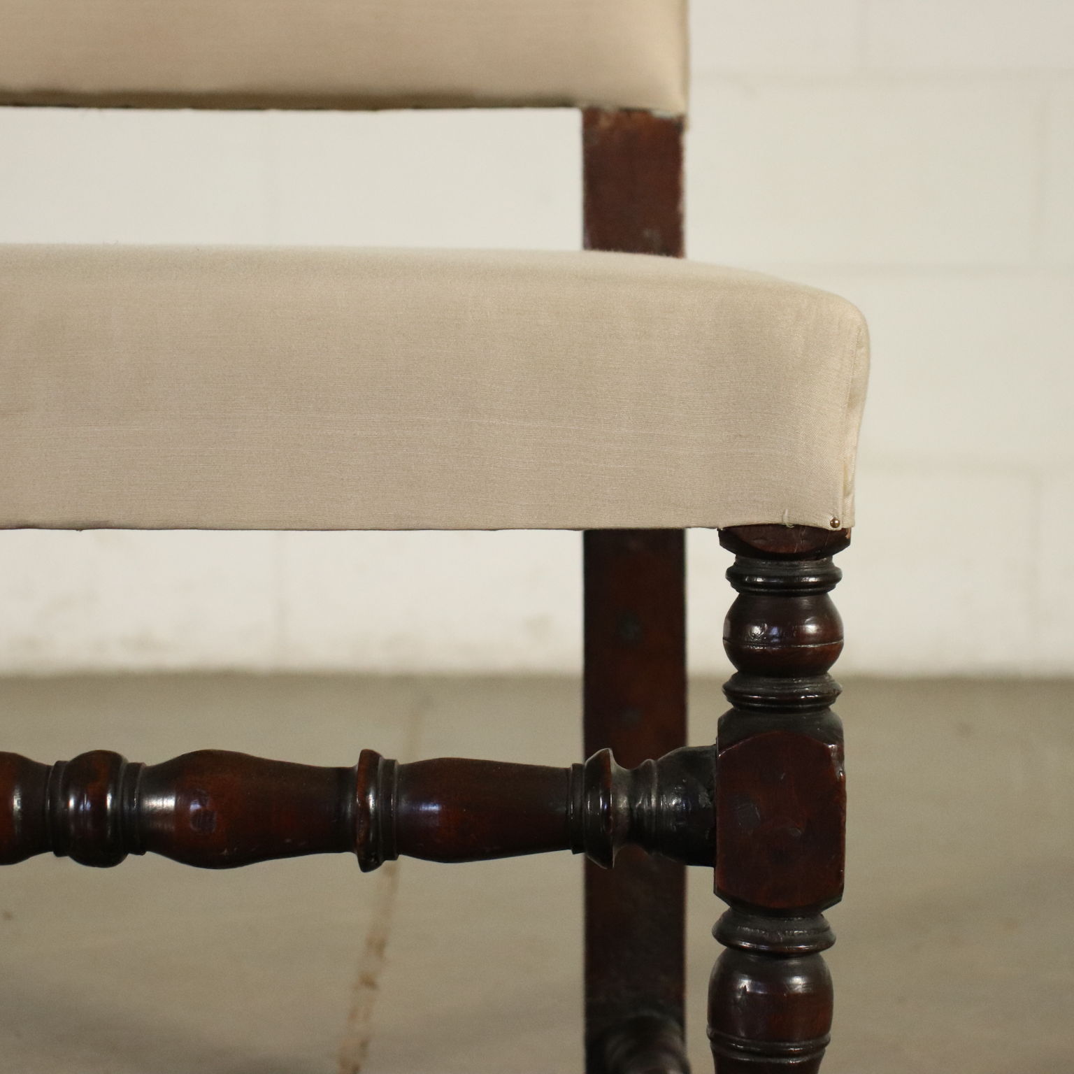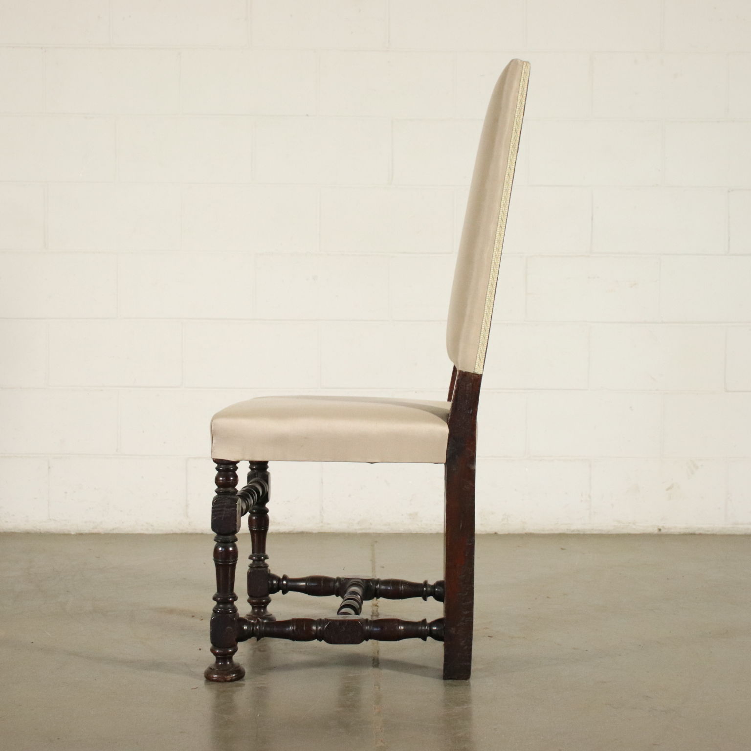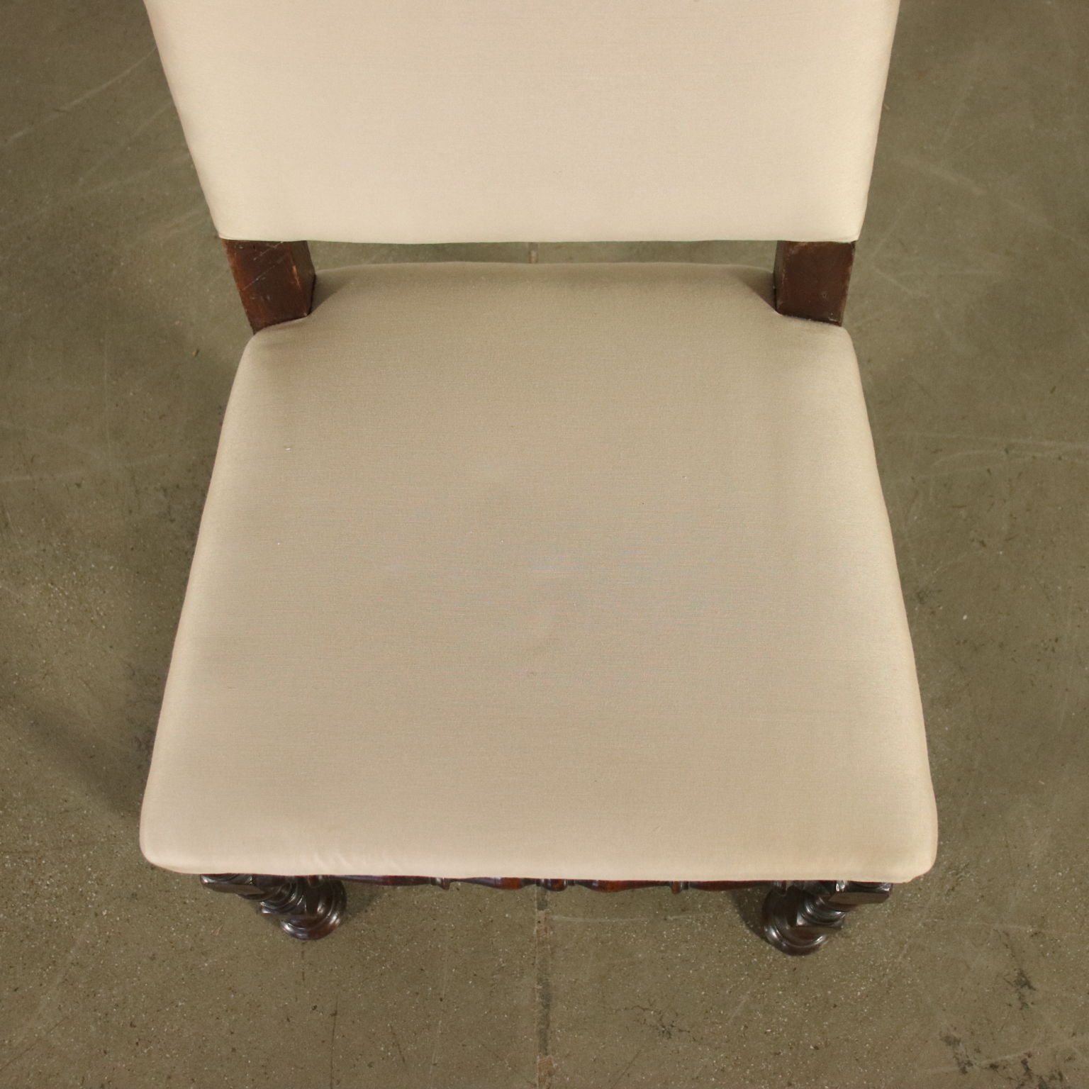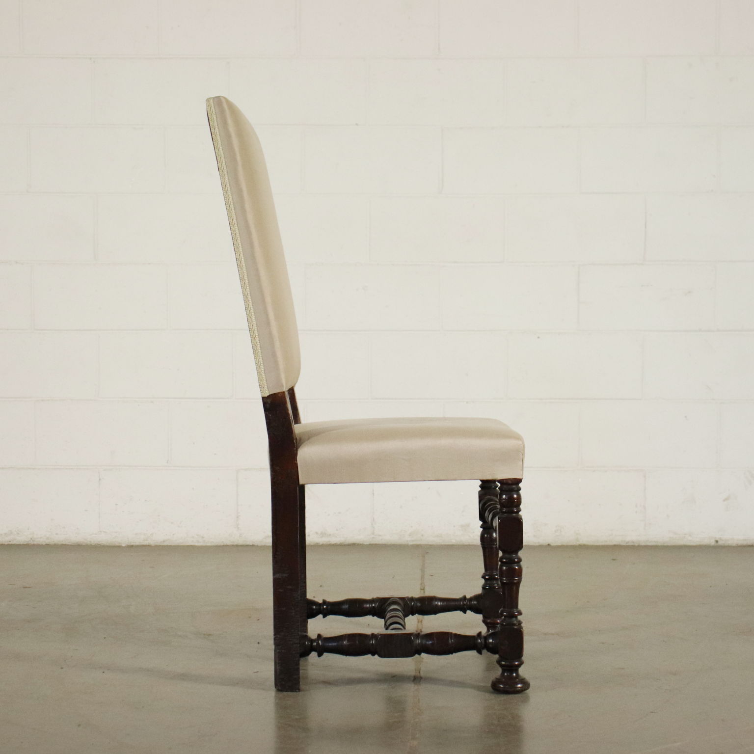 Grupo de seis sillones de carrete de nogal, el asiento y el respaldo elevado han sido tapizados recientemente.