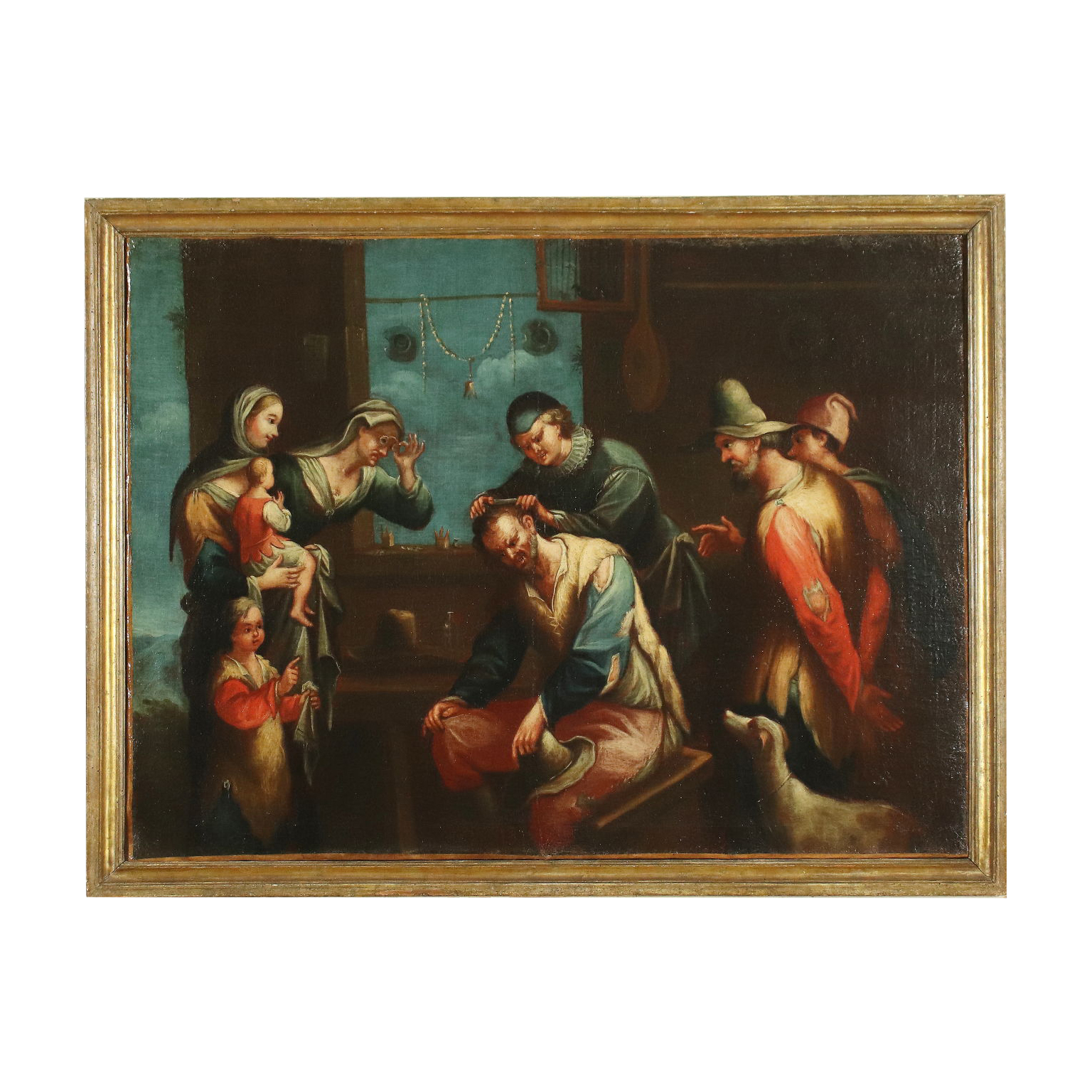 Óleo sobre lienzo. Escuela centroeuropea. La escena se sitúa en el taller de un barbero, que se afana en cortar el pelo a un hombre bajo la atenta mirada de otros clientes y, sobre todo, de algunas mujeres con niños, una de las cuales incluso observa el resultado del trabajo con gafas. Las gafas en el arte se introdujeron primero como signo de distinción, y después también como signo de atención científica, delineando progresivamente la figura del erudito, del médico y del cirujano: en este lienzo subrayan de hecho la ironía de la escena, ¡utilizadas como instrumento para un atento examen femenino del corte de pelo del cónyuge! Toda la escena está poblada por las figuras, pintadas de forma tosca y casi grotesca, con sus expresiones y poses muy marcadas, casi teatrales, acentuadas también por los colores vivos. Por estas características, el cuadro encaja bien en la producción de escenas de género inspiradas en la vida popular en sus momentos más vivos y característicos, que se generó a partir del siglo XVII en Europa central, especialmente en los Países Bajos, para sustituir la pintura naturalista y religiosa por temas más ligeros, y que en Italia encontró una expresión particular en la «Scuola dei bamboccianti», desarrollada en Roma por pintores flamencos e italianos. El cuadro ha sido restaurado y enmarcado de nuevo. Se presenta en un marco de época.