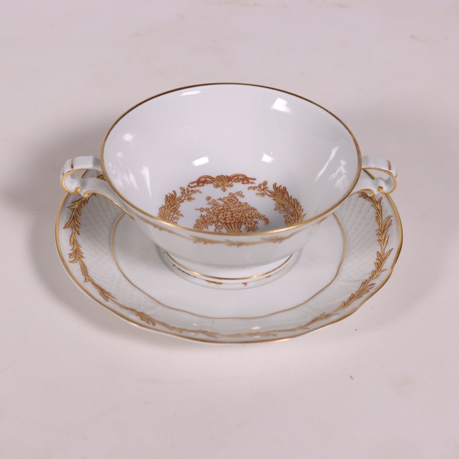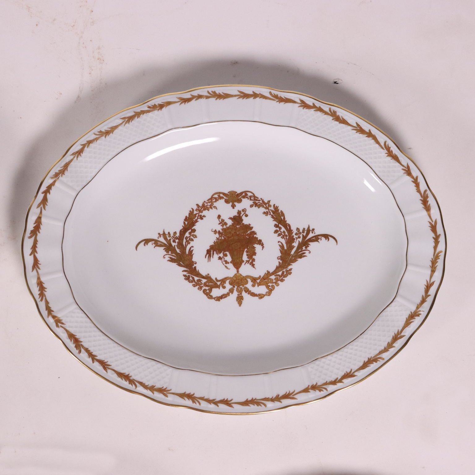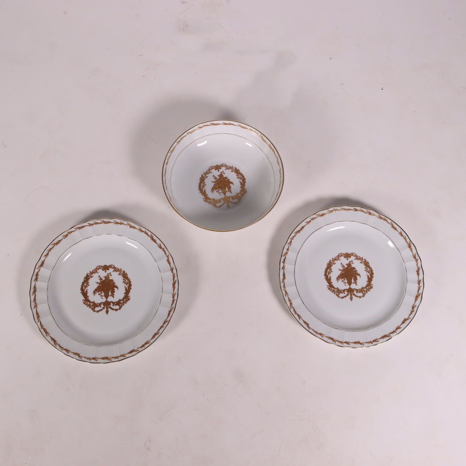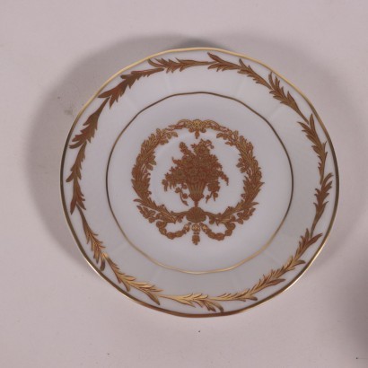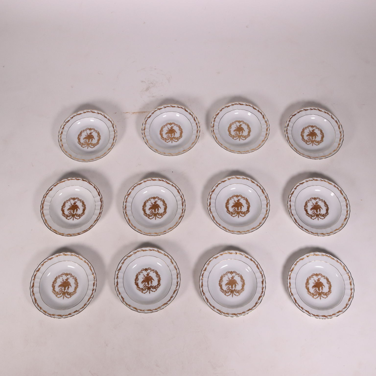 Porcelana establece L. & C. Bernardaud Limoges con decoración de Lulli, similar al servicio realizado por la visita a Francia por la reina Isabel II de Inglaterra, en abril de 1957. Conjunto de cena que consiste en: dos soperas, una salsera, treinta y seis de la cena platos, doce platos hondos, doce platos de frutas, una ensaladera, dos platos redondos y cinco platos ovalados. Servicio de café para doce personas y servicio de consomé para doce personas.