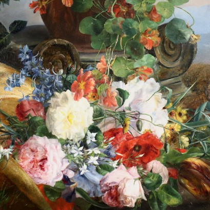 Descripción : Natura morta con fiori, pianta in vaso e capitello