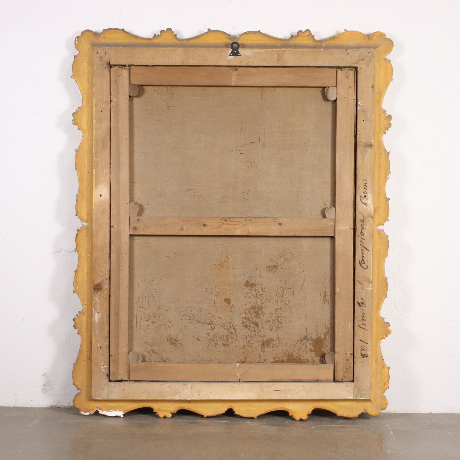 Pintura al óleo sobre lienzo. Escuela lombarda del siglo XIX. La composición ofrece un ramo de flores de colores que emergen de un sombrero de paja toquilla colocado en el suelo, mientras que, apoyada en un capitel, una cascada de ramas verdes con flores rojas emerge de otro jarrón. Al fondo, un paisaje árido, con montañas a lo lejos, mientras el cielo azul es invadido por nubes grises. La obra, sin firmar, se acerca mucho a la manera de Luigi Scrosati (1814-1869), el pintor milanés que se distinguió por las representaciones de bodegones florales. El cuadro se presenta en un bello marco coetáneo dorado, en madera y tablilla modelada con cenefas.
