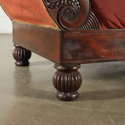 Sofá barco de restauración en caoba, acolchado y con pies, brazos y delantal tallados con motivos espirales y fitomórficos.