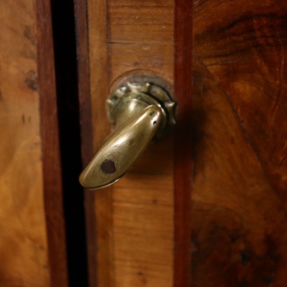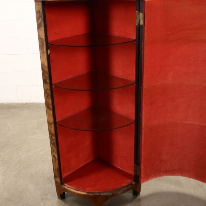 Descripción Armario de esquina realizado superponiendo dos armarios de esquina neoclásicos venecianos, obteniendo una sola puerta en el frente en forma de media luna; chapa de brezo, con hilos de amaranto.