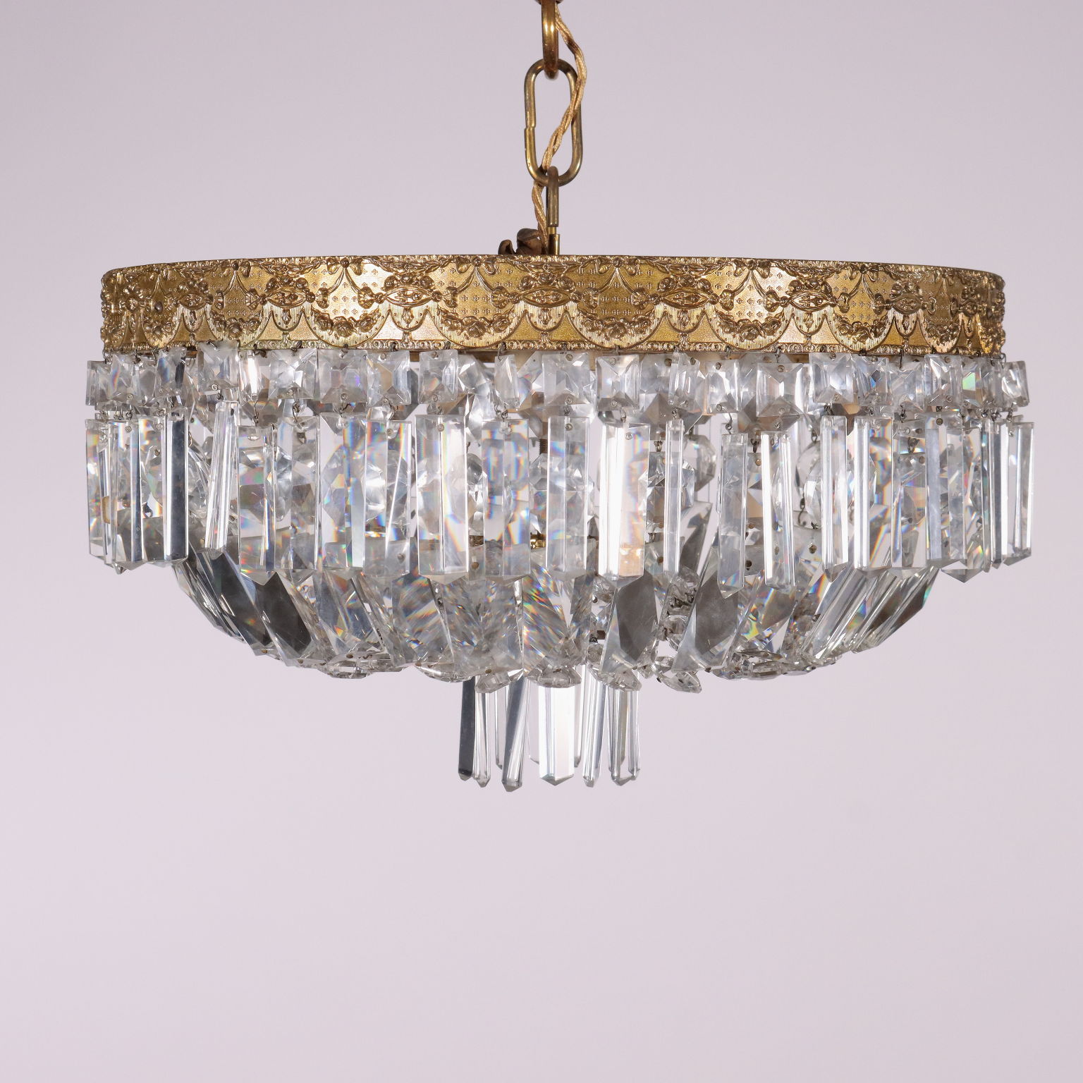 Araña de luces de estilo imperio de 6 luces, realizada en chapa dorada en relieve con collares y colgantes de vidrio tipo Baccarat.