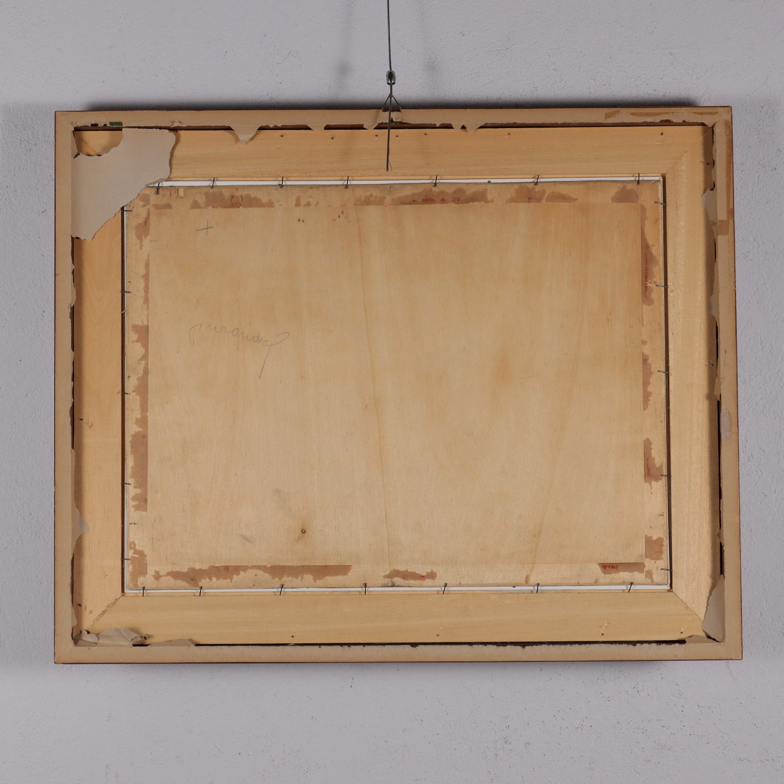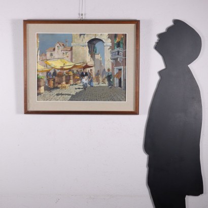 Óleo sobre madera contrachapada. Firmado abajo a la derecha. El escorzo ocupa una esquina de la plaza del mercado de la ciudad, cerca de un arco de las murallas. La plaza está animada por una multitud colorida. El autor es un artista de Trieste que se especializa en vislumbres de su ciudad y de Venecia. Trabajadores en el marco.