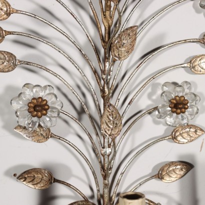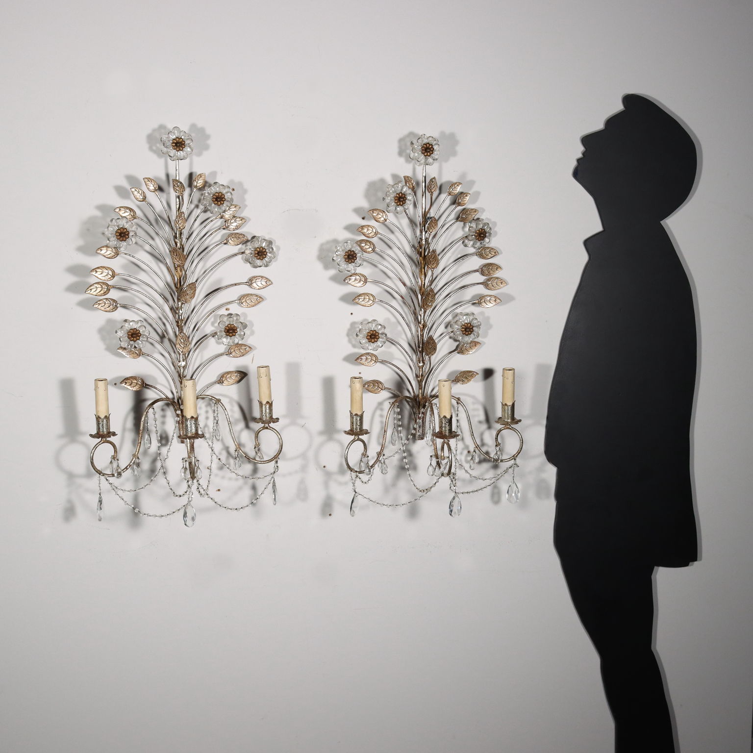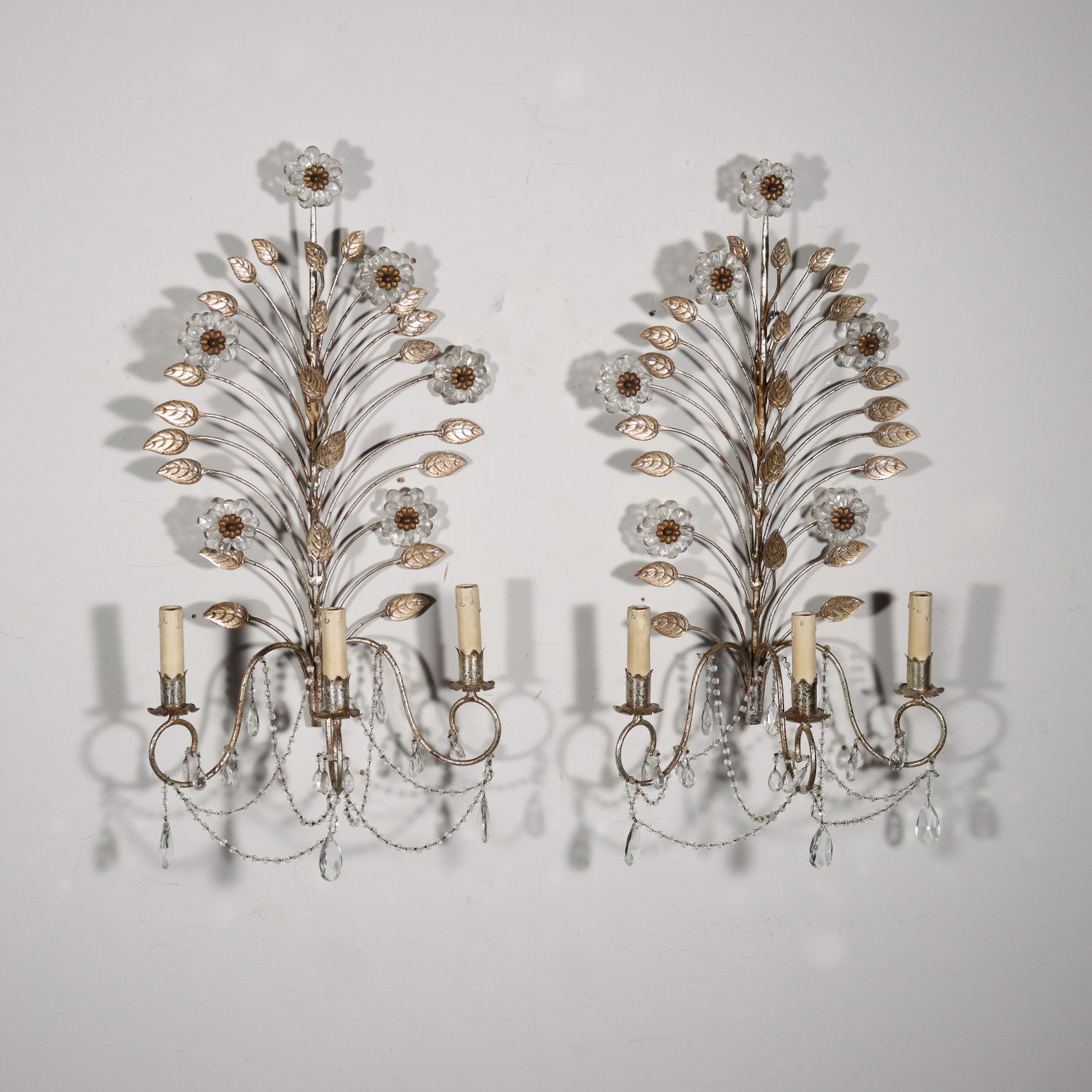 Par de apliques al estilo de Maison Bagues con tres luces, están adornados con collares y colgantes de vidrio, decoraciones frondosas y florales acabadas en pasta de vidrio.