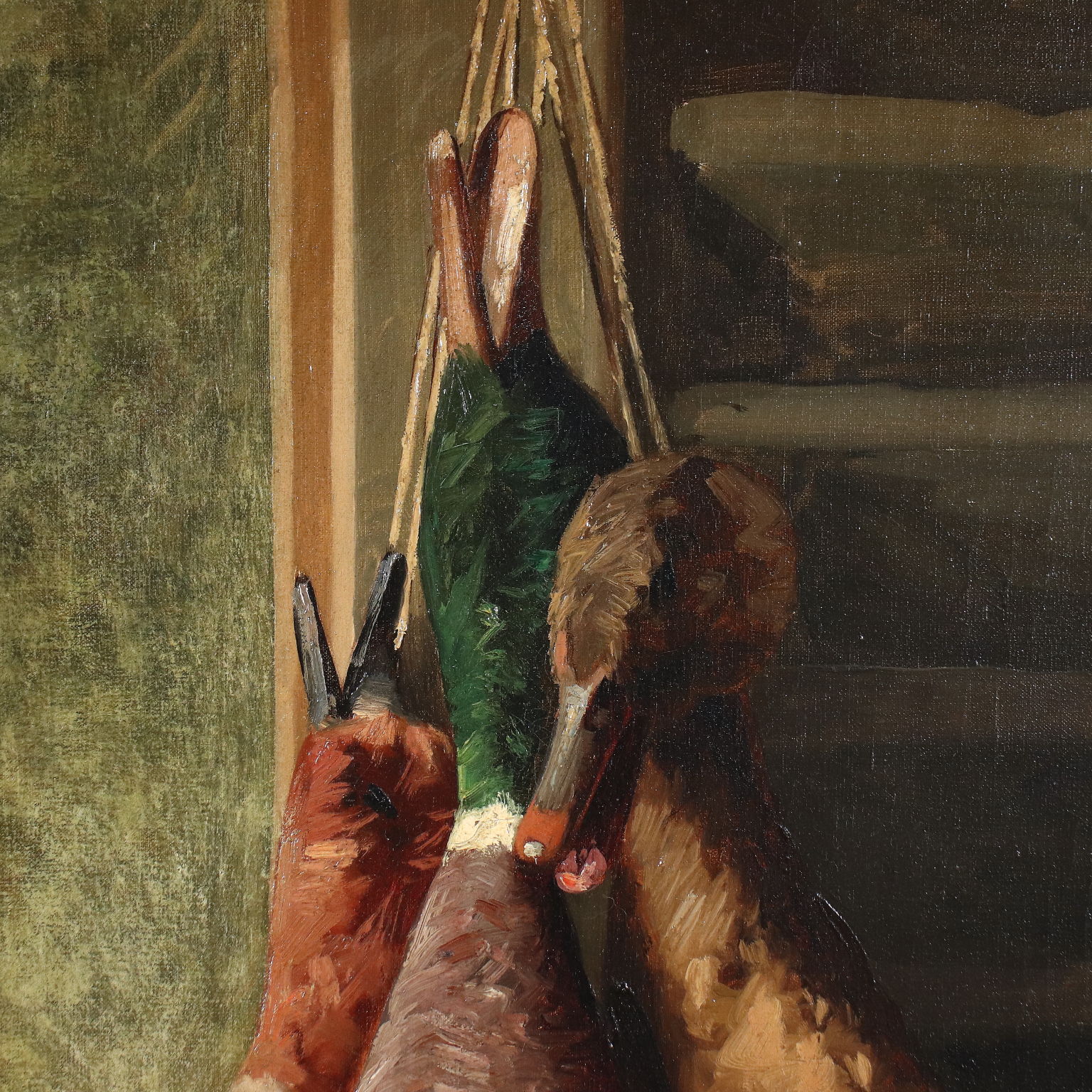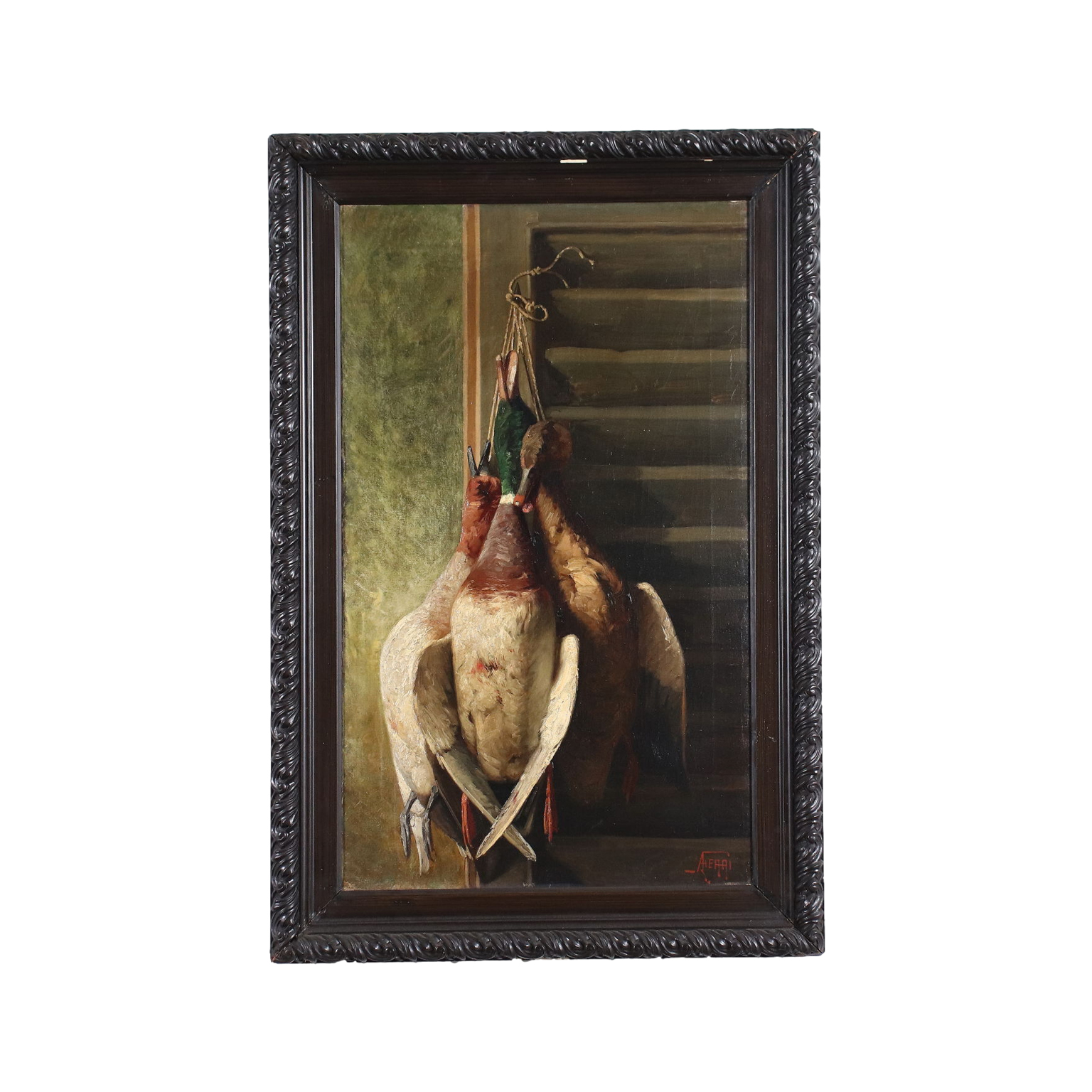Pintura al óleo sobre lienzo. Firmado abajo a la derecha. Tres patos cazados cuelgan del cuello de una contraventana. Augusto Antonio Ferri fue un escenógrafo y pintor italiano. Primero siguió los pasos de su padre y después de que consiguiera el puesto en el Théâtre Italien de París en 1851. Trasladándose a Madrid en 1857 en compañía de otros dos pintores, pronto se convirtió en el escenógrafo más admirado de España. Gracias a una amplia renovación, llevó el teatro español a un nivel europeo. En 1870 abandonó España y, tras colaborar unos años con su padre, en 1875 se retiró a Bolonia, dedicándose exclusivamente a la pintura. Su producción pictórica contempla naturalezas muertas en colores vivos, ciertamente influenciadas en el corte y en los planos por su formación como escenógrafo. La pintura se presenta en un marco contemporáneo.