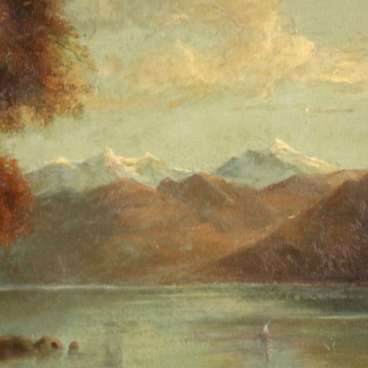 Óleo sobre madera contrachapada. Finales del siglo XIX y principios del siglo XX. Este paisaje recuerda al norte de Italia, con un lago en primer plano, bajo colinas prealpinas, detrás de las cuales emergen picos nevados; en la orilla del lago dos figuras. La pintura tiene unas gotas de color muy pequeñas. Se presenta en un marco coetáneo (finales del siglo XIX y principios del XX).