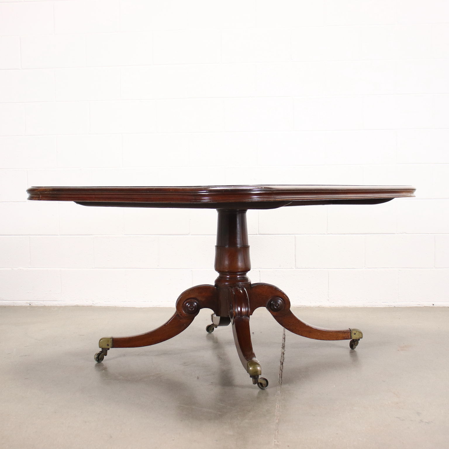 Mesa victoriana de caoba con balaustre central torneado, patas onduladas y pies con ruedas.