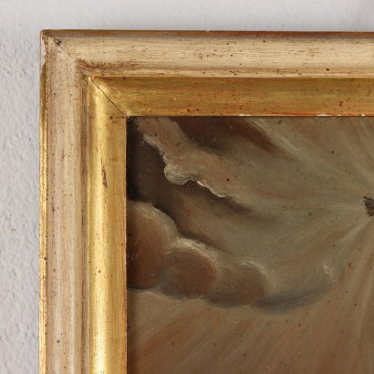 Óleo sobre chapa. Debajo la fecha de agosto de 1845 y un nombre no identificado. El cuadro forma parte de una serie que narra episodios evangélicos. En esta escena se representa el episodio de Pentecostés, cuando el Espíritu Santo desciende sobre los Apóstoles y sobre María en forma de llamas de fuego. La obra se presenta en un marco de estilo de mediados del siglo XX.