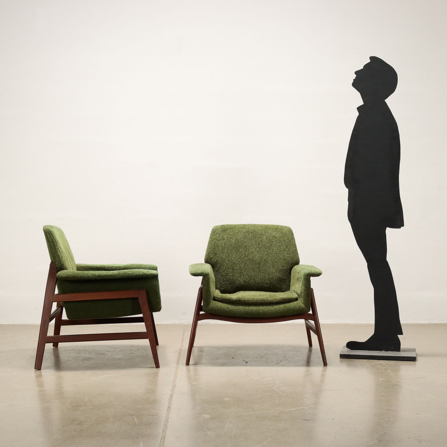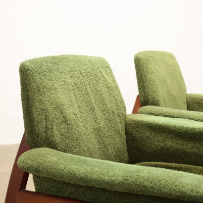 Par de sillones, acolchado de espuma, tapizado de tela, estructura de madera de Teca.