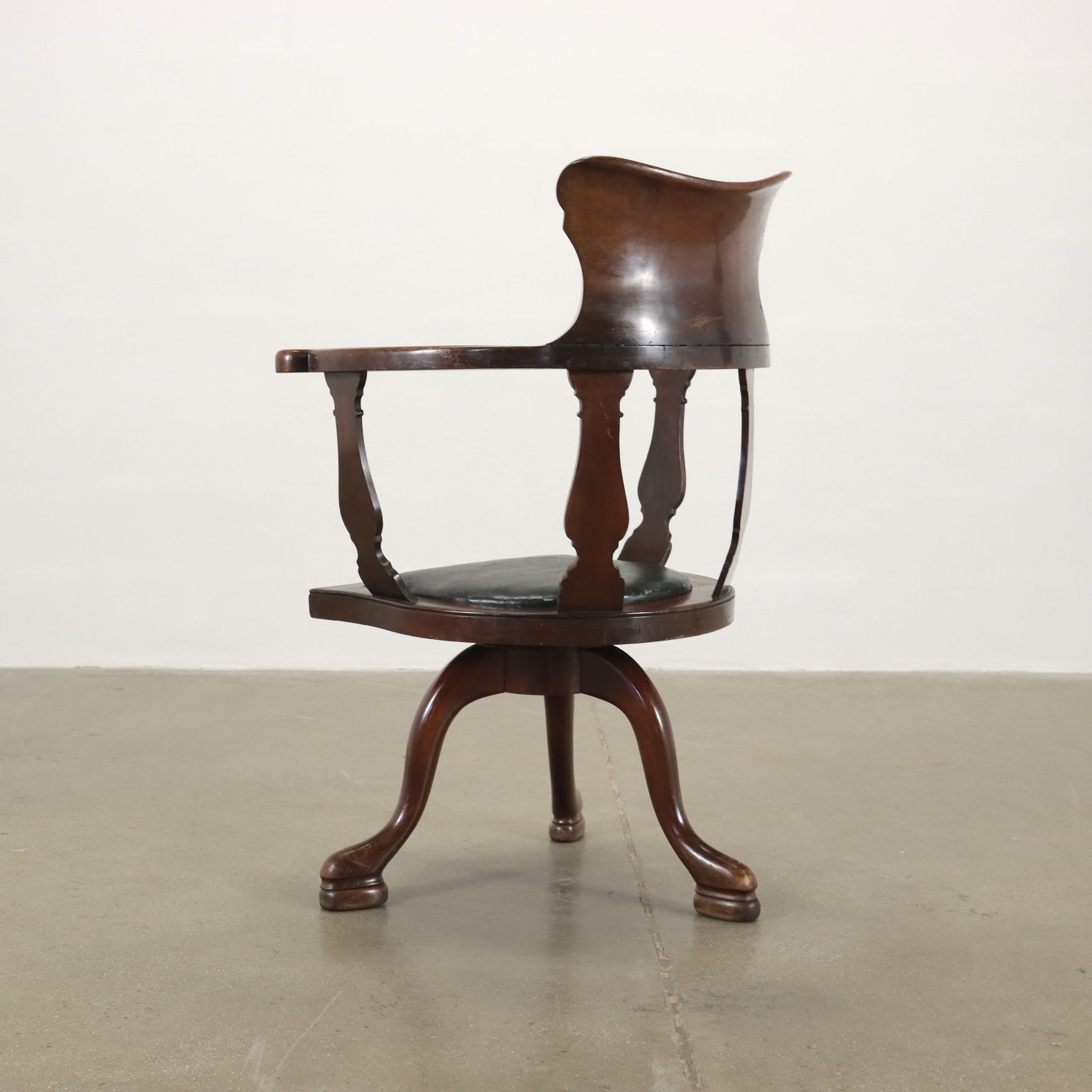 Sillón giratorio sostenido por tres patas, el asiento se engancha con un tornillo que le permite girar; el asiento está acolchado y forrado en cuero, mientras que el respaldo está abierto; caoba.