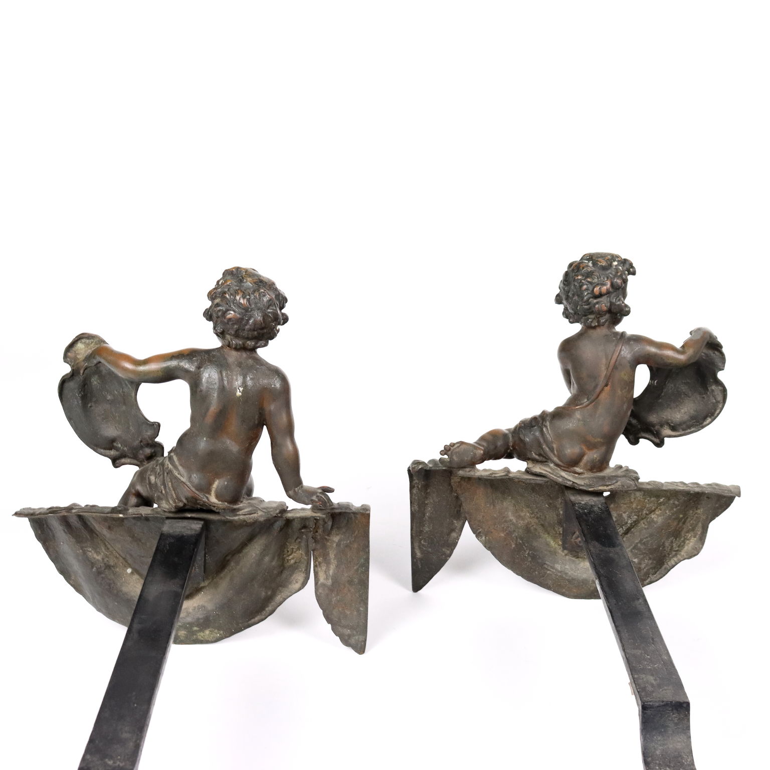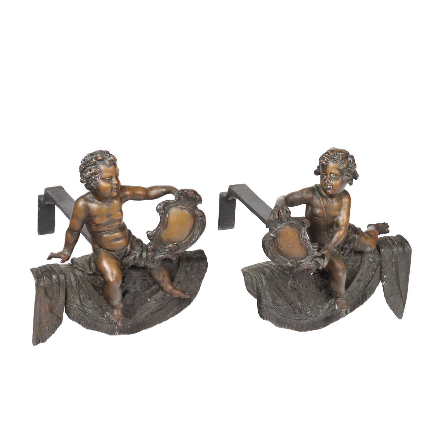 Pareja de morillos con esculturas de bronce que representan querubines sentados sobre festones.