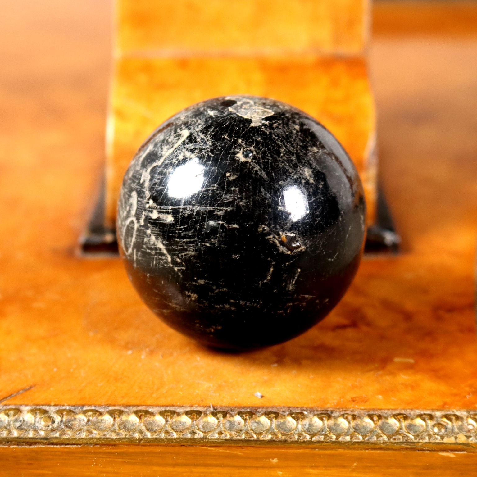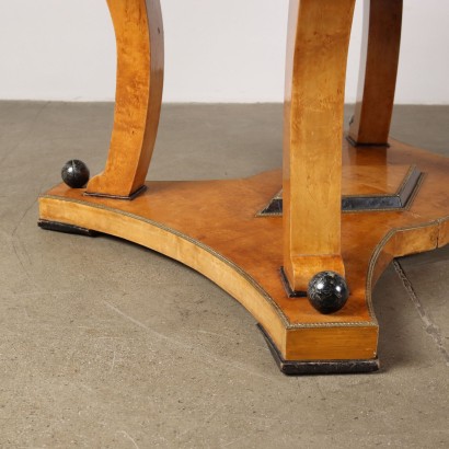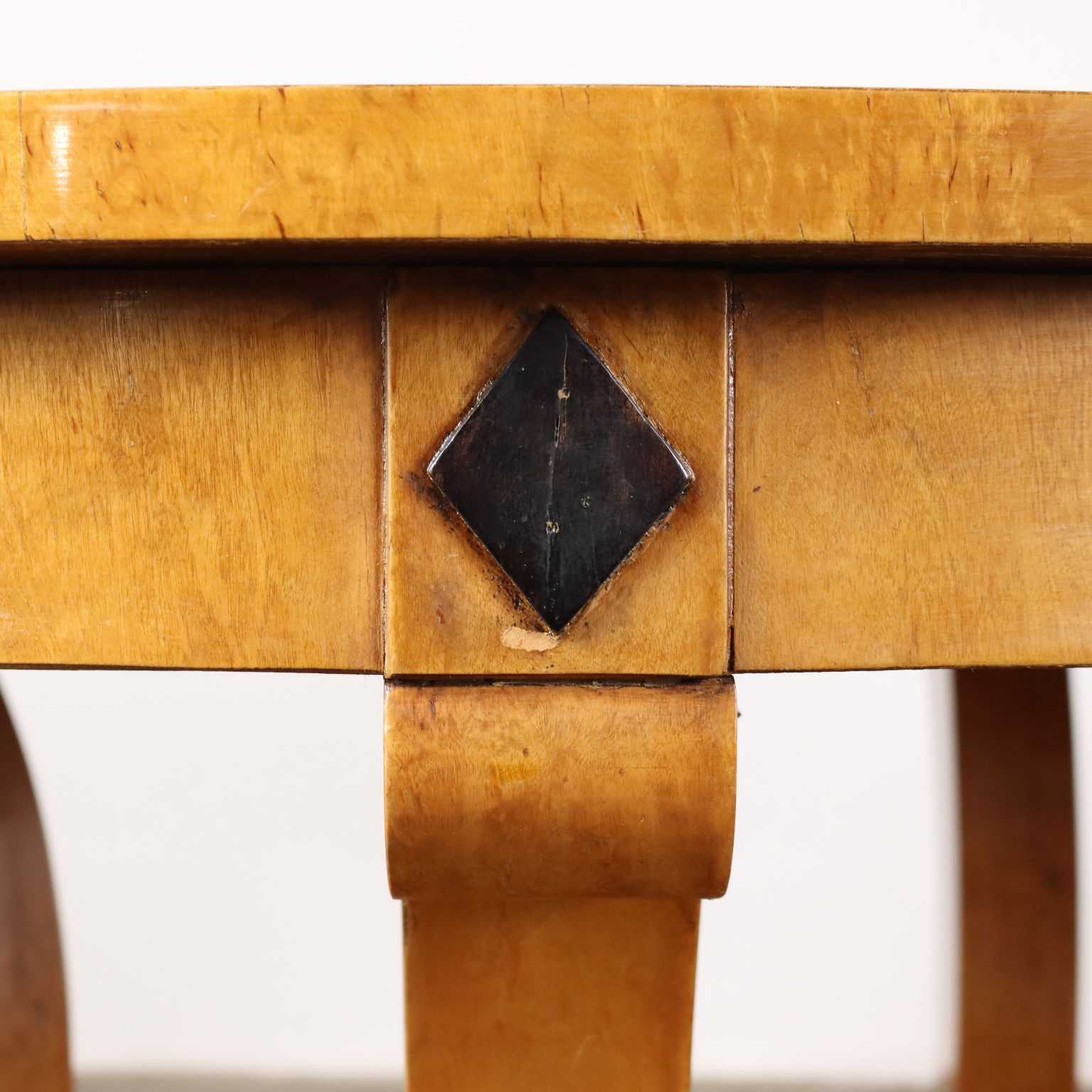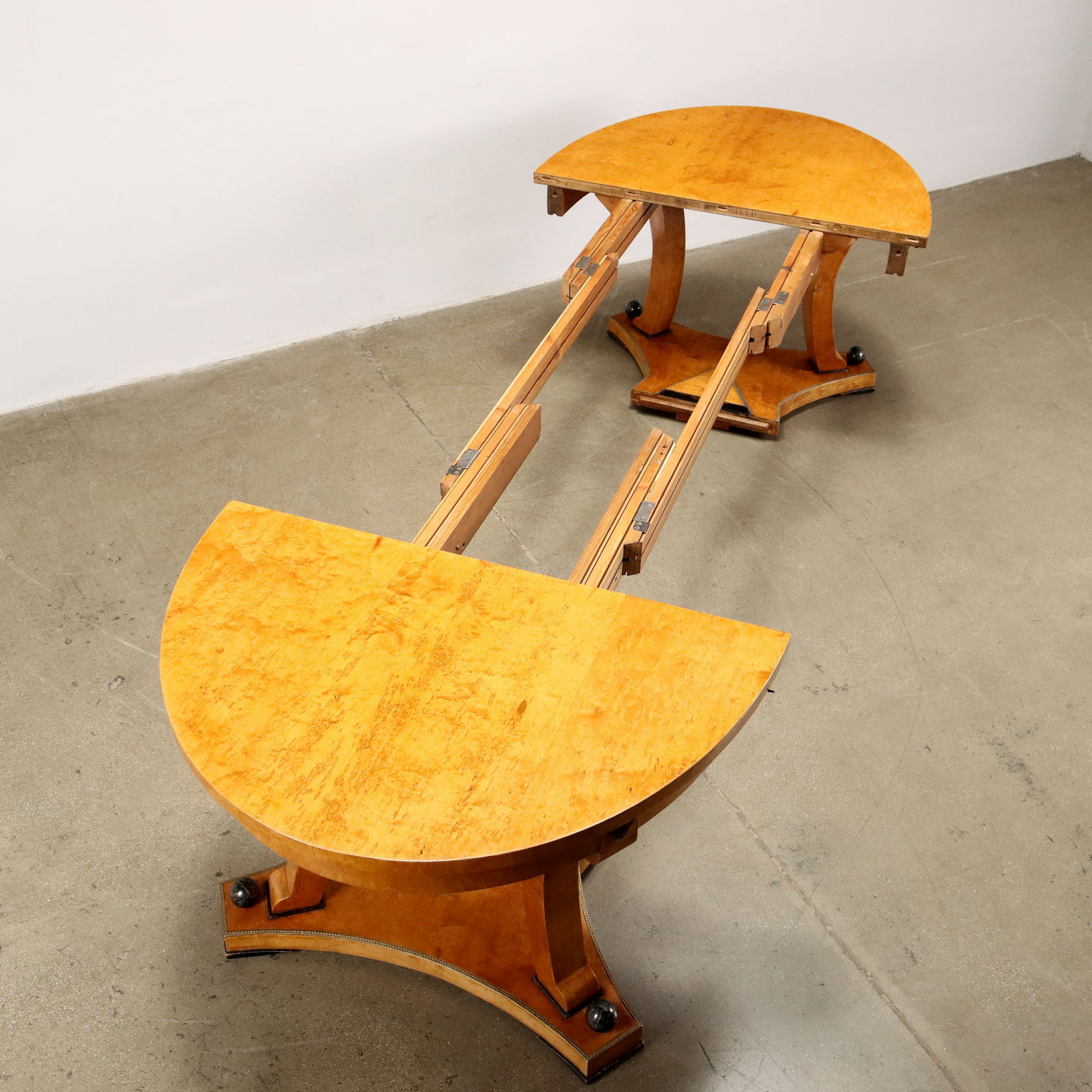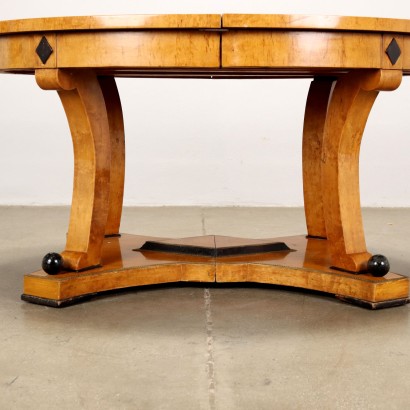 Mesa extensible estilo Biedermeier enchapada en abedul brezo, Austria, finales del siglo XIX. Tapa oval abrible, banda inferior con rombos ebonizados, patas onduladas que descansan sobre un zócalo decorado con bordes de chapa dorada, esferas ebonizadas y rombo central; parte de construcción en pino. Equipado con trío de extensiones.