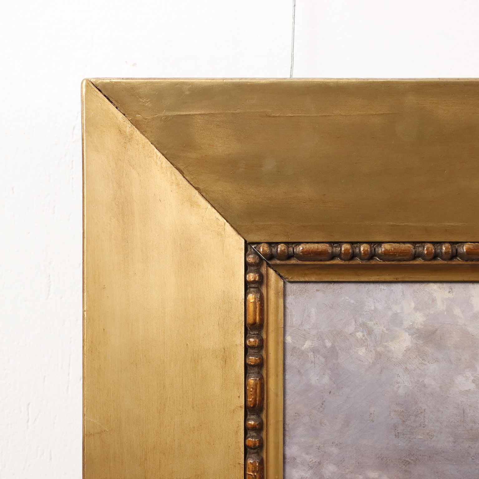 Óleo sobre lienzo. Firma y ubicación (Mandello) abajo a la izquierda. En el reverso, firma, fecha y título completos. Riccardo Pellegrini, pintor milanés, fue alumno de Domenico Morelli y se formó en el clima del Romanticismo. Fue paisajista y pintor de género, pero también realizó valiosas naturalezas muertas, de colores vivos y dibujo preciso y realista. Su producción paisajística se inspiró en los diversos lugares que visitó y vivió, en Italia y en el extranjero, especialmente en España y Francia. En este paisaje, Pellegrini representa una vista de la montaña que domina la ciudad a orillas del lago de Como: una montaña yerma y desnuda, aunque habitada, con una cabaña en la cima y una figura femenina llenando cubos en la corriente de agua que fluye entre las rocas; los colores son los de la niebla invernal, divididos casi transversalmente entre el gris azulado de la mitad superior, con nubes cargadas de lluvia que dominan las cumbres del otro lado del lago (que se vislumbran, sin verse), y el verde pardo de la tierra que ocupa la mitad inferior, con ramas de árboles desnudos que se extienden para unir las dos mitades. La quietud de las montañas, título de la obra, bien transpira e impregna el alma del observador. El cuadro se presenta en un marco coetáneo.