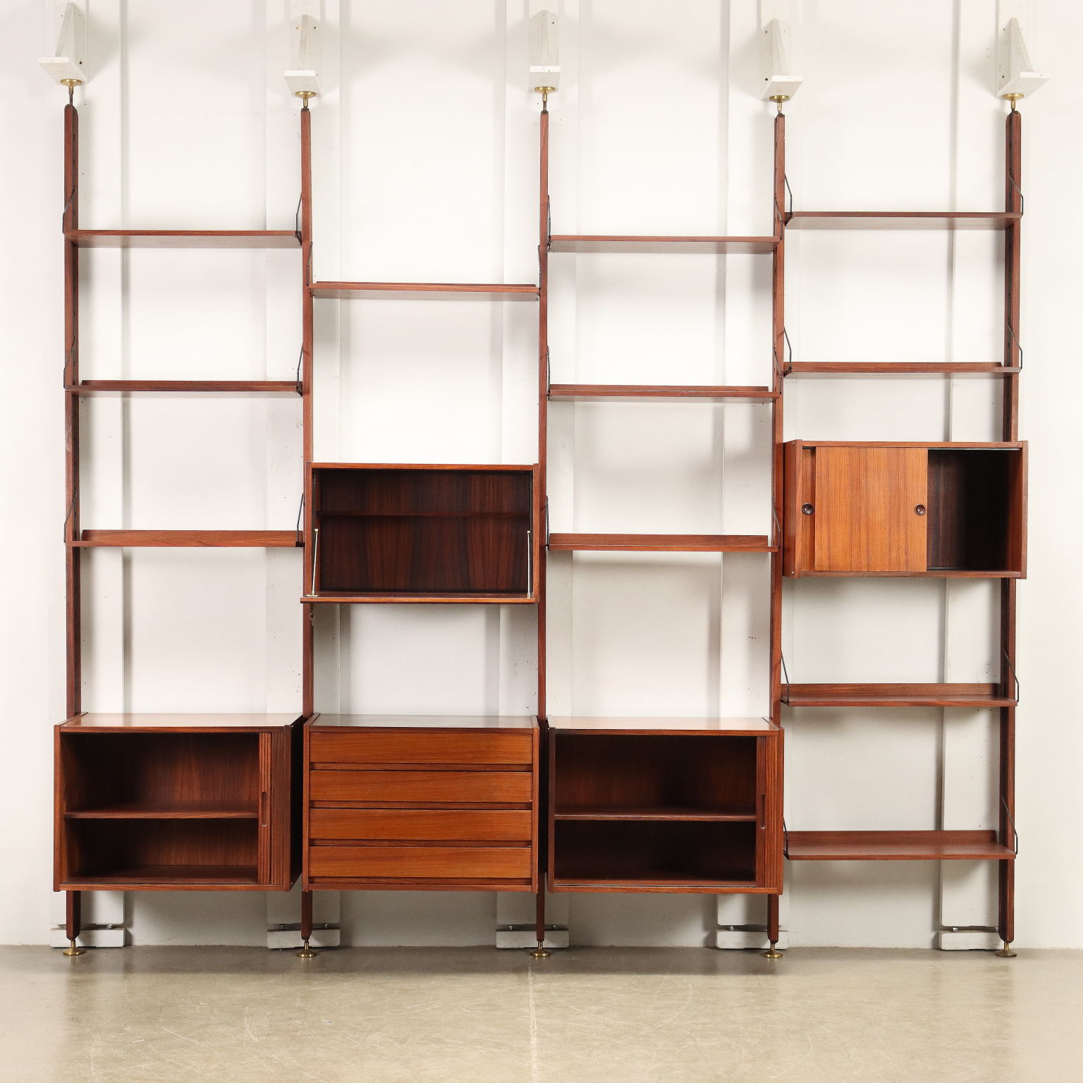 Librería de techo con elementos contenedores con solapa, batientes, puertas correderas y baldas abiertas, todas con posiciones regulables; madera maciza, palitos de pan y chapa de caoba teñida, metal esmaltado, latón.