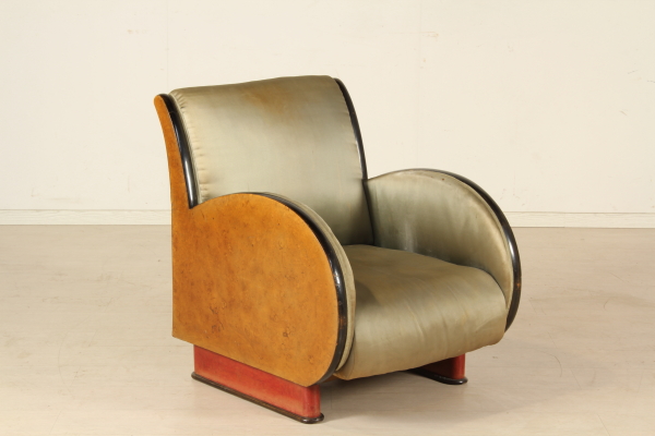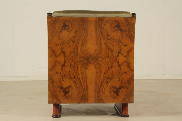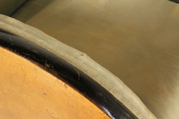 Silla de madera, relleno blando y tela de raso chapeados nogal. Feria de condición, tiene algunos signos de desgaste.