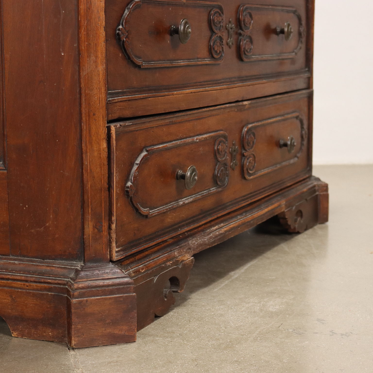 Cajonera con estructura arcaica en nogal, decorada con elementos de gusto neoclásico, Italia, finales del siglo XVIII. Frente con 4 cajones, montantes a 45°, pies de ménsula tallados. Interior de álamo.